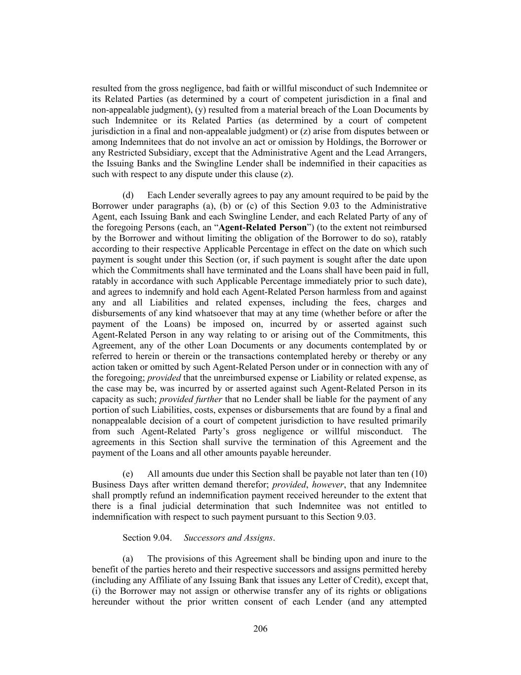 resulted from the gross negligence, bad faith or willful misconduct of such Indemnitee or its Related Parties (as determined by a court of competent jurisdiction in a final and non-appealable judgment), (y) resulted from a material breach of the Loan Documents by such Indemnitee or its Related Parties (as determined by a court of competent jurisdiction in a final and non-appealable judgment) or (z) arise from disputes between or among Indemnitees that do not involve an act or omission by Holdings, the Borrower or any Restricted Subsidiary, except that the Administrative Agent and the Lead Arrangers, the Issuing Banks and the Swingline Lender shall be indemnified in their capacities as such with respect to any dispute under this clause (z). (d) Each Lender severally agrees to pay any amount required to be paid by the Borrower under paragraphs (a), (b) or (c) of this Section 9.03 to the Administrative Agent, each Issuing Bank and each Swingline Lender, and each Related Party of any of the foregoing Persons (each, an “Agent-Related Person”) (to the extent not reimbursed by the Borrower and without limiting the obligation of the Borrower to do so), ratably according to their respective Applicable Percentage in effect on the date on which such payment is sought under this Section (or, if such payment is sought after the date upon which the Commitments shall have terminated and the Loans shall have been paid in full, ratably in accordance with such Applicable Percentage immediately prior to such date), and agrees to indemnify and hold each Agent-Related Person harmless from and against any and all Liabilities and related expenses, including the fees, charges and disbursements of any kind whatsoever that may at any time (whether before or after the payment of the Loans) be imposed on, incurred by or asserted against such Agent-Related Person in any way relating to or arising out of the Commitments, this Agreement, any of the other Loan Documents or any documents contemplated by or referred to herein or therein or the transactions contemplated hereby or thereby or any action taken or omitted by such Agent-Related Person under or in connection with any of the foregoing; provided that the unreimbursed expense or Liability or related expense, as the case may be, was incurred by or asserted against such Agent-Related Person in its capacity as such; provided further that no Lender shall be liable for the payment of any portion of such Liabilities, costs, expenses or disbursements that are found by a final and nonappealable decision of a court of competent jurisdiction to have resulted primarily from such Agent-Related Party’s gross negligence or willful misconduct. The agreements in this Section shall survive the termination of this Agreement and the payment of the Loans and all other amounts payable hereunder. (e) All amounts due under this Section shall be payable not later than ten (10) Business Days after written demand therefor; provided, however, that any Indemnitee shall promptly refund an indemnification payment received hereunder to the extent that there is a final judicial determination that such Indemnitee was not entitled to indemnification with respect to such payment pursuant to this Section 9.03. Section 9.04. Successors and Assigns. (a) The provisions of this Agreement shall be binding upon and inure to the benefit of the parties hereto and their respective successors and assigns permitted hereby (including any Affiliate of any Issuing Bank that issues any Letter of Credit), except that, (i) the Borrower may not assign or otherwise transfer any of its rights or obligations hereunder without the prior written consent of each Lender (and any attempted 206