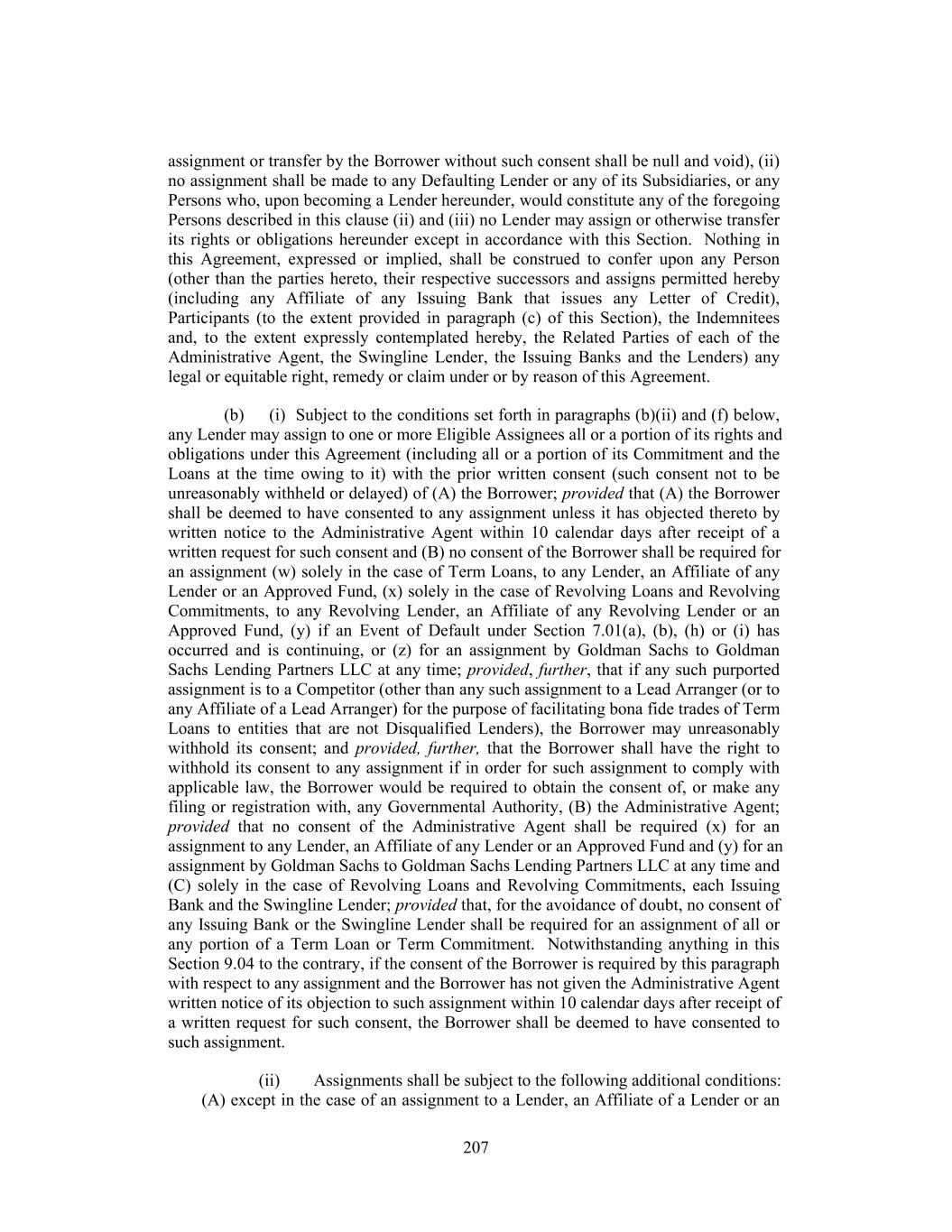assignment or transfer by the Borrower without such consent shall be null and void), (ii) no assignment shall be made to any Defaulting Lender or any of its Subsidiaries, or any Persons who, upon becoming a Lender hereunder, would constitute any of the foregoing Persons described in this clause (ii) and (iii) no Lender may assign or otherwise transfer its rights or obligations hereunder except in accordance with this Section. Nothing in this Agreement, expressed or implied, shall be construed to confer upon any Person (other than the parties hereto, their respective successors and assigns permitted hereby (including any Affiliate of any Issuing Bank that issues any Letter of Credit), Participants (to the extent provided in paragraph (c) of this Section), the Indemnitees and, to the extent expressly contemplated hereby, the Related Parties of each of the Administrative Agent, the Swingline Lender, the Issuing Banks and the Lenders) any legal or equitable right, remedy or claim under or by reason of this Agreement. (b) (i) Subject to the conditions set forth in paragraphs (b)(ii) and (f) below, any Lender may assign to one or more Eligible Assignees all or a portion of its rights and obligations under this Agreement (including all or a portion of its Commitment and the Loans at the time owing to it) with the prior written consent (such consent not to be unreasonably withheld or delayed) of (A) the Borrower; provided that (A) the Borrower shall be deemed to have consented to any assignment unless it has objected thereto by written notice to the Administrative Agent within 10 calendar days after receipt of a written request for such consent and (B) no consent of the Borrower shall be required for an assignment (w) solely in the case of Term Loans, to any Lender, an Affiliate of any Lender or an Approved Fund, (x) solely in the case of Revolving Loans and Revolving Commitments, to any Revolving Lender, an Affiliate of any Revolving Lender or an Approved Fund, (y) if an Event of Default under Section 7.01(a), (b), (h) or (i) has occurred and is continuing, or (z) for an assignment by Goldman Sachs to Goldman Sachs Lending Partners LLC at any time; provided, further, that if any such purported assignment is to a Competitor (other than any such assignment to a Lead Arranger (or to any Affiliate of a Lead Arranger) for the purpose of facilitating bona fide trades of Term Loans to entities that are not Disqualified Lenders), the Borrower may unreasonably withhold its consent; and provided, further, that the Borrower shall have the right to withhold its consent to any assignment if in order for such assignment to comply with applicable law, the Borrower would be required to obtain the consent of, or make any filing or registration with, any Governmental Authority, (B) the Administrative Agent; provided that no consent of the Administrative Agent shall be required (x) for an assignment to any Lender, an Affiliate of any Lender or an Approved Fund and (y) for an assignment by Goldman Sachs to Goldman Sachs Lending Partners LLC at any time and (C) solely in the case of Revolving Loans and Revolving Commitments, each Issuing Bank and the Swingline Lender; provided that, for the avoidance of doubt, no consent of any Issuing Bank or the Swingline Lender shall be required for an assignment of all or any portion of a Term Loan or Term Commitment. Notwithstanding anything in this Section 9.04 to the contrary, if the consent of the Borrower is required by this paragraph with respect to any assignment and the Borrower has not given the Administrative Agent written notice of its objection to such assignment within 10 calendar days after receipt of a written request for such consent, the Borrower shall be deemed to have consented to such assignment. (ii) Assignments shall be subject to the following additional conditions: (A) except in the case of an assignment to a Lender, an Affiliate of a Lender or an 207