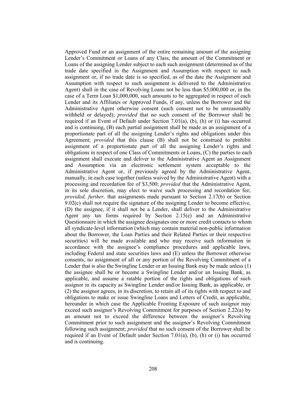 Approved Fund or an assignment of the entire remaining amount of the assigning Lender’s Commitment or Loans of any Class, the amount of the Commitment or Loans of the assigning Lender subject to each such assignment (determined as of the trade date specified in the Assignment and Assumption with respect to such assignment or, if no trade date is so specified, as of the date the Assignment and Assumption with respect to such assignment is delivered to the Administrative Agent) shall in the case of Revolving Loans not be less than $5,000,000 or, in the case of a Term Loan $1,000,000, such amounts to be aggregated in respect of each Lender and its Affiliates or Approved Funds, if any, unless the Borrower and the Administrative Agent otherwise consent (such consent not to be unreasonably withheld or delayed); provided that no such consent of the Borrower shall be required if an Event of Default under Section 7.01(a), (b), (h) or (i) has occurred and is continuing, (B) each partial assignment shall be made as an assignment of a proportionate part of all the assigning Lender’s rights and obligations under this Agreement; provided that this clause (B) shall not be construed to prohibit assignment of a proportionate part of all the assigning Lender’s rights and obligations in respect of one Class of Commitments or Loans, (C) the parties to each assignment shall execute and deliver to the Administrative Agent an Assignment and Assumption via an electronic settlement system acceptable to the Administrative Agent or, if previously agreed by the Administrative Agent, manually, in each case together (unless waived by the Administrative Agent) with a processing and recordation fee of $3,500; provided that the Administrative Agent, in its sole discretion, may elect to waive such processing and recordation fee; provided, further, that assignments made pursuant to Section 2.17(b) or Section 9.02(c) shall not require the signature of the assigning Lender to become effective, (D) the assignee, if it shall not be a Lender, shall deliver to the Administrative Agent any tax forms required by Section 2.15(e) and an Administrative Questionnaire in which the assignee designates one or more credit contacts to whom all syndicate-level information (which may contain material non-public information about the Borrower, the Loan Parties and their Related Parties or their respective securities) will be made available and who may receive such information in accordance with the assignee’s compliance procedures and applicable laws, including Federal and state securities laws and (E) unless the Borrower otherwise consents, no assignment of all or any portion of the Revolving Commitment of a Lender that is also the Swingline Lender or an Issuing Bank may be made unless (1) the assignee shall be or become a Swingline Lender and/or an Issuing Bank, as applicable, and assume a ratable portion of the rights and obligations of such assignor in its capacity as Swingline Lender and/or Issuing Bank, as applicable, or (2) the assignor agrees, in its discretion, to retain all of its rights with respect to and obligations to make or issue Swingline Loans and Letters of Credit, as applicable, hereunder in which case the Applicable Fronting Exposure of such assignor may exceed such assignor’s Revolving Commitment for purposes of Section 2.22(a) by an amount not to exceed the difference between the assignor’s Revolving Commitment prior to such assignment and the assignor’s Revolving Commitment following such assignment; provided that no such consent of the Borrower shall be required if an Event of Default under Section 7.01(a), (b), (h) or (i) has occurred and is continuing. 208