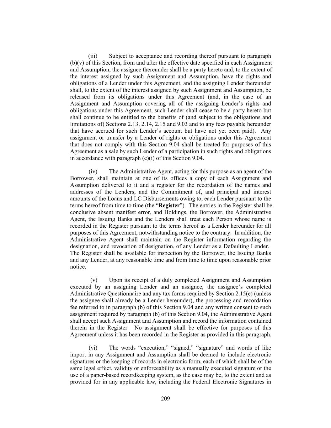 (iii) Subject to acceptance and recording thereof pursuant to paragraph (b)(v) of this Section, from and after the effective date specified in each Assignment and Assumption, the assignee thereunder shall be a party hereto and, to the extent of the interest assigned by such Assignment and Assumption, have the rights and obligations of a Lender under this Agreement, and the assigning Lender thereunder shall, to the extent of the interest assigned by such Assignment and Assumption, be released from its obligations under this Agreement (and, in the case of an Assignment and Assumption covering all of the assigning Lender’s rights and obligations under this Agreement, such Lender shall cease to be a party hereto but shall continue to be entitled to the benefits of (and subject to the obligations and limitations of) Sections 2.13, 2.14, 2.15 and 9.03 and to any fees payable hereunder that have accrued for such Lender’s account but have not yet been paid). Any assignment or transfer by a Lender of rights or obligations under this Agreement that does not comply with this Section 9.04 shall be treated for purposes of this Agreement as a sale by such Lender of a participation in such rights and obligations in accordance with paragraph (c)(i) of this Section 9.04. (iv) The Administrative Agent, acting for this purpose as an agent of the Borrower, shall maintain at one of its offices a copy of each Assignment and Assumption delivered to it and a register for the recordation of the names and addresses of the Lenders, and the Commitment of, and principal and interest amounts of the Loans and LC Disbursements owing to, each Lender pursuant to the terms hereof from time to time (the “Register”). The entries in the Register shall be conclusive absent manifest error, and Holdings, the Borrower, the Administrative Agent, the Issuing Banks and the Lenders shall treat each Person whose name is recorded in the Register pursuant to the terms hereof as a Lender hereunder for all purposes of this Agreement, notwithstanding notice to the contrary. In addition, the Administrative Agent shall maintain on the Register information regarding the designation, and revocation of designation, of any Lender as a Defaulting Lender. The Register shall be available for inspection by the Borrower, the Issuing Banks and any Lender, at any reasonable time and from time to time upon reasonable prior notice. (v) Upon its receipt of a duly completed Assignment and Assumption executed by an assigning Lender and an assignee, the assignee’s completed Administrative Questionnaire and any tax forms required by Section 2.15(e) (unless the assignee shall already be a Lender hereunder), the processing and recordation fee referred to in paragraph (b) of this Section 9.04 and any written consent to such assignment required by paragraph (b) of this Section 9.04, the Administrative Agent shall accept such Assignment and Assumption and record the information contained therein in the Register. No assignment shall be effective for purposes of this Agreement unless it has been recorded in the Register as provided in this paragraph. (vi) The words “execution,” “signed,” “signature” and words of like import in any Assignment and Assumption shall be deemed to include electronic signatures or the keeping of records in electronic form, each of which shall be of the same legal effect, validity or enforceability as a manually executed signature or the use of a paper-based recordkeeping system, as the case may be, to the extent and as provided for in any applicable law, including the Federal Electronic Signatures in 209