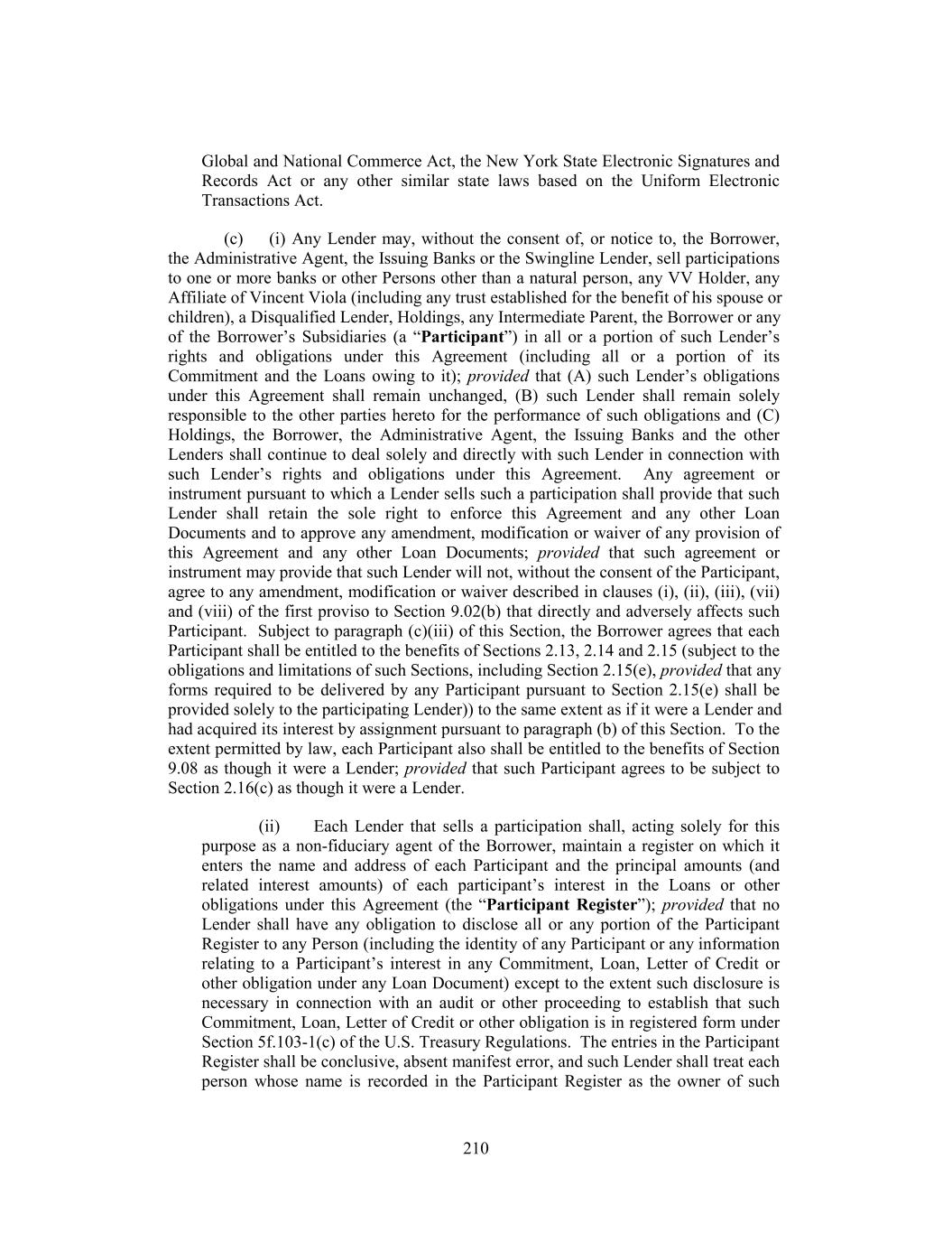 Global and National Commerce Act, the New York State Electronic Signatures and Records Act or any other similar state laws based on the Uniform Electronic Transactions Act. (c) (i) Any Lender may, without the consent of, or notice to, the Borrower, the Administrative Agent, the Issuing Banks or the Swingline Lender, sell participations to one or more banks or other Persons other than a natural person, any VV Holder, any Affiliate of Vincent Viola (including any trust established for the benefit of his spouse or children), a Disqualified Lender, Holdings, any Intermediate Parent, the Borrower or any of the Borrower’s Subsidiaries (a “Participant”) in all or a portion of such Lender’s rights and obligations under this Agreement (including all or a portion of its Commitment and the Loans owing to it); provided that (A) such Lender’s obligations under this Agreement shall remain unchanged, (B) such Lender shall remain solely responsible to the other parties hereto for the performance of such obligations and (C) Holdings, the Borrower, the Administrative Agent, the Issuing Banks and the other Lenders shall continue to deal solely and directly with such Lender in connection with such Lender’s rights and obligations under this Agreement. Any agreement or instrument pursuant to which a Lender sells such a participation shall provide that such Lender shall retain the sole right to enforce this Agreement and any other Loan Documents and to approve any amendment, modification or waiver of any provision of this Agreement and any other Loan Documents; provided that such agreement or instrument may provide that such Lender will not, without the consent of the Participant, agree to any amendment, modification or waiver described in clauses (i), (ii), (iii), (vii) and (viii) of the first proviso to Section 9.02(b) that directly and adversely affects such Participant. Subject to paragraph (c)(iii) of this Section, the Borrower agrees that each Participant shall be entitled to the benefits of Sections 2.13, 2.14 and 2.15 (subject to the obligations and limitations of such Sections, including Section 2.15(e), provided that any forms required to be delivered by any Participant pursuant to Section 2.15(e) shall be provided solely to the participating Lender)) to the same extent as if it were a Lender and had acquired its interest by assignment pursuant to paragraph (b) of this Section. To the extent permitted by law, each Participant also shall be entitled to the benefits of Section 9.08 as though it were a Lender; provided that such Participant agrees to be subject to Section 2.16(c) as though it were a Lender. (ii) Each Lender that sells a participation shall, acting solely for this purpose as a non-fiduciary agent of the Borrower, maintain a register on which it enters the name and address of each Participant and the principal amounts (and related interest amounts) of each participant’s interest in the Loans or other obligations under this Agreement (the “Participant Register”); provided that no Lender shall have any obligation to disclose all or any portion of the Participant Register to any Person (including the identity of any Participant or any information relating to a Participant’s interest in any Commitment, Loan, Letter of Credit or other obligation under any Loan Document) except to the extent such disclosure is necessary in connection with an audit or other proceeding to establish that such Commitment, Loan, Letter of Credit or other obligation is in registered form under Section 5f.103-1(c) of the U.S. Treasury Regulations. The entries in the Participant Register shall be conclusive, absent manifest error, and such Lender shall treat each person whose name is recorded in the Participant Register as the owner of such 210