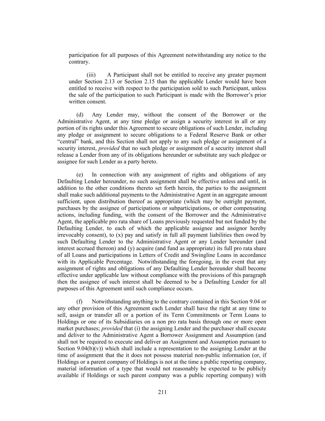 participation for all purposes of this Agreement notwithstanding any notice to the contrary. (iii) A Participant shall not be entitled to receive any greater payment under Section 2.13 or Section 2.15 than the applicable Lender would have been entitled to receive with respect to the participation sold to such Participant, unless the sale of the participation to such Participant is made with the Borrower’s prior written consent. (d) Any Lender may, without the consent of the Borrower or the Administrative Agent, at any time pledge or assign a security interest in all or any portion of its rights under this Agreement to secure obligations of such Lender, including any pledge or assignment to secure obligations to a Federal Reserve Bank or other “central” bank, and this Section shall not apply to any such pledge or assignment of a security interest, provided that no such pledge or assignment of a security interest shall release a Lender from any of its obligations hereunder or substitute any such pledgee or assignee for such Lender as a party hereto. (e) In connection with any assignment of rights and obligations of any Defaulting Lender hereunder, no such assignment shall be effective unless and until, in addition to the other conditions thereto set forth herein, the parties to the assignment shall make such additional payments to the Administrative Agent in an aggregate amount sufficient, upon distribution thereof as appropriate (which may be outright payment, purchases by the assignee of participations or subparticipations, or other compensating actions, including funding, with the consent of the Borrower and the Administrative Agent, the applicable pro rata share of Loans previously requested but not funded by the Defaulting Lender, to each of which the applicable assignee and assignor hereby irrevocably consent), to (x) pay and satisfy in full all payment liabilities then owed by such Defaulting Lender to the Administrative Agent or any Lender hereunder (and interest accrued thereon) and (y) acquire (and fund as appropriate) its full pro rata share of all Loans and participations in Letters of Credit and Swingline Loans in accordance with its Applicable Percentage. Notwithstanding the foregoing, in the event that any assignment of rights and obligations of any Defaulting Lender hereunder shall become effective under applicable law without compliance with the provisions of this paragraph then the assignee of such interest shall be deemed to be a Defaulting Lender for all purposes of this Agreement until such compliance occurs. (f) Notwithstanding anything to the contrary contained in this Section 9.04 or any other provision of this Agreement each Lender shall have the right at any time to sell, assign or transfer all or a portion of its Term Commitments or Term Loans to Holdings or one of its Subsidiaries on a non pro rata basis through one or more open market purchases; provided that (i) the assigning Lender and the purchaser shall execute and deliver to the Administrative Agent a Borrower Assignment and Assumption (and shall not be required to execute and deliver an Assignment and Assumption pursuant to Section 9.04(b)(v)) which shall include a representation to the assigning Lender at the time of assignment that the it does not possess material non-public information (or, if Holdings or a parent company of Holdings is not at the time a public reporting company, material information of a type that would not reasonably be expected to be publicly available if Holdings or such parent company was a public reporting company) with 211