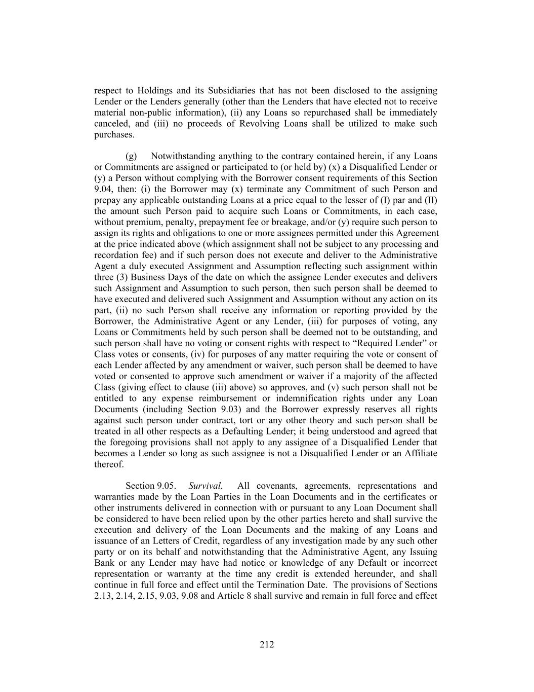 respect to Holdings and its Subsidiaries that has not been disclosed to the assigning Lender or the Lenders generally (other than the Lenders that have elected not to receive material non-public information), (ii) any Loans so repurchased shall be immediately canceled, and (iii) no proceeds of Revolving Loans shall be utilized to make such purchases. (g) Notwithstanding anything to the contrary contained herein, if any Loans or Commitments are assigned or participated to (or held by) (x) a Disqualified Lender or (y) a Person without complying with the Borrower consent requirements of this Section 9.04, then: (i) the Borrower may (x) terminate any Commitment of such Person and prepay any applicable outstanding Loans at a price equal to the lesser of (I) par and (II) the amount such Person paid to acquire such Loans or Commitments, in each case, without premium, penalty, prepayment fee or breakage, and/or (y) require such person to assign its rights and obligations to one or more assignees permitted under this Agreement at the price indicated above (which assignment shall not be subject to any processing and recordation fee) and if such person does not execute and deliver to the Administrative Agent a duly executed Assignment and Assumption reflecting such assignment within three (3) Business Days of the date on which the assignee Lender executes and delivers such Assignment and Assumption to such person, then such person shall be deemed to have executed and delivered such Assignment and Assumption without any action on its part, (ii) no such Person shall receive any information or reporting provided by the Borrower, the Administrative Agent or any Lender, (iii) for purposes of voting, any Loans or Commitments held by such person shall be deemed not to be outstanding, and such person shall have no voting or consent rights with respect to “Required Lender” or Class votes or consents, (iv) for purposes of any matter requiring the vote or consent of each Lender affected by any amendment or waiver, such person shall be deemed to have voted or consented to approve such amendment or waiver if a majority of the affected Class (giving effect to clause (iii) above) so approves, and (v) such person shall not be entitled to any expense reimbursement or indemnification rights under any Loan Documents (including Section 9.03) and the Borrower expressly reserves all rights against such person under contract, tort or any other theory and such person shall be treated in all other respects as a Defaulting Lender; it being understood and agreed that the foregoing provisions shall not apply to any assignee of a Disqualified Lender that becomes a Lender so long as such assignee is not a Disqualified Lender or an Affiliate thereof. Section 9.05. Survival. All covenants, agreements, representations and warranties made by the Loan Parties in the Loan Documents and in the certificates or other instruments delivered in connection with or pursuant to any Loan Document shall be considered to have been relied upon by the other parties hereto and shall survive the execution and delivery of the Loan Documents and the making of any Loans and issuance of an Letters of Credit, regardless of any investigation made by any such other party or on its behalf and notwithstanding that the Administrative Agent, any Issuing Bank or any Lender may have had notice or knowledge of any Default or incorrect representation or warranty at the time any credit is extended hereunder, and shall continue in full force and effect until the Termination Date. The provisions of Sections 2.13, 2.14, 2.15, 9.03, 9.08 and Article 8 shall survive and remain in full force and effect 212