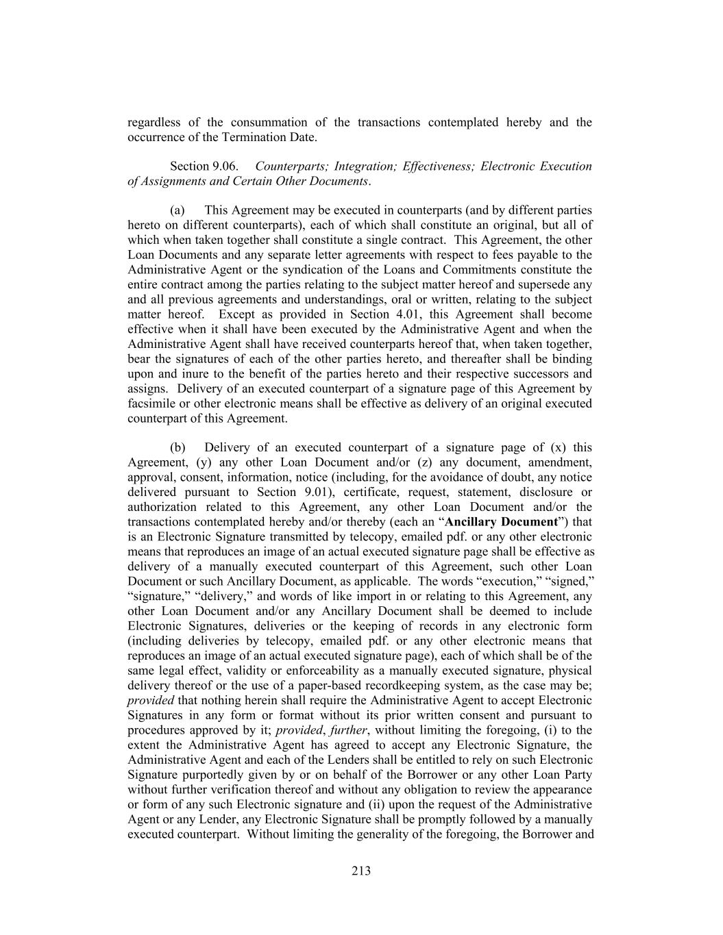 regardless of the consummation of the transactions contemplated hereby and the occurrence of the Termination Date. Section 9.06. Counterparts; Integration; Effectiveness; Electronic Execution of Assignments and Certain Other Documents. (a) This Agreement may be executed in counterparts (and by different parties hereto on different counterparts), each of which shall constitute an original, but all of which when taken together shall constitute a single contract. This Agreement, the other Loan Documents and any separate letter agreements with respect to fees payable to the Administrative Agent or the syndication of the Loans and Commitments constitute the entire contract among the parties relating to the subject matter hereof and supersede any and all previous agreements and understandings, oral or written, relating to the subject matter hereof. Except as provided in Section 4.01, this Agreement shall become effective when it shall have been executed by the Administrative Agent and when the Administrative Agent shall have received counterparts hereof that, when taken together, bear the signatures of each of the other parties hereto, and thereafter shall be binding upon and inure to the benefit of the parties hereto and their respective successors and assigns. Delivery of an executed counterpart of a signature page of this Agreement by facsimile or other electronic means shall be effective as delivery of an original executed counterpart of this Agreement. (b) Delivery of an executed counterpart of a signature page of (x) this Agreement, (y) any other Loan Document and/or (z) any document, amendment, approval, consent, information, notice (including, for the avoidance of doubt, any notice delivered pursuant to Section 9.01), certificate, request, statement, disclosure or authorization related to this Agreement, any other Loan Document and/or the transactions contemplated hereby and/or thereby (each an “Ancillary Document”) that is an Electronic Signature transmitted by telecopy, emailed pdf. or any other electronic means that reproduces an image of an actual executed signature page shall be effective as delivery of a manually executed counterpart of this Agreement, such other Loan Document or such Ancillary Document, as applicable. The words “execution,” “signed,” “signature,” “delivery,” and words of like import in or relating to this Agreement, any other Loan Document and/or any Ancillary Document shall be deemed to include Electronic Signatures, deliveries or the keeping of records in any electronic form (including deliveries by telecopy, emailed pdf. or any other electronic means that reproduces an image of an actual executed signature page), each of which shall be of the same legal effect, validity or enforceability as a manually executed signature, physical delivery thereof or the use of a paper-based recordkeeping system, as the case may be; provided that nothing herein shall require the Administrative Agent to accept Electronic Signatures in any form or format without its prior written consent and pursuant to procedures approved by it; provided, further, without limiting the foregoing, (i) to the extent the Administrative Agent has agreed to accept any Electronic Signature, the Administrative Agent and each of the Lenders shall be entitled to rely on such Electronic Signature purportedly given by or on behalf of the Borrower or any other Loan Party without further verification thereof and without any obligation to review the appearance or form of any such Electronic signature and (ii) upon the request of the Administrative Agent or any Lender, any Electronic Signature shall be promptly followed by a manually executed counterpart. Without limiting the generality of the foregoing, the Borrower and 213