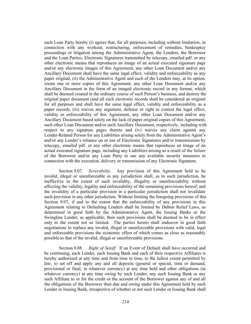each Loan Party hereby (i) agrees that, for all purposes, including without limitation, in connection with any workout, restructuring, enforcement of remedies, bankruptcy proceedings or litigation among the Administrative Agent, the Lenders, the Borrower and the Loan Parties, Electronic Signatures transmitted by telecopy, emailed pdf. or any other electronic means that reproduces an image of an actual executed signature page and/or any electronic images of this Agreement, any other Loan Document and/or any Ancillary Document shall have the same legal effect, validity and enforceability as any paper original, (ii) the Administrative Agent and each of the Lenders may, at its option, create one or more copies of this Agreement, any other Loan Document and/or any Ancillary Document in the form of an imaged electronic record in any format, which shall be deemed created in the ordinary course of such Person’s business, and destroy the original paper document (and all such electronic records shall be considered an original for all purposes and shall have the same legal effect, validity and enforceability as a paper record), (iii) waives any argument, defense or right to contest the legal effect, validity or enforceability of this Agreement, any other Loan Document and/or any Ancillary Document based solely on the lack of paper original copies of this Agreement, such other Loan Document and/or such Ancillary Document, respectively, including with respect to any signature pages thereto and (iv) waives any claim against any Lender-Related Person for any Liabilities arising solely from the Administrative Agent’s and/or any Lender’s reliance on or use of Electronic Signatures and/or transmissions by telecopy, emailed pdf. or any other electronic means that reproduces an image of an actual executed signature page, including any Liabilities arising as a result of the failure of the Borrower and/or any Loan Party to use any available security measures in connection with the execution, delivery or transmission of any Electronic Signature. Section 9.07. Severability. Any provision of this Agreement held to be invalid, illegal or unenforceable in any jurisdiction shall, as to such jurisdiction, be ineffective to the extent of such invalidity, illegality or unenforceability without affecting the validity, legality and enforceability of the remaining provisions hereof; and the invalidity of a particular provision in a particular jurisdiction shall not invalidate such provision in any other jurisdiction. Without limiting the foregoing provisions of this Section 9.07, if and to the extent that the enforceability of any provisions in this Agreement relating to Defaulting Lenders shall be limited by Debtor Relief Laws, as determined in good faith by the Administrative Agent, the Issuing Banks or the Swingline Lender, as applicable, then such provisions shall be deemed to be in effect only to the extent not so limited. The parties hereto shall endeavor in good faith negotiations to replace any invalid, illegal or unenforceable provisions with valid, legal and enforceable provisions the economic effect of which comes as close as reasonably possible to that of the invalid, illegal or unenforceable provisions. Section 9.08. Right of Setoff. If an Event of Default shall have occurred and be continuing, each Lender, each Issuing Bank and each of their respective Affiliates is hereby authorized at any time and from time to time, to the fullest extent permitted by law, to set off and apply any and all deposits (general or special, time or demand, provisional or final, in whatever currency) at any time held and other obligations (in whatever currency) at any time owing by such Lender, any such Issuing Bank or any such Affiliate to or for the credit or the account of the Borrower against any of and all the obligations of the Borrower then due and owing under this Agreement held by such Lender or Issuing Bank, irrespective of whether or not such Lender or Issuing Bank shall 214