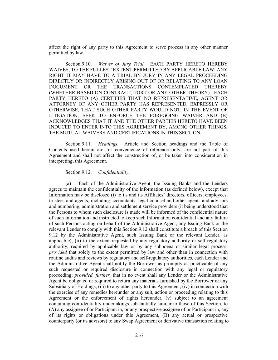 affect the right of any party to this Agreement to serve process in any other manner permitted by law. Section 9.10. Waiver of Jury Trial. EACH PARTY HERETO HEREBY WAIVES, TO THE FULLEST EXTENT PERMITTED BY APPLICABLE LAW, ANY RIGHT IT MAY HAVE TO A TRIAL BY JURY IN ANY LEGAL PROCEEDING DIRECTLY OR INDIRECTLY ARISING OUT OF OR RELATING TO ANY LOAN DOCUMENT OR THE TRANSACTIONS CONTEMPLATED THEREBY (WHETHER BASED ON CONTRACT, TORT OR ANY OTHER THEORY). EACH PARTY HERETO (A) CERTIFIES THAT NO REPRESENTATIVE, AGENT OR ATTORNEY OF ANY OTHER PARTY HAS REPRESENTED, EXPRESSLY OR OTHERWISE, THAT SUCH OTHER PARTY WOULD NOT, IN THE EVENT OF LITIGATION, SEEK TO ENFORCE THE FOREGOING WAIVER AND (B) ACKNOWLEDGES THAT IT AND THE OTHER PARTIES HERETO HAVE BEEN INDUCED TO ENTER INTO THIS AGREEMENT BY, AMONG OTHER THINGS, THE MUTUAL WAIVERS AND CERTIFICATIONS IN THIS SECTION. Section 9.11. Headings. Article and Section headings and the Table of Contents used herein are for convenience of reference only, are not part of this Agreement and shall not affect the construction of, or be taken into consideration in interpreting, this Agreement. Section 9.12. Confidentiality. (a) Each of the Administrative Agent, the Issuing Banks and the Lenders agrees to maintain the confidentiality of the Information (as defined below), except that Information may be disclosed (i) to its and its Affiliates’ directors, officers, employees, trustees and agents, including accountants, legal counsel and other agents and advisors and numbering, administration and settlement service providers (it being understood that the Persons to whom such disclosure is made will be informed of the confidential nature of such Information and instructed to keep such Information confidential and any failure of such Persons acting on behalf of the Administrative Agent, any Issuing Bank or the relevant Lender to comply with this Section 9.12 shall constitute a breach of this Section 9.12 by the Administrative Agent, such Issuing Bank or the relevant Lender, as applicable), (ii) to the extent requested by any regulatory authority or self-regulatory authority, required by applicable law or by any subpoena or similar legal process; provided that solely to the extent permitted by law and other than in connection with routine audits and reviews by regulatory and self-regulatory authorities, each Lender and the Administrative Agent shall notify the Borrower as promptly as practicable of any such requested or required disclosure in connection with any legal or regulatory proceeding; provided, further, that in no event shall any Lender or the Administrative Agent be obligated or required to return any materials furnished by the Borrower or any Subsidiary of Holdings, (iii) to any other party to this Agreement, (iv) in connection with the exercise of any remedies hereunder or any suit, action or proceeding relating to this Agreement or the enforcement of rights hereunder, (v) subject to an agreement containing confidentiality undertakings substantially similar to those of this Section, to (A) any assignee of or Participant in, or any prospective assignee of or Participant in, any of its rights or obligations under this Agreement, (B) any actual or prospective counterparty (or its advisors) to any Swap Agreement or derivative transaction relating to 216