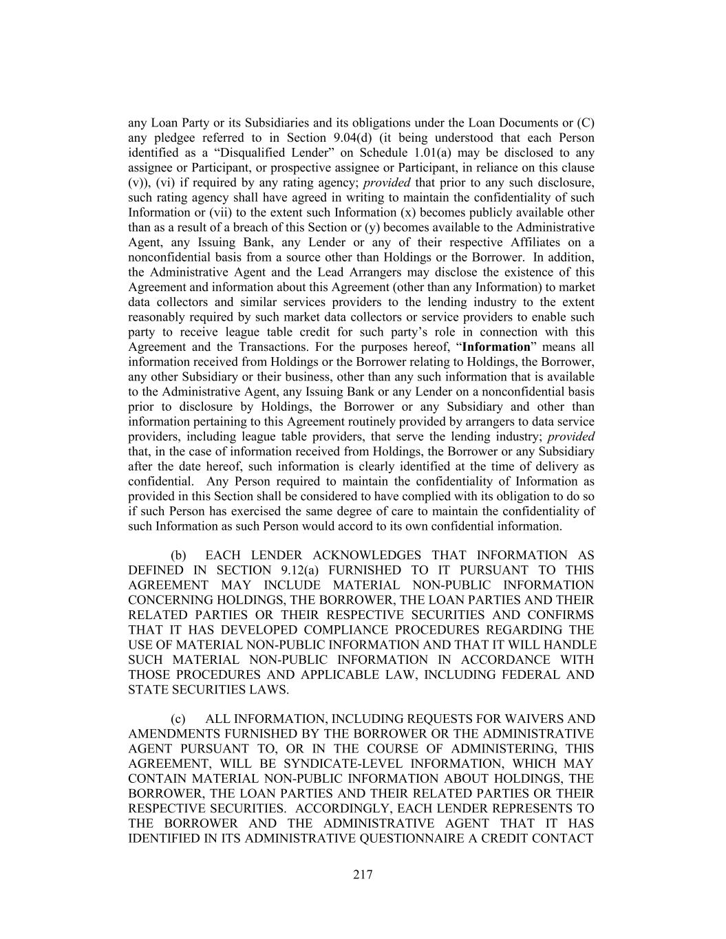 any Loan Party or its Subsidiaries and its obligations under the Loan Documents or (C) any pledgee referred to in Section 9.04(d) (it being understood that each Person identified as a “Disqualified Lender” on Schedule 1.01(a) may be disclosed to any assignee or Participant, or prospective assignee or Participant, in reliance on this clause (v)), (vi) if required by any rating agency; provided that prior to any such disclosure, such rating agency shall have agreed in writing to maintain the confidentiality of such Information or (vii) to the extent such Information (x) becomes publicly available other than as a result of a breach of this Section or (y) becomes available to the Administrative Agent, any Issuing Bank, any Lender or any of their respective Affiliates on a nonconfidential basis from a source other than Holdings or the Borrower. In addition, the Administrative Agent and the Lead Arrangers may disclose the existence of this Agreement and information about this Agreement (other than any Information) to market data collectors and similar services providers to the lending industry to the extent reasonably required by such market data collectors or service providers to enable such party to receive league table credit for such party’s role in connection with this Agreement and the Transactions. For the purposes hereof, “Information” means all information received from Holdings or the Borrower relating to Holdings, the Borrower, any other Subsidiary or their business, other than any such information that is available to the Administrative Agent, any Issuing Bank or any Lender on a nonconfidential basis prior to disclosure by Holdings, the Borrower or any Subsidiary and other than information pertaining to this Agreement routinely provided by arrangers to data service providers, including league table providers, that serve the lending industry; provided that, in the case of information received from Holdings, the Borrower or any Subsidiary after the date hereof, such information is clearly identified at the time of delivery as confidential. Any Person required to maintain the confidentiality of Information as provided in this Section shall be considered to have complied with its obligation to do so if such Person has exercised the same degree of care to maintain the confidentiality of such Information as such Person would accord to its own confidential information. (b) EACH LENDER ACKNOWLEDGES THAT INFORMATION AS DEFINED IN SECTION 9.12(a) FURNISHED TO IT PURSUANT TO THIS AGREEMENT MAY INCLUDE MATERIAL NON-PUBLIC INFORMATION CONCERNING HOLDINGS, THE BORROWER, THE LOAN PARTIES AND THEIR RELATED PARTIES OR THEIR RESPECTIVE SECURITIES AND CONFIRMS THAT IT HAS DEVELOPED COMPLIANCE PROCEDURES REGARDING THE USE OF MATERIAL NON-PUBLIC INFORMATION AND THAT IT WILL HANDLE SUCH MATERIAL NON-PUBLIC INFORMATION IN ACCORDANCE WITH THOSE PROCEDURES AND APPLICABLE LAW, INCLUDING FEDERAL AND STATE SECURITIES LAWS. (c) ALL INFORMATION, INCLUDING REQUESTS FOR WAIVERS AND AMENDMENTS FURNISHED BY THE BORROWER OR THE ADMINISTRATIVE AGENT PURSUANT TO, OR IN THE COURSE OF ADMINISTERING, THIS AGREEMENT, WILL BE SYNDICATE-LEVEL INFORMATION, WHICH MAY CONTAIN MATERIAL NON-PUBLIC INFORMATION ABOUT HOLDINGS, THE BORROWER, THE LOAN PARTIES AND THEIR RELATED PARTIES OR THEIR RESPECTIVE SECURITIES. ACCORDINGLY, EACH LENDER REPRESENTS TO THE BORROWER AND THE ADMINISTRATIVE AGENT THAT IT HAS IDENTIFIED IN ITS ADMINISTRATIVE QUESTIONNAIRE A CREDIT CONTACT 217