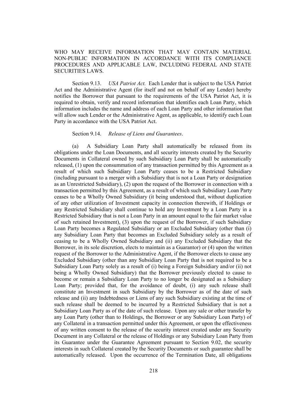 WHO MAY RECEIVE INFORMATION THAT MAY CONTAIN MATERIAL NON-PUBLIC INFORMATION IN ACCORDANCE WITH ITS COMPLIANCE PROCEDURES AND APPLICABLE LAW, INCLUDING FEDERAL AND STATE SECURITIES LAWS. Section 9.13. USA Patriot Act. Each Lender that is subject to the USA Patriot Act and the Administrative Agent (for itself and not on behalf of any Lender) hereby notifies the Borrower that pursuant to the requirements of the USA Patriot Act, it is required to obtain, verify and record information that identifies each Loan Party, which information includes the name and address of each Loan Party and other information that will allow such Lender or the Administrative Agent, as applicable, to identify each Loan Party in accordance with the USA Patriot Act. Section 9.14. Release of Liens and Guarantees. (a) A Subsidiary Loan Party shall automatically be released from its obligations under the Loan Documents, and all security interests created by the Security Documents in Collateral owned by such Subsidiary Loan Party shall be automatically released, (1) upon the consummation of any transaction permitted by this Agreement as a result of which such Subsidiary Loan Party ceases to be a Restricted Subsidiary (including pursuant to a merger with a Subsidiary that is not a Loan Party or designation as an Unrestricted Subsidiary), (2) upon the request of the Borrower in connection with a transaction permitted by this Agreement, as a result of which such Subsidiary Loan Party ceases to be a Wholly Owned Subsidiary (it being understood that, without duplication of any other utilization of Investment capacity in connection therewith, if Holdings or any Restricted Subsidiary shall continue to hold any Investment by a Loan Party in a Restricted Subsidiary that is not a Loan Party in an amount equal to the fair market value of such retained Investment), (3) upon the request of the Borrower, if such Subsidiary Loan Party becomes a Regulated Subsidiary or an Excluded Subsidiary (other than (i) any Subsidiary Loan Party that becomes an Excluded Subsidiary solely as a result of ceasing to be a Wholly Owned Subsidiary and (ii) any Excluded Subsidiary that the Borrower, in its sole discretion, elects to maintain as a Guarantor) or (4) upon the written request of the Borrower to the Administrative Agent, if the Borrower elects to cause any Excluded Subsidiary (other than any Subsidiary Loan Party that is not required to be a Subsidiary Loan Party solely as a result of (i) being a Foreign Subsidiary and/or (ii) not being a Wholly Owned Subsidiary) that the Borrower previously elected to cause to become or remain a Subsidiary Loan Party to no longer be designated as a Subsidiary Loan Party; provided that, for the avoidance of doubt, (i) any such release shall constitute an Investment in such Subsidiary by the Borrower as of the date of such release and (ii) any Indebtedness or Liens of any such Subsidiary existing at the time of such release shall be deemed to be incurred by a Restricted Subsidiary that is not a Subsidiary Loan Party as of the date of such release. Upon any sale or other transfer by any Loan Party (other than to Holdings, the Borrower or any Subsidiary Loan Party) of any Collateral in a transaction permitted under this Agreement, or upon the effectiveness of any written consent to the release of the security interest created under any Security Document in any Collateral or the release of Holdings or any Subsidiary Loan Party from its Guarantee under the Guarantee Agreement pursuant to Section 9.02, the security interests in such Collateral created by the Security Documents or such guarantee shall be automatically released. Upon the occurrence of the Termination Date, all obligations 218
