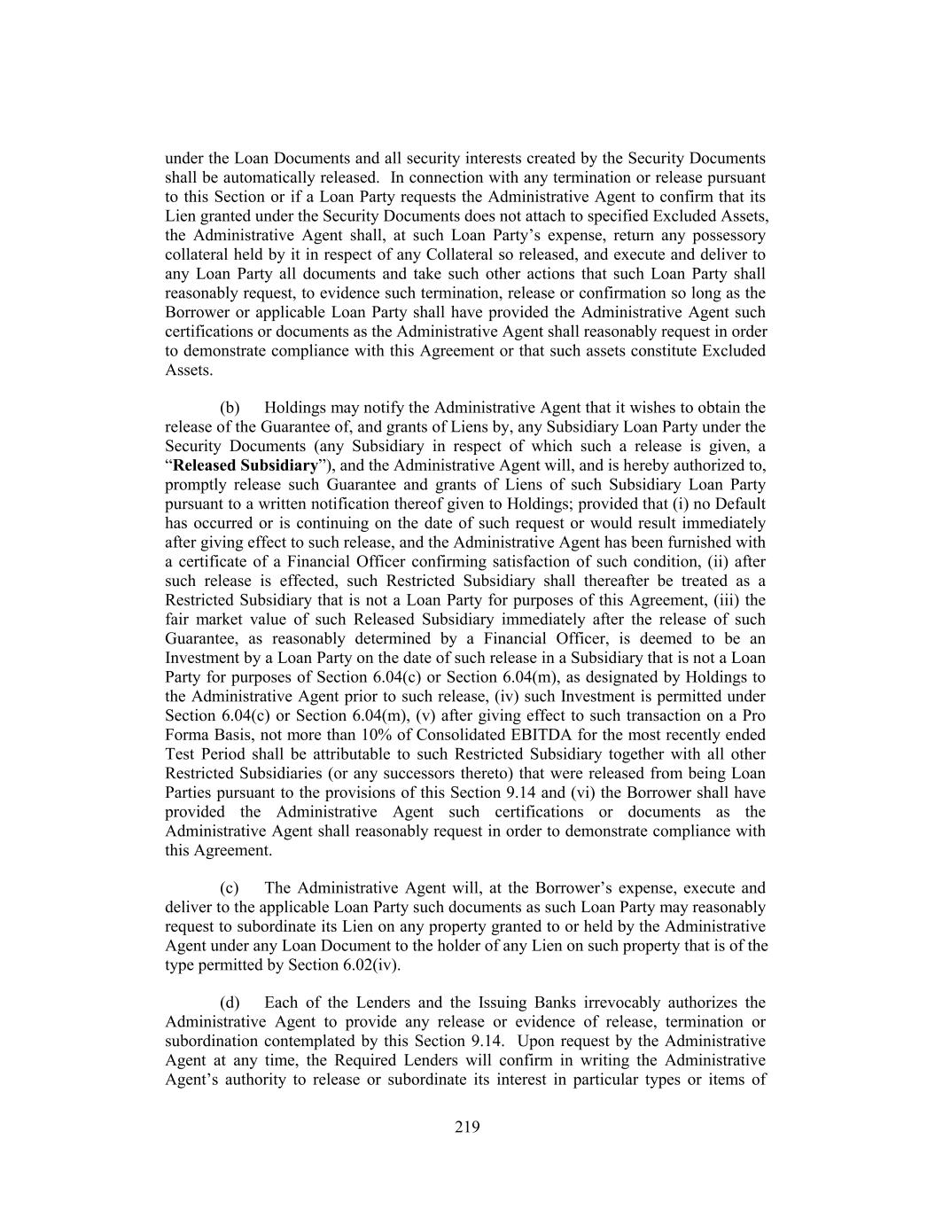 under the Loan Documents and all security interests created by the Security Documents shall be automatically released. In connection with any termination or release pursuant to this Section or if a Loan Party requests the Administrative Agent to confirm that its Lien granted under the Security Documents does not attach to specified Excluded Assets, the Administrative Agent shall, at such Loan Party’s expense, return any possessory collateral held by it in respect of any Collateral so released, and execute and deliver to any Loan Party all documents and take such other actions that such Loan Party shall reasonably request, to evidence such termination, release or confirmation so long as the Borrower or applicable Loan Party shall have provided the Administrative Agent such certifications or documents as the Administrative Agent shall reasonably request in order to demonstrate compliance with this Agreement or that such assets constitute Excluded Assets. (b) Holdings may notify the Administrative Agent that it wishes to obtain the release of the Guarantee of, and grants of Liens by, any Subsidiary Loan Party under the Security Documents (any Subsidiary in respect of which such a release is given, a “Released Subsidiary”), and the Administrative Agent will, and is hereby authorized to, promptly release such Guarantee and grants of Liens of such Subsidiary Loan Party pursuant to a written notification thereof given to Holdings; provided that (i) no Default has occurred or is continuing on the date of such request or would result immediately after giving effect to such release, and the Administrative Agent has been furnished with a certificate of a Financial Officer confirming satisfaction of such condition, (ii) after such release is effected, such Restricted Subsidiary shall thereafter be treated as a Restricted Subsidiary that is not a Loan Party for purposes of this Agreement, (iii) the fair market value of such Released Subsidiary immediately after the release of such Guarantee, as reasonably determined by a Financial Officer, is deemed to be an Investment by a Loan Party on the date of such release in a Subsidiary that is not a Loan Party for purposes of Section 6.04(c) or Section 6.04(m), as designated by Holdings to the Administrative Agent prior to such release, (iv) such Investment is permitted under Section 6.04(c) or Section 6.04(m), (v) after giving effect to such transaction on a Pro Forma Basis, not more than 10% of Consolidated EBITDA for the most recently ended Test Period shall be attributable to such Restricted Subsidiary together with all other Restricted Subsidiaries (or any successors thereto) that were released from being Loan Parties pursuant to the provisions of this Section 9.14 and (vi) the Borrower shall have provided the Administrative Agent such certifications or documents as the Administrative Agent shall reasonably request in order to demonstrate compliance with this Agreement. (c) The Administrative Agent will, at the Borrower’s expense, execute and deliver to the applicable Loan Party such documents as such Loan Party may reasonably request to subordinate its Lien on any property granted to or held by the Administrative Agent under any Loan Document to the holder of any Lien on such property that is of the type permitted by Section 6.02(iv). (d) Each of the Lenders and the Issuing Banks irrevocably authorizes the Administrative Agent to provide any release or evidence of release, termination or subordination contemplated by this Section 9.14. Upon request by the Administrative Agent at any time, the Required Lenders will confirm in writing the Administrative Agent’s authority to release or subordinate its interest in particular types or items of 219