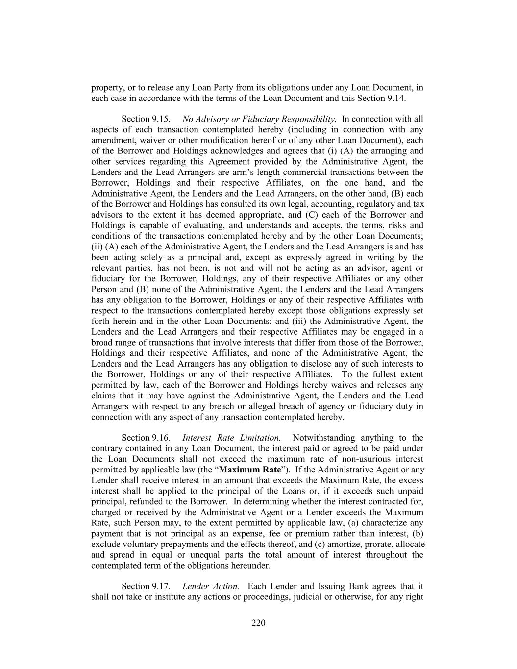 property, or to release any Loan Party from its obligations under any Loan Document, in each case in accordance with the terms of the Loan Document and this Section 9.14. Section 9.15. No Advisory or Fiduciary Responsibility. In connection with all aspects of each transaction contemplated hereby (including in connection with any amendment, waiver or other modification hereof or of any other Loan Document), each of the Borrower and Holdings acknowledges and agrees that (i) (A) the arranging and other services regarding this Agreement provided by the Administrative Agent, the Lenders and the Lead Arrangers are arm’s-length commercial transactions between the Borrower, Holdings and their respective Affiliates, on the one hand, and the Administrative Agent, the Lenders and the Lead Arrangers, on the other hand, (B) each of the Borrower and Holdings has consulted its own legal, accounting, regulatory and tax advisors to the extent it has deemed appropriate, and (C) each of the Borrower and Holdings is capable of evaluating, and understands and accepts, the terms, risks and conditions of the transactions contemplated hereby and by the other Loan Documents; (ii) (A) each of the Administrative Agent, the Lenders and the Lead Arrangers is and has been acting solely as a principal and, except as expressly agreed in writing by the relevant parties, has not been, is not and will not be acting as an advisor, agent or fiduciary for the Borrower, Holdings, any of their respective Affiliates or any other Person and (B) none of the Administrative Agent, the Lenders and the Lead Arrangers has any obligation to the Borrower, Holdings or any of their respective Affiliates with respect to the transactions contemplated hereby except those obligations expressly set forth herein and in the other Loan Documents; and (iii) the Administrative Agent, the Lenders and the Lead Arrangers and their respective Affiliates may be engaged in a broad range of transactions that involve interests that differ from those of the Borrower, Holdings and their respective Affiliates, and none of the Administrative Agent, the Lenders and the Lead Arrangers has any obligation to disclose any of such interests to the Borrower, Holdings or any of their respective Affiliates. To the fullest extent permitted by law, each of the Borrower and Holdings hereby waives and releases any claims that it may have against the Administrative Agent, the Lenders and the Lead Arrangers with respect to any breach or alleged breach of agency or fiduciary duty in connection with any aspect of any transaction contemplated hereby. Section 9.16. Interest Rate Limitation. Notwithstanding anything to the contrary contained in any Loan Document, the interest paid or agreed to be paid under the Loan Documents shall not exceed the maximum rate of non-usurious interest permitted by applicable law (the “Maximum Rate”). If the Administrative Agent or any Lender shall receive interest in an amount that exceeds the Maximum Rate, the excess interest shall be applied to the principal of the Loans or, if it exceeds such unpaid principal, refunded to the Borrower. In determining whether the interest contracted for, charged or received by the Administrative Agent or a Lender exceeds the Maximum Rate, such Person may, to the extent permitted by applicable law, (a) characterize any payment that is not principal as an expense, fee or premium rather than interest, (b) exclude voluntary prepayments and the effects thereof, and (c) amortize, prorate, allocate and spread in equal or unequal parts the total amount of interest throughout the contemplated term of the obligations hereunder. Section 9.17. Lender Action. Each Lender and Issuing Bank agrees that it shall not take or institute any actions or proceedings, judicial or otherwise, for any right 220