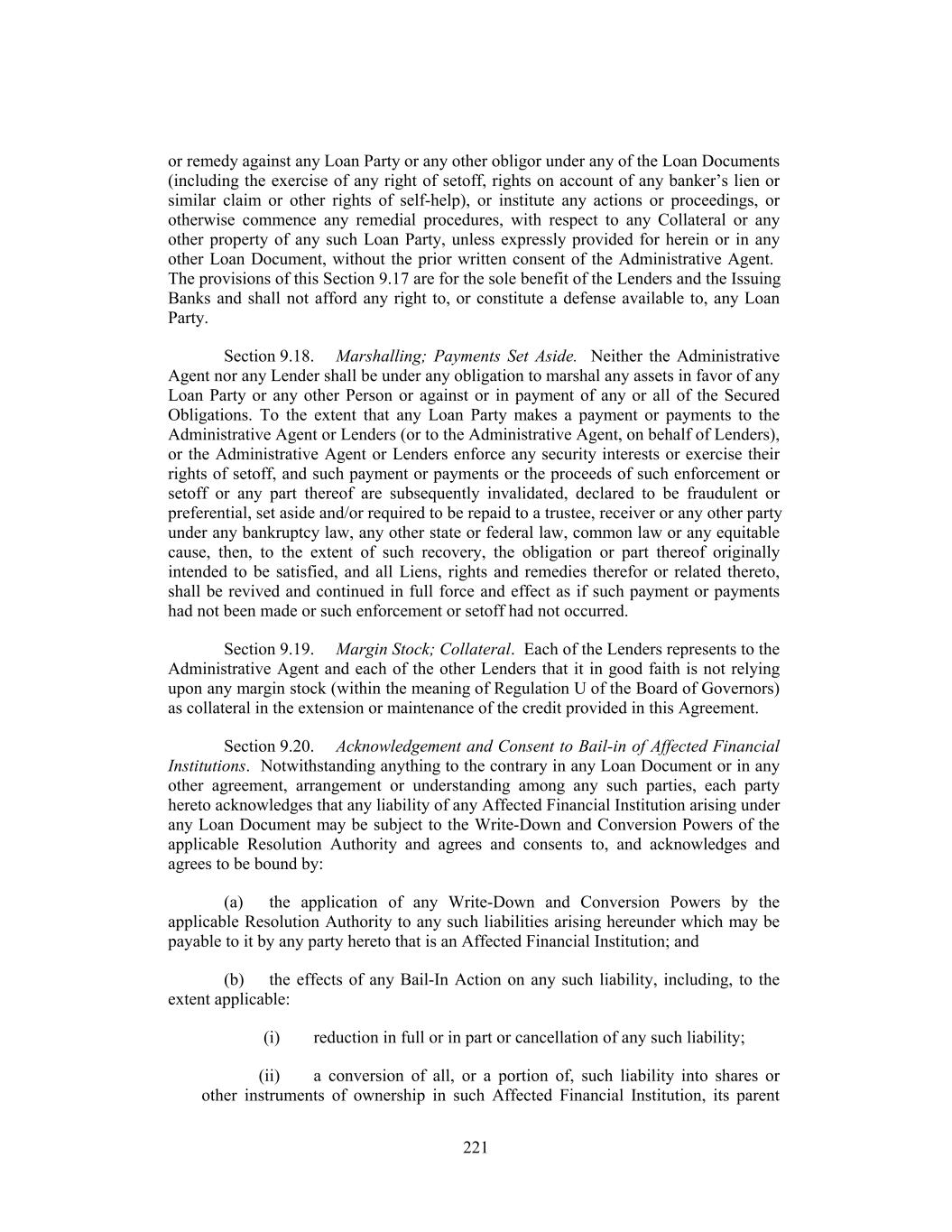 or remedy against any Loan Party or any other obligor under any of the Loan Documents (including the exercise of any right of setoff, rights on account of any banker’s lien or similar claim or other rights of self-help), or institute any actions or proceedings, or otherwise commence any remedial procedures, with respect to any Collateral or any other property of any such Loan Party, unless expressly provided for herein or in any other Loan Document, without the prior written consent of the Administrative Agent. The provisions of this Section 9.17 are for the sole benefit of the Lenders and the Issuing Banks and shall not afford any right to, or constitute a defense available to, any Loan Party. Section 9.18. Marshalling; Payments Set Aside. Neither the Administrative Agent nor any Lender shall be under any obligation to marshal any assets in favor of any Loan Party or any other Person or against or in payment of any or all of the Secured Obligations. To the extent that any Loan Party makes a payment or payments to the Administrative Agent or Lenders (or to the Administrative Agent, on behalf of Lenders), or the Administrative Agent or Lenders enforce any security interests or exercise their rights of setoff, and such payment or payments or the proceeds of such enforcement or setoff or any part thereof are subsequently invalidated, declared to be fraudulent or preferential, set aside and/or required to be repaid to a trustee, receiver or any other party under any bankruptcy law, any other state or federal law, common law or any equitable cause, then, to the extent of such recovery, the obligation or part thereof originally intended to be satisfied, and all Liens, rights and remedies therefor or related thereto, shall be revived and continued in full force and effect as if such payment or payments had not been made or such enforcement or setoff had not occurred. Section 9.19. Margin Stock; Collateral. Each of the Lenders represents to the Administrative Agent and each of the other Lenders that it in good faith is not relying upon any margin stock (within the meaning of Regulation U of the Board of Governors) as collateral in the extension or maintenance of the credit provided in this Agreement. Section 9.20. Acknowledgement and Consent to Bail-in of Affected Financial Institutions. Notwithstanding anything to the contrary in any Loan Document or in any other agreement, arrangement or understanding among any such parties, each party hereto acknowledges that any liability of any Affected Financial Institution arising under any Loan Document may be subject to the Write-Down and Conversion Powers of the applicable Resolution Authority and agrees and consents to, and acknowledges and agrees to be bound by: (a) the application of any Write-Down and Conversion Powers by the applicable Resolution Authority to any such liabilities arising hereunder which may be payable to it by any party hereto that is an Affected Financial Institution; and (b) the effects of any Bail-In Action on any such liability, including, to the extent applicable: (i) reduction in full or in part or cancellation of any such liability; (ii) a conversion of all, or a portion of, such liability into shares or other instruments of ownership in such Affected Financial Institution, its parent 221