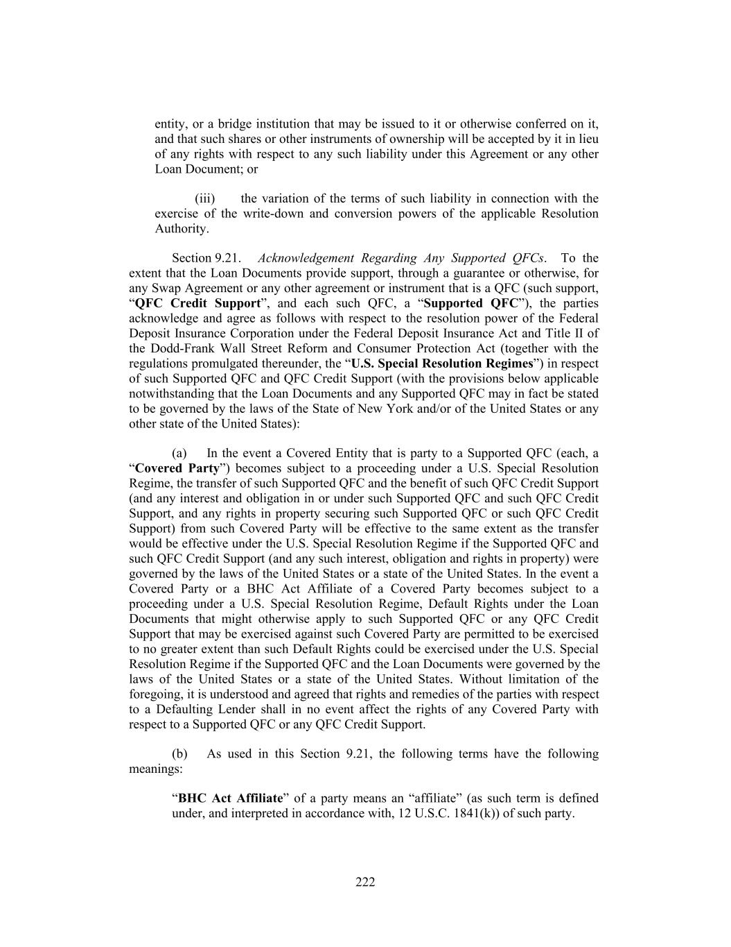 entity, or a bridge institution that may be issued to it or otherwise conferred on it, and that such shares or other instruments of ownership will be accepted by it in lieu of any rights with respect to any such liability under this Agreement or any other Loan Document; or (iii) the variation of the terms of such liability in connection with the exercise of the write-down and conversion powers of the applicable Resolution Authority. Section 9.21. Acknowledgement Regarding Any Supported QFCs. To the extent that the Loan Documents provide support, through a guarantee or otherwise, for any Swap Agreement or any other agreement or instrument that is a QFC (such support, “QFC Credit Support”, and each such QFC, a “Supported QFC”), the parties acknowledge and agree as follows with respect to the resolution power of the Federal Deposit Insurance Corporation under the Federal Deposit Insurance Act and Title II of the Dodd-Frank Wall Street Reform and Consumer Protection Act (together with the regulations promulgated thereunder, the “U.S. Special Resolution Regimes”) in respect of such Supported QFC and QFC Credit Support (with the provisions below applicable notwithstanding that the Loan Documents and any Supported QFC may in fact be stated to be governed by the laws of the State of New York and/or of the United States or any other state of the United States): (a) In the event a Covered Entity that is party to a Supported QFC (each, a “Covered Party”) becomes subject to a proceeding under a U.S. Special Resolution Regime, the transfer of such Supported QFC and the benefit of such QFC Credit Support (and any interest and obligation in or under such Supported QFC and such QFC Credit Support, and any rights in property securing such Supported QFC or such QFC Credit Support) from such Covered Party will be effective to the same extent as the transfer would be effective under the U.S. Special Resolution Regime if the Supported QFC and such QFC Credit Support (and any such interest, obligation and rights in property) were governed by the laws of the United States or a state of the United States. In the event a Covered Party or a BHC Act Affiliate of a Covered Party becomes subject to a proceeding under a U.S. Special Resolution Regime, Default Rights under the Loan Documents that might otherwise apply to such Supported QFC or any QFC Credit Support that may be exercised against such Covered Party are permitted to be exercised to no greater extent than such Default Rights could be exercised under the U.S. Special Resolution Regime if the Supported QFC and the Loan Documents were governed by the laws of the United States or a state of the United States. Without limitation of the foregoing, it is understood and agreed that rights and remedies of the parties with respect to a Defaulting Lender shall in no event affect the rights of any Covered Party with respect to a Supported QFC or any QFC Credit Support. (b) As used in this Section 9.21, the following terms have the following meanings: “BHC Act Affiliate” of a party means an “affiliate” (as such term is defined under, and interpreted in accordance with, 12 U.S.C. 1841(k)) of such party. 222