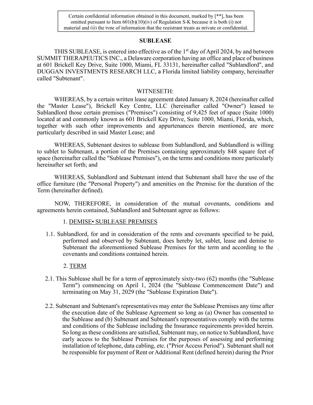 Certain confidential information obtained in this document, marked by [**], has been omitted pursuant to Item 601(b)(10)(iv) of Regulation S-K because it is both (i) not material and (ii) the type of information that the registrant treats as private or confidential. SUBLEASE THIS SUBLEASE, is entered into effective as of the 1st day of April 2024, by and between SUMMIT THERAPEUTICS INC., a Delaware corporation having an office and place of business at 601 Brickell Key Drive, Suite 1000, Miami, FL 33131, hereinafter called "Sublandlord", and DUGGAN INVESTMENTS RESEARCH LLC, a Florida limited liability company, hereinafter called "Subtenant". WITNESETH: WHEREAS, by a certain written lease agreement dated January 8, 2024 (hereinafter called the "Master Lease"), Brickell Key Centre, LLC (hereinafter called "Owner") leased to Sublandlord those certain premises ("Premises") consisting of 9,425 feet of space (Suite 1000) located at and commonly known as 601 Brickell Key Drive, Suite 1000, Miami, Florida, which, together with such other improvements and appurtenances therein mentioned, are more particularly described in said Master Lease; and WHEREAS, Subtenant desires to sublease from Sublandlord, and Sublandlord is willing to sublet to Subtenant, a portion of the Premises containing approximately 848 square feet of space (hereinafter called the "Sublease Premises"), on the terms and conditions more particularly hereinafter set forth; and WHEREAS, Sublandlord and Subtenant intend that Subtenant shall have the use of the office furniture (the "Personal Property") and amenities on the Premise for the duration of the Term (hereinafter defined). NOW, THEREFORE, in consideration of the mutual covenants, conditions and agreements herein contained, Sublandlord and Subtenant agree as follows: 1. DEMISE• SUBLEASE PREMISES 1.1. Sublandlord, for and in consideration of the rents and covenants specified to be paid, performed and observed by Subtenant, does hereby let, sublet, lease and demise to Subtenant the aforementioned Sublease Premises for the term and according to the covenants and conditions contained herein. 2. TERM 2.1. This Sublease shall be for a term of approximately sixty-two (62) months (the "Sublease Term") commencing on April 1, 2024 (the "Sublease Commencement Date") and terminating on May 31, 2029 (the "Sublease Expiration Date"). 2.2. Subtenant and Subtenant's representatives may enter the Sublease Premises any time after the execution date of the Sublease Agreement so long as (a) Owner has consented to the Sublease and (b) Subtenant and Subtenant's representatives comply with the terms and conditions of the Sublease including the Insurance requirements provided herein. So long as these conditions are satisfied, Subtenant may, on notice to Sublandlord, have early access to the Sublease Premises for the purposes of assessing and performing installation of telephone, data cabling, etc. ("Prior Access Period"). Subtenant shall not be responsible for payment of Rent or Additional Rent (defined herein) during the Prior