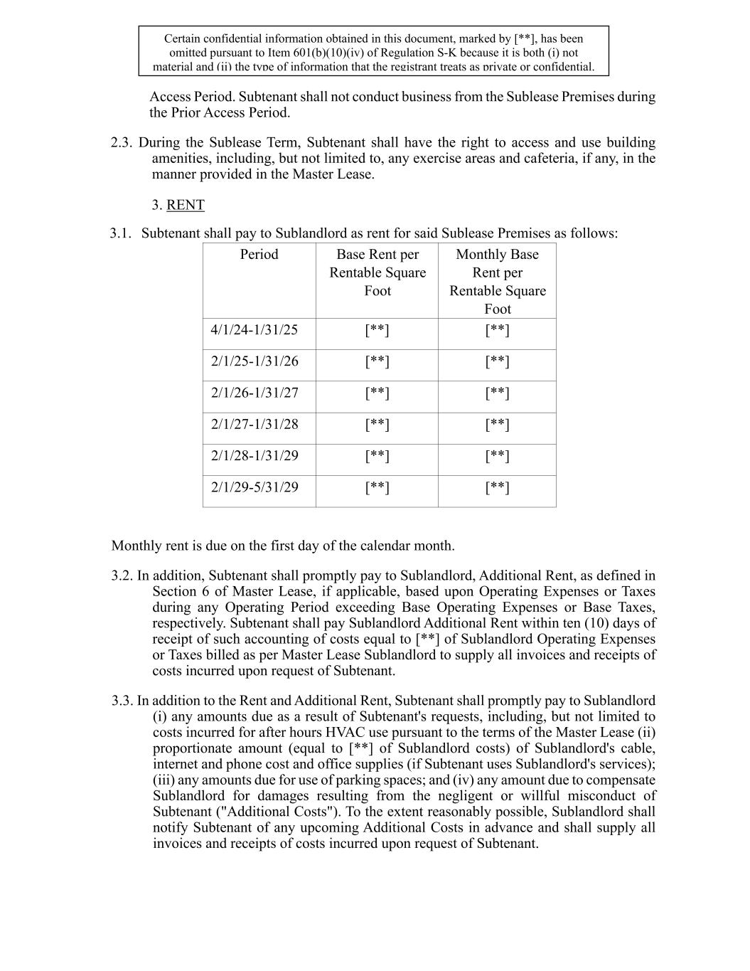Certain confidential information obtained in this document, marked by [**], has been omitted pursuant to Item 601(b)(10)(iv) of Regulation S-K because it is both (i) not material and (ii) the type of information that the registrant treats as private or confidential. Access Period. Subtenant shall not conduct business from the Sublease Premises during the Prior Access Period. 2.3. During the Sublease Term, Subtenant shall have the right to access and use building amenities, including, but not limited to, any exercise areas and cafeteria, if any, in the manner provided in the Master Lease. 3. RENT 3.1. Subtenant shall pay to Sublandlord as rent for said Sublease Premises as follows: Period Base Rent per Rentable Square Foot Monthly Base Rent per Rentable Square Foot 4/1/24-1/31/25 [**] [**] 2/1/25-1/31/26 [**] [**] 2/1/26-1/31/27 [**] [**] 2/1/27-1/31/28 [**] [**] 2/1/28-1/31/29 [**] [**] 2/1/29-5/31/29 [**] [**] Monthly rent is due on the first day of the calendar month. 3.2. In addition, Subtenant shall promptly pay to Sublandlord, Additional Rent, as defined in Section 6 of Master Lease, if applicable, based upon Operating Expenses or Taxes during any Operating Period exceeding Base Operating Expenses or Base Taxes, respectively. Subtenant shall pay Sublandlord Additional Rent within ten (10) days of receipt of such accounting of costs equal to [**] of Sublandlord Operating Expenses or Taxes billed as per Master Lease Sublandlord to supply all invoices and receipts of costs incurred upon request of Subtenant. 3.3. In addition to the Rent and Additional Rent, Subtenant shall promptly pay to Sublandlord (i) any amounts due as a result of Subtenant's requests, including, but not limited to costs incurred for after hours HVAC use pursuant to the terms of the Master Lease (ii) proportionate amount (equal to [**] of Sublandlord costs) of Sublandlord's cable, internet and phone cost and office supplies (if Subtenant uses Sublandlord's services); (iii) any amounts due for use of parking spaces; and (iv) any amount due to compensate Sublandlord for damages resulting from the negligent or willful misconduct of Subtenant ("Additional Costs"). To the extent reasonably possible, Sublandlord shall notify Subtenant of any upcoming Additional Costs in advance and shall supply all invoices and receipts of costs incurred upon request of Subtenant.