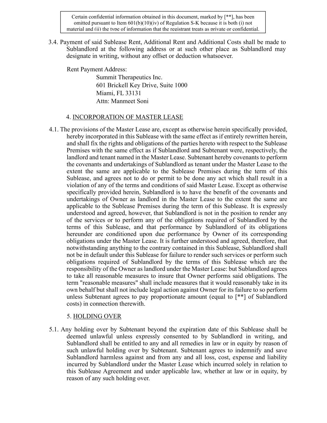 Certain confidential information obtained in this document, marked by [**], has been omitted pursuant to Item 601(b)(10)(iv) of Regulation S-K because it is both (i) not material and (ii) the type of information that the registrant treats as private or confidential. 3.4. Payment of said Sublease Rent, Additional Rent and Additional Costs shall be made to Sublandlord at the following address or at such other place as Sublandlord may designate in writing, without any offset or deduction whatsoever. Rent Payment Address: Summit Therapeutics Inc. 601 Brickell Key Drive, Suite 1000 Miami, FL 33131 Attn: Manmeet Soni 4. INCORPORATION OF MASTER LEASE 4.1. The provisions of the Master Lease are, except as otherwise herein specifically provided, hereby incorporated in this Sublease with the same effect as if entirely rewritten herein, and shall fix the rights and obligations of the parties hereto with respect to the Sublease Premises with the same effect as if Sublandlord and Subtenant were, respectively, the landlord and tenant named in the Master Lease. Subtenant hereby covenants to perform the covenants and undertakings of Sublandlord as tenant under the Master Lease to the extent the same are applicable to the Sublease Premises during the term of this Sublease, and agrees not to do or permit to be done any act which shall result in a violation of any of the terms and conditions of said Master Lease. Except as otherwise specifically provided herein, Sublandlord is to have the benefit of the covenants and undertakings of Owner as landlord in the Master Lease to the extent the same are applicable to the Sublease Premises during the term of this Sublease. It is expressly understood and agreed, however, that Sublandlord is not in the position to render any of the services or to perform any of the obligations required of Sublandlord by the terms of this Sublease, and that performance by Sublandlord of its obligations hereunder are conditioned upon due performance by Owner of its corresponding obligations under the Master Lease. It is further understood and agreed, therefore, that notwithstanding anything to the contrary contained in this Sublease, Sublandlord shall not be in default under this Sublease for failure to render such services or perform such obligations required of Sublandlord by the terms of this Sublease which are the responsibility of the Owner as landlord under the Master Lease: but Sublandlord agrees to take all reasonable measures to insure that Owner performs said obligations. The term "reasonable measures" shall include measures that it would reasonably take in its own behalf but shall not include legal action against Owner for its failure to so perform unless Subtenant agrees to pay proportionate amount (equal to [**] of Sublandlord costs) in connection therewith. 5. HOLDING OVER 5.1. Any holding over by Subtenant beyond the expiration date of this Sublease shall be deemed unlawful unless expressly consented to by Sublandlord in writing, and Sublandlord shall be entitled to any and all remedies in law or in equity by reason of such unlawful holding over by Subtenant. Subtenant agrees to indemnify and save Sublandlord harmless against and from any and all loss, cost, expense and liability incurred by Sublandlord under the Master Lease which incurred solely in relation to this Sublease Agreement and under applicable law, whether at law or in equity, by reason of any such holding over.
