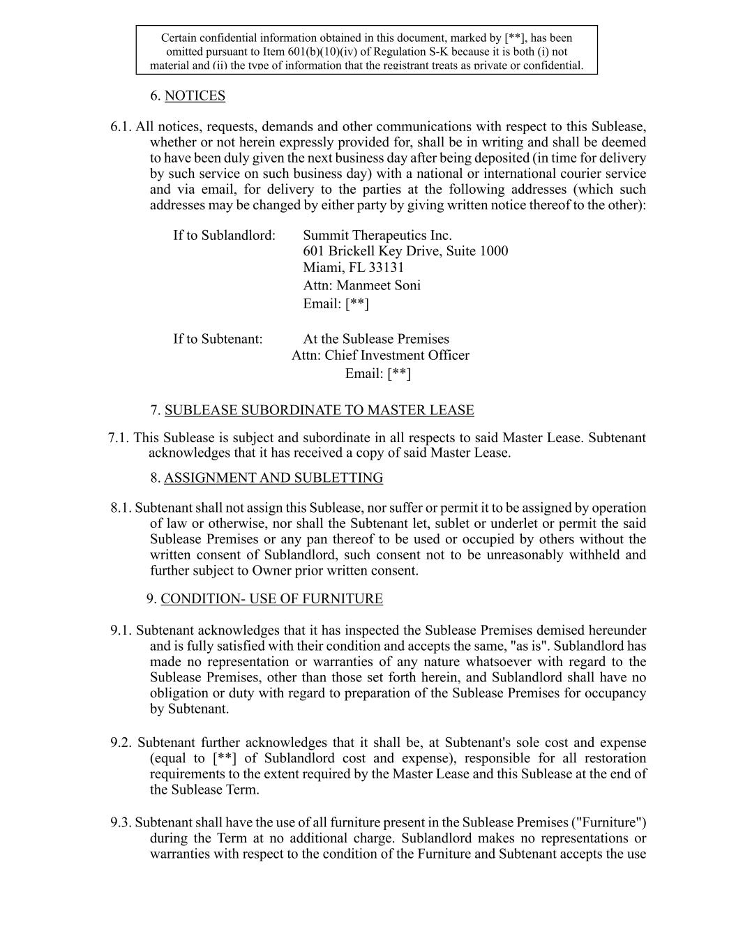 Certain confidential information obtained in this document, marked by [**], has been omitted pursuant to Item 601(b)(10)(iv) of Regulation S-K because it is both (i) not material and (ii) the type of information that the registrant treats as private or confidential. 6. NOTICES 6.1. All notices, requests, demands and other communications with respect to this Sublease, whether or not herein expressly provided for, shall be in writing and shall be deemed to have been duly given the next business day after being deposited (in time for delivery by such service on such business day) with a national or international courier service and via email, for delivery to the parties at the following addresses (which such addresses may be changed by either party by giving written notice thereof to the other): If to Sublandlord: Summit Therapeutics Inc. 601 Brickell Key Drive, Suite 1000 Miami, FL 33131 Attn: Manmeet Soni Email: [**] If to Subtenant: At the Sublease Premises Attn: Chief Investment Officer Email: [**] 7. SUBLEASE SUBORDINATE TO MASTER LEASE 7.1. This Sublease is subject and subordinate in all respects to said Master Lease. Subtenant acknowledges that it has received a copy of said Master Lease. 8. ASSIGNMENT AND SUBLETTING 8.1. Subtenant shall not assign this Sublease, nor suffer or permit it to be assigned by operation of law or otherwise, nor shall the Subtenant let, sublet or underlet or permit the said Sublease Premises or any pan thereof to be used or occupied by others without the written consent of Sublandlord, such consent not to be unreasonably withheld and further subject to Owner prior written consent. 9. CONDITION- USE OF FURNITURE 9.1. Subtenant acknowledges that it has inspected the Sublease Premises demised hereunder and is fully satisfied with their condition and accepts the same, "as is". Sublandlord has made no representation or warranties of any nature whatsoever with regard to the Sublease Premises, other than those set forth herein, and Sublandlord shall have no obligation or duty with regard to preparation of the Sublease Premises for occupancy by Subtenant. 9.2. Subtenant further acknowledges that it shall be, at Subtenant's sole cost and expense (equal to [**] of Sublandlord cost and expense), responsible for all restoration requirements to the extent required by the Master Lease and this Sublease at the end of the Sublease Term. 9.3. Subtenant shall have the use of all furniture present in the Sublease Premises ("Furniture") during the Term at no additional charge. Sublandlord makes no representations or warranties with respect to the condition of the Furniture and Subtenant accepts the use
