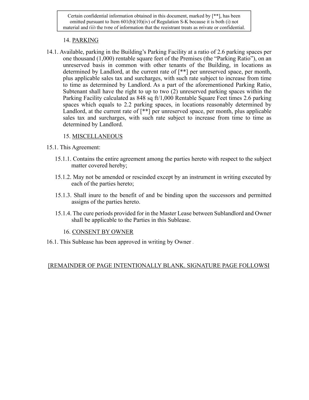Certain confidential information obtained in this document, marked by [**], has been omitted pursuant to Item 601(b)(10)(iv) of Regulation S-K because it is both (i) not material and (ii) the type of information that the registrant treats as private or confidential. 14. PARKING 14.1. Available, parking in the Building’s Parking Facility at a ratio of 2.6 parking spaces per one thousand (1,000) rentable square feet of the Premises (the “Parking Ratio”), on an unreserved basis in common with other tenants of the Building, in locations as determined by Landlord, at the current rate of [**] per unreserved space, per month, plus applicable sales tax and surcharges, with such rate subject to increase from time to time as determined by Landlord. As a part of the aforementioned Parking Ratio, Subtenant shall have the right to up to two (2) unreserved parking spaces within the Parking Facility calculated as 848 sq ft/1,000 Rentable Square Feet times 2.6 parking spaces which equals to 2.2 parking spaces, in locations reasonably determined by Landlord, at the current rate of [**] per unreserved space, per month, plus applicable sales tax and surcharges, with such rate subject to increase from time to time as determined by Landlord. 15. MISCELLANEOUS 15.1. This Agreement: 15.1.1. Contains the entire agreement among the parties hereto with respect to the subject matter covered hereby; 15.1.2. May not be amended or rescinded except by an instrument in writing executed by each of the parties hereto; 15.1.3. Shall inure to the benefit of and be binding upon the successors and permitted assigns of the parties hereto. 15.1.4. The cure periods provided for in the Master Lease between Sublandlord and Owner shall be applicable to the Parties in this Sublease. 16. CONSENT BY OWNER 16.1. This Sublease has been approved in writing by Owner [REMAINDER OF PAGE INTENTIONALLY BLANK. SIGNATURE PAGE FOLLOWSI