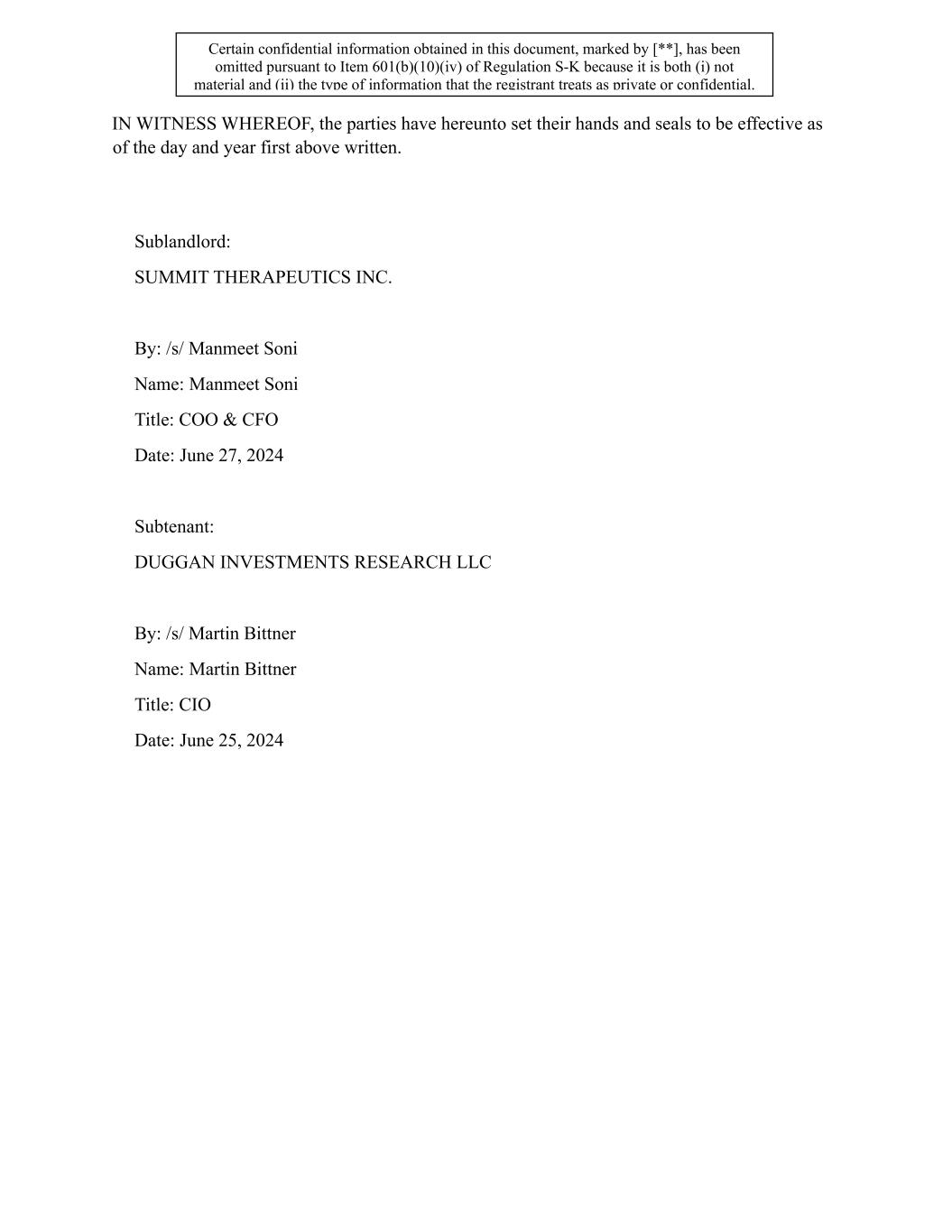 Certain confidential information obtained in this document, marked by [**], has been omitted pursuant to Item 601(b)(10)(iv) of Regulation S-K because it is both (i) not material and (ii) the type of information that the registrant treats as private or confidential. IN WITNESS WHEREOF, the parties have hereunto set their hands and seals to be effective as of the day and year first above written. Sublandlord: SUMMIT THERAPEUTICS INC. By: /s/ Manmeet Soni Name: Manmeet Soni Title: COO & CFO Date: June 27, 2024 Subtenant: DUGGAN INVESTMENTS RESEARCH LLC By: /s/ Martin Bittner Name: Martin Bittner Title: CIO Date: June 25, 2024