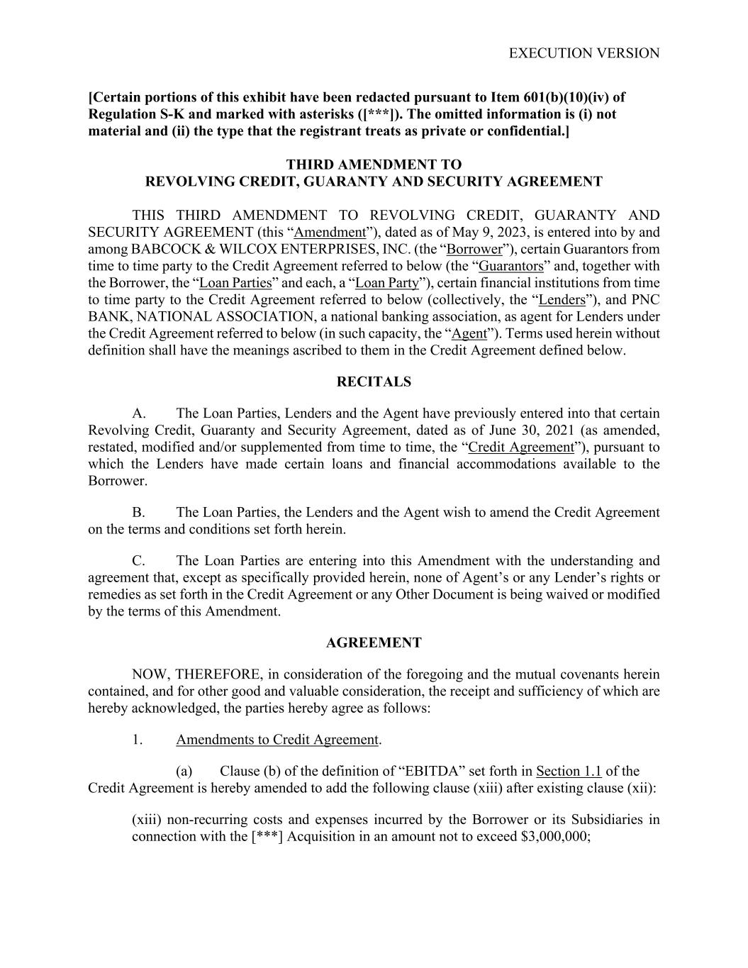 EXECUTION VERSION [Certain portions of this exhibit have been redacted pursuant to Item 601(b)(10)(iv) of Regulation S-K and marked with asterisks ([***]). The omitted information is (i) not material and (ii) the type that the registrant treats as private or confidential.] THIRD AMENDMENT TO REVOLVING CREDIT, GUARANTY AND SECURITY AGREEMENT THIS THIRD AMENDMENT TO REVOLVING CREDIT, GUARANTY AND SECURITY AGREEMENT (this “Amendment”), dated as of May 9, 2023, is entered into by and among BABCOCK & WILCOX ENTERPRISES, INC. (the “Borrower”), certain Guarantors from time to time party to the Credit Agreement referred to below (the “Guarantors” and, together with the Borrower, the “Loan Parties” and each, a “Loan Party”), certain financial institutions from time to time party to the Credit Agreement referred to below (collectively, the “Lenders”), and PNC BANK, NATIONAL ASSOCIATION, a national banking association, as agent for Lenders under the Credit Agreement referred to below (in such capacity, the “Agent”). Terms used herein without definition shall have the meanings ascribed to them in the Credit Agreement defined below. RECITALS A. The Loan Parties, Lenders and the Agent have previously entered into that certain Revolving Credit, Guaranty and Security Agreement, dated as of June 30, 2021 (as amended, restated, modified and/or supplemented from time to time, the “Credit Agreement”), pursuant to which the Lenders have made certain loans and financial accommodations available to the Borrower. B. The Loan Parties, the Lenders and the Agent wish to amend the Credit Agreement on the terms and conditions set forth herein. C. The Loan Parties are entering into this Amendment with the understanding and agreement that, except as specifically provided herein, none of Agent’s or any Lender’s rights or remedies as set forth in the Credit Agreement or any Other Document is being waived or modified by the terms of this Amendment. AGREEMENT NOW, THEREFORE, in consideration of the foregoing and the mutual covenants herein contained, and for other good and valuable consideration, the receipt and sufficiency of which are hereby acknowledged, the parties hereby agree as follows: 1. Amendments to Credit Agreement. (a) Clause (b) of the definition of “EBITDA” set forth in Section 1.1 of the Credit Agreement is hereby amended to add the following clause (xiii) after existing clause (xii): (xiii) non-recurring costs and expenses incurred by the Borrower or its Subsidiaries in connection with the [***] Acquisition in an amount not to exceed $3,000,000;