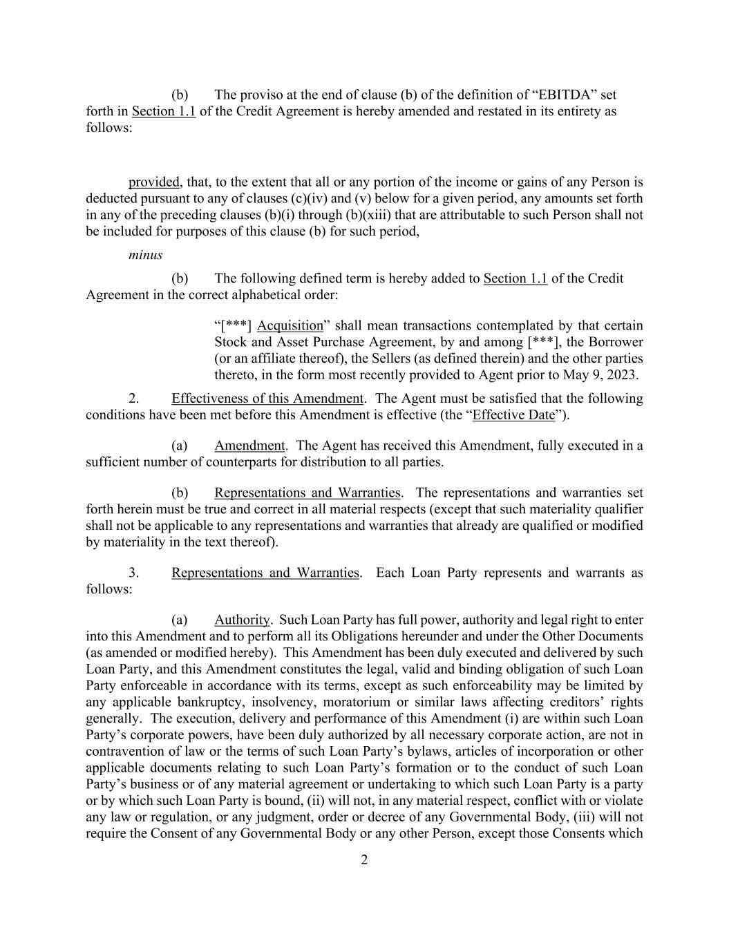 2 (b) The proviso at the end of clause (b) of the definition of “EBITDA” set forth in Section 1.1 of the Credit Agreement is hereby amended and restated in its entirety as follows: provided, that, to the extent that all or any portion of the income or gains of any Person is deducted pursuant to any of clauses (c)(iv) and (v) below for a given period, any amounts set forth in any of the preceding clauses (b)(i) through (b)(xiii) that are attributable to such Person shall not be included for purposes of this clause (b) for such period, minus (b) The following defined term is hereby added to Section 1.1 of the Credit Agreement in the correct alphabetical order: “[***] Acquisition” shall mean transactions contemplated by that certain Stock and Asset Purchase Agreement, by and among [***], the Borrower (or an affiliate thereof), the Sellers (as defined therein) and the other parties thereto, in the form most recently provided to Agent prior to May 9, 2023. 2. Effectiveness of this Amendment. The Agent must be satisfied that the following conditions have been met before this Amendment is effective (the “Effective Date”). (a) Amendment. The Agent has received this Amendment, fully executed in a sufficient number of counterparts for distribution to all parties. (b) Representations and Warranties. The representations and warranties set forth herein must be true and correct in all material respects (except that such materiality qualifier shall not be applicable to any representations and warranties that already are qualified or modified by materiality in the text thereof). 3. Representations and Warranties. Each Loan Party represents and warrants as follows: (a) Authority. Such Loan Party has full power, authority and legal right to enter into this Amendment and to perform all its Obligations hereunder and under the Other Documents (as amended or modified hereby). This Amendment has been duly executed and delivered by such Loan Party, and this Amendment constitutes the legal, valid and binding obligation of such Loan Party enforceable in accordance with its terms, except as such enforceability may be limited by any applicable bankruptcy, insolvency, moratorium or similar laws affecting creditors’ rights generally. The execution, delivery and performance of this Amendment (i) are within such Loan Party’s corporate powers, have been duly authorized by all necessary corporate action, are not in contravention of law or the terms of such Loan Party’s bylaws, articles of incorporation or other applicable documents relating to such Loan Party’s formation or to the conduct of such Loan Party’s business or of any material agreement or undertaking to which such Loan Party is a party or by which such Loan Party is bound, (ii) will not, in any material respect, conflict with or violate any law or regulation, or any judgment, order or decree of any Governmental Body, (iii) will not require the Consent of any Governmental Body or any other Person, except those Consents which