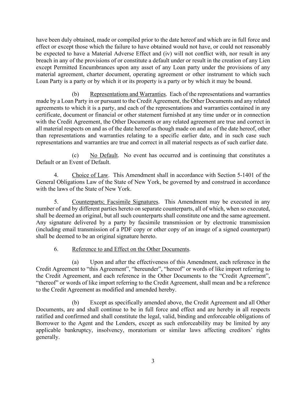 3 have been duly obtained, made or compiled prior to the date hereof and which are in full force and effect or except those which the failure to have obtained would not have, or could not reasonably be expected to have a Material Adverse Effect and (iv) will not conflict with, nor result in any breach in any of the provisions of or constitute a default under or result in the creation of any Lien except Permitted Encumbrances upon any asset of any Loan party under the provisions of any material agreement, charter document, operating agreement or other instrument to which such Loan Party is a party or by which it or its property is a party or by which it may be bound. (b) Representations and Warranties. Each of the representations and warranties made by a Loan Party in or pursuant to the Credit Agreement, the Other Documents and any related agreements to which it is a party, and each of the representations and warranties contained in any certificate, document or financial or other statement furnished at any time under or in connection with the Credit Agreement, the Other Documents or any related agreement are true and correct in all material respects on and as of the date hereof as though made on and as of the date hereof, other than representations and warranties relating to a specific earlier date, and in such case such representations and warranties are true and correct in all material respects as of such earlier date. (c) No Default. No event has occurred and is continuing that constitutes a Default or an Event of Default. 4. Choice of Law. This Amendment shall in accordance with Section 5-1401 of the General Obligations Law of the State of New York, be governed by and construed in accordance with the laws of the State of New York. 5. Counterparts; Facsimile Signatures. This Amendment may be executed in any number of and by different parties hereto on separate counterparts, all of which, when so executed, shall be deemed an original, but all such counterparts shall constitute one and the same agreement. Any signature delivered by a party by facsimile transmission or by electronic transmission (including email transmission of a PDF copy or other copy of an image of a signed counterpart) shall be deemed to be an original signature hereto. 6. Reference to and Effect on the Other Documents. (a) Upon and after the effectiveness of this Amendment, each reference in the Credit Agreement to “this Agreement”, “hereunder”, “hereof” or words of like import referring to the Credit Agreement, and each reference in the Other Documents to the “Credit Agreement”, “thereof” or words of like import referring to the Credit Agreement, shall mean and be a reference to the Credit Agreement as modified and amended hereby. (b) Except as specifically amended above, the Credit Agreement and all Other Documents, are and shall continue to be in full force and effect and are hereby in all respects ratified and confirmed and shall constitute the legal, valid, binding and enforceable obligations of Borrower to the Agent and the Lenders, except as such enforceability may be limited by any applicable bankruptcy, insolvency, moratorium or similar laws affecting creditors’ rights generally.