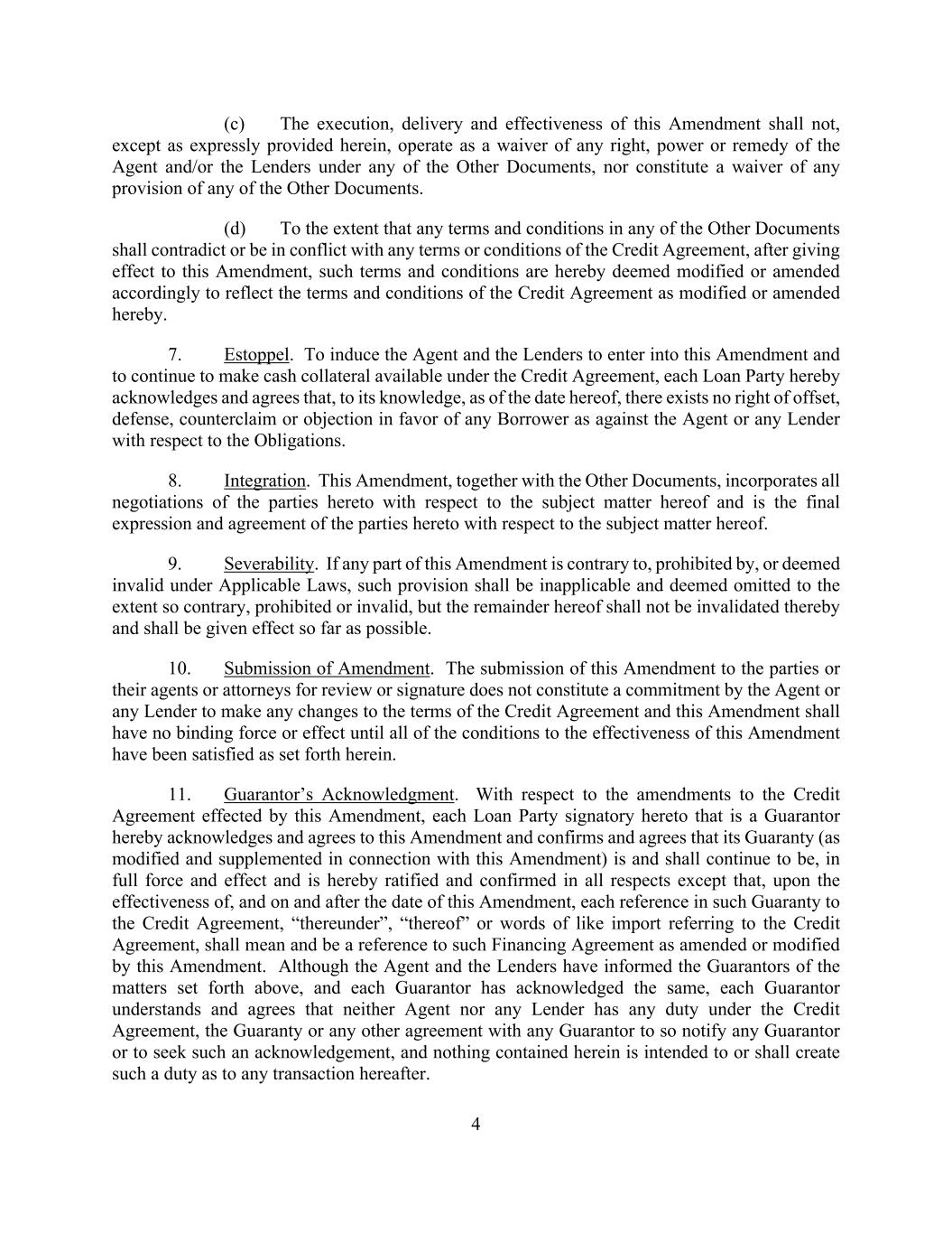 4 (c) The execution, delivery and effectiveness of this Amendment shall not, except as expressly provided herein, operate as a waiver of any right, power or remedy of the Agent and/or the Lenders under any of the Other Documents, nor constitute a waiver of any provision of any of the Other Documents. (d) To the extent that any terms and conditions in any of the Other Documents shall contradict or be in conflict with any terms or conditions of the Credit Agreement, after giving effect to this Amendment, such terms and conditions are hereby deemed modified or amended accordingly to reflect the terms and conditions of the Credit Agreement as modified or amended hereby. 7. Estoppel. To induce the Agent and the Lenders to enter into this Amendment and to continue to make cash collateral available under the Credit Agreement, each Loan Party hereby acknowledges and agrees that, to its knowledge, as of the date hereof, there exists no right of offset, defense, counterclaim or objection in favor of any Borrower as against the Agent or any Lender with respect to the Obligations. 8. Integration. This Amendment, together with the Other Documents, incorporates all negotiations of the parties hereto with respect to the subject matter hereof and is the final expression and agreement of the parties hereto with respect to the subject matter hereof. 9. Severability. If any part of this Amendment is contrary to, prohibited by, or deemed invalid under Applicable Laws, such provision shall be inapplicable and deemed omitted to the extent so contrary, prohibited or invalid, but the remainder hereof shall not be invalidated thereby and shall be given effect so far as possible. 10. Submission of Amendment. The submission of this Amendment to the parties or their agents or attorneys for review or signature does not constitute a commitment by the Agent or any Lender to make any changes to the terms of the Credit Agreement and this Amendment shall have no binding force or effect until all of the conditions to the effectiveness of this Amendment have been satisfied as set forth herein. 11. Guarantor’s Acknowledgment. With respect to the amendments to the Credit Agreement effected by this Amendment, each Loan Party signatory hereto that is a Guarantor hereby acknowledges and agrees to this Amendment and confirms and agrees that its Guaranty (as modified and supplemented in connection with this Amendment) is and shall continue to be, in full force and effect and is hereby ratified and confirmed in all respects except that, upon the effectiveness of, and on and after the date of this Amendment, each reference in such Guaranty to the Credit Agreement, “thereunder”, “thereof” or words of like import referring to the Credit Agreement, shall mean and be a reference to such Financing Agreement as amended or modified by this Amendment. Although the Agent and the Lenders have informed the Guarantors of the matters set forth above, and each Guarantor has acknowledged the same, each Guarantor understands and agrees that neither Agent nor any Lender has any duty under the Credit Agreement, the Guaranty or any other agreement with any Guarantor to so notify any Guarantor or to seek such an acknowledgement, and nothing contained herein is intended to or shall create such a duty as to any transaction hereafter.