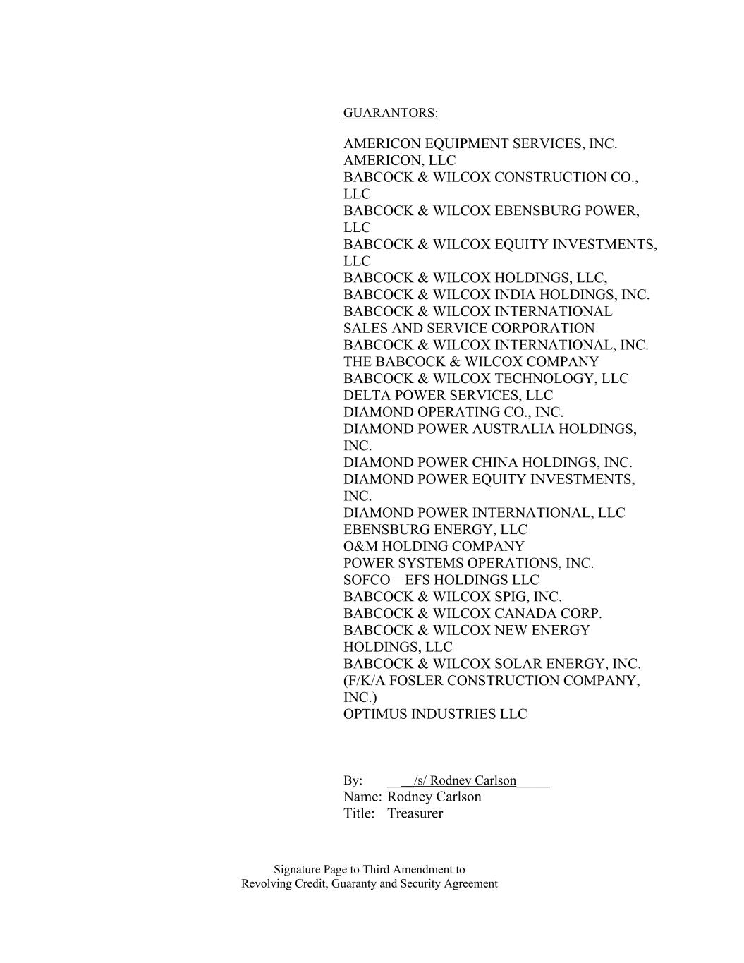 Signature Page to Third Amendment to Revolving Credit, Guaranty and Security Agreement GUARANTORS: AMERICON EQUIPMENT SERVICES, INC. AMERICON, LLC BABCOCK & WILCOX CONSTRUCTION CO., LLC BABCOCK & WILCOX EBENSBURG POWER, LLC BABCOCK & WILCOX EQUITY INVESTMENTS, LLC BABCOCK & WILCOX HOLDINGS, LLC, BABCOCK & WILCOX INDIA HOLDINGS, INC. BABCOCK & WILCOX INTERNATIONAL SALES AND SERVICE CORPORATION BABCOCK & WILCOX INTERNATIONAL, INC. THE BABCOCK & WILCOX COMPANY BABCOCK & WILCOX TECHNOLOGY, LLC DELTA POWER SERVICES, LLC DIAMOND OPERATING CO., INC. DIAMOND POWER AUSTRALIA HOLDINGS, INC. DIAMOND POWER CHINA HOLDINGS, INC. DIAMOND POWER EQUITY INVESTMENTS, INC. DIAMOND POWER INTERNATIONAL, LLC EBENSBURG ENERGY, LLC O&M HOLDING COMPANY POWER SYSTEMS OPERATIONS, INC. SOFCO – EFS HOLDINGS LLC BABCOCK & WILCOX SPIG, INC. BABCOCK & WILCOX CANADA CORP. BABCOCK & WILCOX NEW ENERGY HOLDINGS, LLC BABCOCK & WILCOX SOLAR ENERGY, INC. (F/K/A FOSLER CONSTRUCTION COMPANY, INC.) OPTIMUS INDUSTRIES LLC By: ____/s/ Rodney Carlson_____ Name: Rodney Carlson Title: Treasurer