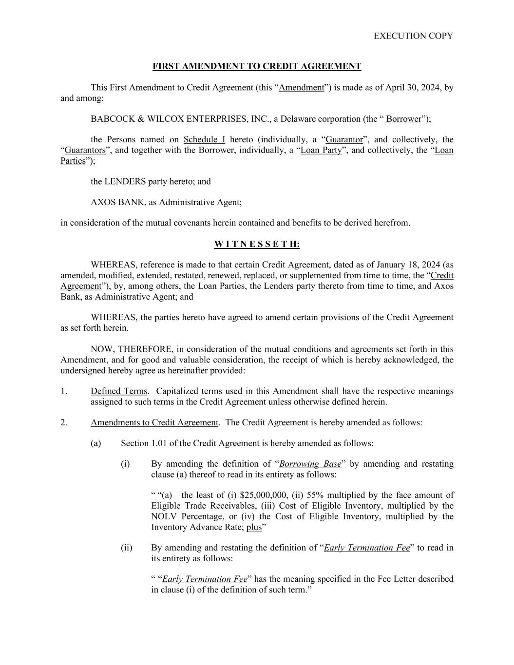 EXECUTION COPY FIRST AMENDMENT TO CREDIT AGREEMENT This First Amendment to Credit Agreement (this “Amendment”) is made as of April 30, 2024, by and among: BABCOCK & WILCOX ENTERPRISES, INC., a Delaware corporation (the “ Borrower”); the Persons named on Schedule I hereto (individually, a “Guarantor”, and collectively, the “Guarantors”, and together with the Borrower, individually, a “Loan Party”, and collectively, the “Loan Parties”); the LENDERS party hereto; and AXOS BANK, as Administrative Agent; in consideration of the mutual covenants herein contained and benefits to be derived herefrom. W I T N E S S E T H: WHEREAS, reference is made to that certain Credit Agreement, dated as of January 18, 2024 (as amended, modified, extended, restated, renewed, replaced, or supplemented from time to time, the “Credit Agreement”), by, among others, the Loan Parties, the Lenders party thereto from time to time, and Axos Bank, as Administrative Agent; and WHEREAS, the parties hereto have agreed to amend certain provisions of the Credit Agreement as set forth herein. NOW, THEREFORE, in consideration of the mutual conditions and agreements set forth in this Amendment, and for good and valuable consideration, the receipt of which is hereby acknowledged, the undersigned hereby agree as hereinafter provided: 1. Defined Terms. Capitalized terms used in this Amendment shall have the respective meanings assigned to such terms in the Credit Agreement unless otherwise defined herein. 2. Amendments to Credit Agreement. The Credit Agreement is hereby amended as follows: (a) Section 1.01 of the Credit Agreement is hereby amended as follows: (i) By amending the definition of “Borrowing Base” by amending and restating clause (a) thereof to read in its entirety as follows: “ “(a) the least of (i) $25,000,000, (ii) 55% multiplied by the face amount of Eligible Trade Receivables, (iii) Cost of Eligible Inventory, multiplied by the NOLV Percentage, or (iv) the Cost of Eligible Inventory, multiplied by the Inventory Advance Rate; plus” (ii) By amending and restating the definition of “Early Termination Fee” to read in its entirety as follows: “ “Early Termination Fee” has the meaning specified in the Fee Letter described in clause (i) of the definition of such term.”
