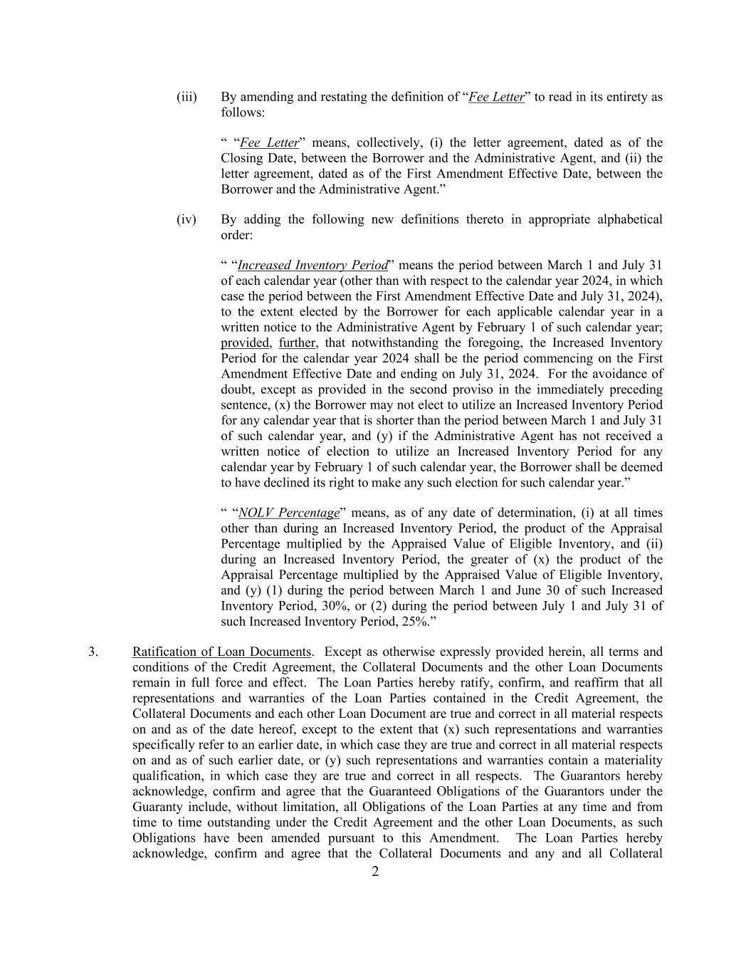 2 (iii) By amending and restating the definition of “Fee Letter” to read in its entirety as follows: “ “Fee Letter” means, collectively, (i) the letter agreement, dated as of the Closing Date, between the Borrower and the Administrative Agent, and (ii) the letter agreement, dated as of the First Amendment Effective Date, between the Borrower and the Administrative Agent.” (iv) By adding the following new definitions thereto in appropriate alphabetical order: “ “Increased Inventory Period” means the period between March 1 and July 31 of each calendar year (other than with respect to the calendar year 2024, in which case the period between the First Amendment Effective Date and July 31, 2024), to the extent elected by the Borrower for each applicable calendar year in a written notice to the Administrative Agent by February 1 of such calendar year; provided, further, that notwithstanding the foregoing, the Increased Inventory Period for the calendar year 2024 shall be the period commencing on the First Amendment Effective Date and ending on July 31, 2024. For the avoidance of doubt, except as provided in the second proviso in the immediately preceding sentence, (x) the Borrower may not elect to utilize an Increased Inventory Period for any calendar year that is shorter than the period between March 1 and July 31 of such calendar year, and (y) if the Administrative Agent has not received a written notice of election to utilize an Increased Inventory Period for any calendar year by February 1 of such calendar year, the Borrower shall be deemed to have declined its right to make any such election for such calendar year.” “ “NOLV Percentage” means, as of any date of determination, (i) at all times other than during an Increased Inventory Period, the product of the Appraisal Percentage multiplied by the Appraised Value of Eligible Inventory, and (ii) during an Increased Inventory Period, the greater of (x) the product of the Appraisal Percentage multiplied by the Appraised Value of Eligible Inventory, and (y) (1) during the period between March 1 and June 30 of such Increased Inventory Period, 30%, or (2) during the period between July 1 and July 31 of such Increased Inventory Period, 25%.” 3. Ratification of Loan Documents. Except as otherwise expressly provided herein, all terms and conditions of the Credit Agreement, the Collateral Documents and the other Loan Documents remain in full force and effect. The Loan Parties hereby ratify, confirm, and reaffirm that all representations and warranties of the Loan Parties contained in the Credit Agreement, the Collateral Documents and each other Loan Document are true and correct in all material respects on and as of the date hereof, except to the extent that (x) such representations and warranties specifically refer to an earlier date, in which case they are true and correct in all material respects on and as of such earlier date, or (y) such representations and warranties contain a materiality qualification, in which case they are true and correct in all respects. The Guarantors hereby acknowledge, confirm and agree that the Guaranteed Obligations of the Guarantors under the Guaranty include, without limitation, all Obligations of the Loan Parties at any time and from time to time outstanding under the Credit Agreement and the other Loan Documents, as such Obligations have been amended pursuant to this Amendment. The Loan Parties hereby acknowledge, confirm and agree that the Collateral Documents and any and all Collateral