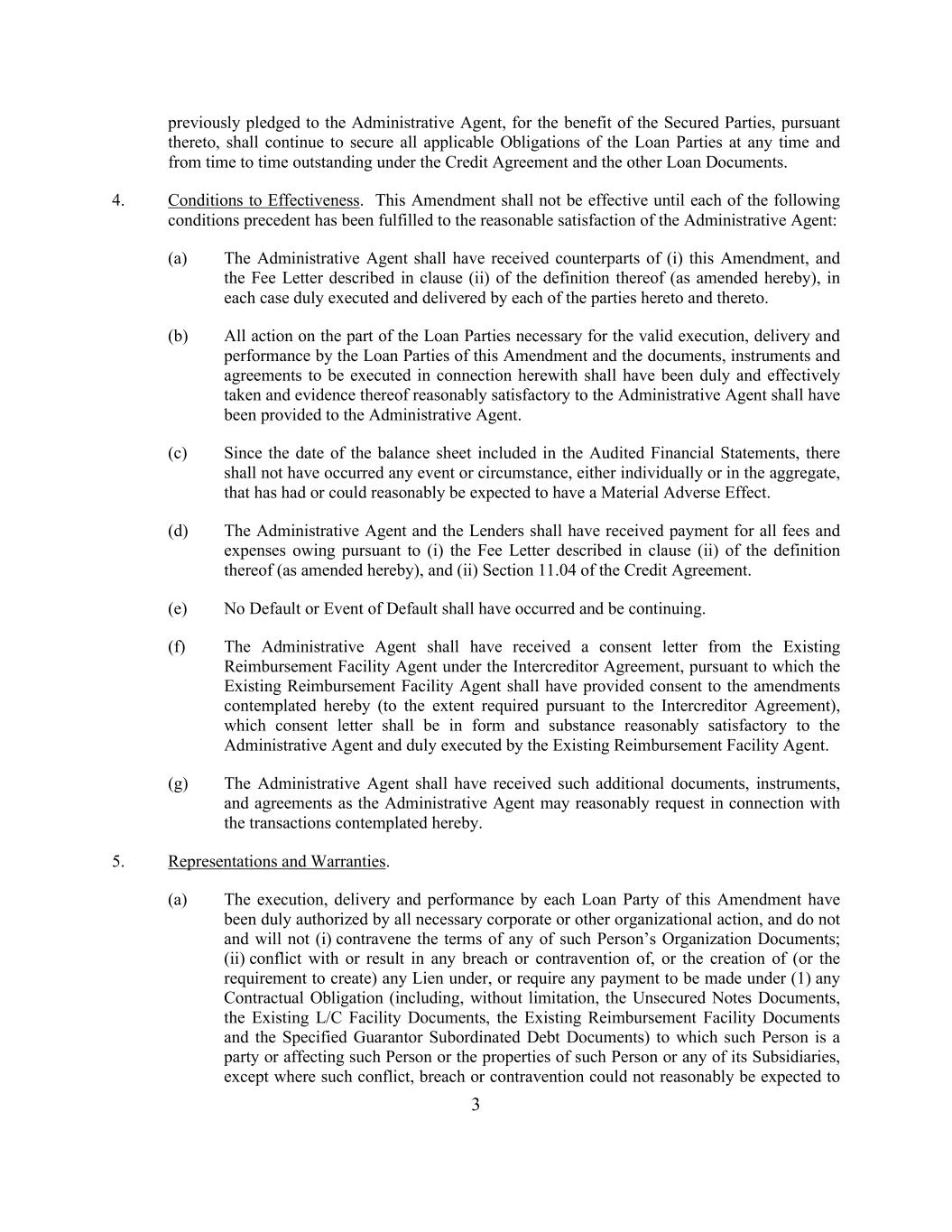 3 previously pledged to the Administrative Agent, for the benefit of the Secured Parties, pursuant thereto, shall continue to secure all applicable Obligations of the Loan Parties at any time and from time to time outstanding under the Credit Agreement and the other Loan Documents. 4. Conditions to Effectiveness. This Amendment shall not be effective until each of the following conditions precedent has been fulfilled to the reasonable satisfaction of the Administrative Agent: (a) The Administrative Agent shall have received counterparts of (i) this Amendment, and the Fee Letter described in clause (ii) of the definition thereof (as amended hereby), in each case duly executed and delivered by each of the parties hereto and thereto. (b) All action on the part of the Loan Parties necessary for the valid execution, delivery and performance by the Loan Parties of this Amendment and the documents, instruments and agreements to be executed in connection herewith shall have been duly and effectively taken and evidence thereof reasonably satisfactory to the Administrative Agent shall have been provided to the Administrative Agent. (c) Since the date of the balance sheet included in the Audited Financial Statements, there shall not have occurred any event or circumstance, either individually or in the aggregate, that has had or could reasonably be expected to have a Material Adverse Effect. (d) The Administrative Agent and the Lenders shall have received payment for all fees and expenses owing pursuant to (i) the Fee Letter described in clause (ii) of the definition thereof (as amended hereby), and (ii) Section 11.04 of the Credit Agreement. (e) No Default or Event of Default shall have occurred and be continuing. (f) The Administrative Agent shall have received a consent letter from the Existing Reimbursement Facility Agent under the Intercreditor Agreement, pursuant to which the Existing Reimbursement Facility Agent shall have provided consent to the amendments contemplated hereby (to the extent required pursuant to the Intercreditor Agreement), which consent letter shall be in form and substance reasonably satisfactory to the Administrative Agent and duly executed by the Existing Reimbursement Facility Agent. (g) The Administrative Agent shall have received such additional documents, instruments, and agreements as the Administrative Agent may reasonably request in connection with the transactions contemplated hereby. 5. Representations and Warranties. (a) The execution, delivery and performance by each Loan Party of this Amendment have been duly authorized by all necessary corporate or other organizational action, and do not and will not (i) contravene the terms of any of such Person’s Organization Documents; (ii) conflict with or result in any breach or contravention of, or the creation of (or the requirement to create) any Lien under, or require any payment to be made under (1) any Contractual Obligation (including, without limitation, the Unsecured Notes Documents, the Existing L/C Facility Documents, the Existing Reimbursement Facility Documents and the Specified Guarantor Subordinated Debt Documents) to which such Person is a party or affecting such Person or the properties of such Person or any of its Subsidiaries, except where such conflict, breach or contravention could not reasonably be expected to