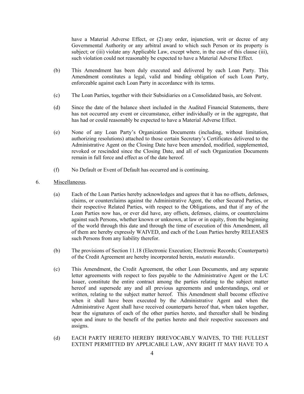 4 have a Material Adverse Effect, or (2) any order, injunction, writ or decree of any Governmental Authority or any arbitral award to which such Person or its property is subject; or (iii) violate any Applicable Law, except where, in the case of this clause (iii), such violation could not reasonably be expected to have a Material Adverse Effect. (b) This Amendment has been duly executed and delivered by each Loan Party. This Amendment constitutes a legal, valid and binding obligation of such Loan Party, enforceable against each Loan Party in accordance with its terms. (c) The Loan Parties, together with their Subsidiaries on a Consolidated basis, are Solvent. (d) Since the date of the balance sheet included in the Audited Financial Statements, there has not occurred any event or circumstance, either individually or in the aggregate, that has had or could reasonably be expected to have a Material Adverse Effect. (e) None of any Loan Party’s Organization Documents (including, without limitation, authorizing resolutions) attached to those certain Secretary’s Certificates delivered to the Administrative Agent on the Closing Date have been amended, modified, supplemented, revoked or rescinded since the Closing Date, and all of such Organization Documents remain in full force and effect as of the date hereof. (f) No Default or Event of Default has occurred and is continuing. 6. Miscellaneous. (a) Each of the Loan Parties hereby acknowledges and agrees that it has no offsets, defenses, claims, or counterclaims against the Administrative Agent, the other Secured Parties, or their respective Related Parties, with respect to the Obligations, and that if any of the Loan Parties now has, or ever did have, any offsets, defenses, claims, or counterclaims against such Persons, whether known or unknown, at law or in equity, from the beginning of the world through this date and through the time of execution of this Amendment, all of them are hereby expressly WAIVED, and each of the Loan Parties hereby RELEASES such Persons from any liability therefor. (b) The provisions of Section 11.18 (Electronic Execution; Electronic Records; Counterparts) of the Credit Agreement are hereby incorporated herein, mutatis mutandis. (c) This Amendment, the Credit Agreement, the other Loan Documents, and any separate letter agreements with respect to fees payable to the Administrative Agent or the L/C Issuer, constitute the entire contract among the parties relating to the subject matter hereof and supersede any and all previous agreements and understandings, oral or written, relating to the subject matter hereof. This Amendment shall become effective when it shall have been executed by the Administrative Agent and when the Administrative Agent shall have received counterparts hereof that, when taken together, bear the signatures of each of the other parties hereto, and thereafter shall be binding upon and inure to the benefit of the parties hereto and their respective successors and assigns. (d) EACH PARTY HERETO HEREBY IRREVOCABLY WAIVES, TO THE FULLEST EXTENT PERMITTED BY APPLICABLE LAW, ANY RIGHT IT MAY HAVE TO A