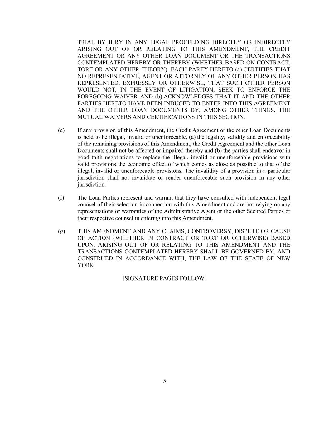 5 TRIAL BY JURY IN ANY LEGAL PROCEEDING DIRECTLY OR INDIRECTLY ARISING OUT OF OR RELATING TO THIS AMENDMENT, THE CREDIT AGREEMENT OR ANY OTHER LOAN DOCUMENT OR THE TRANSACTIONS CONTEMPLATED HEREBY OR THEREBY (WHETHER BASED ON CONTRACT, TORT OR ANY OTHER THEORY). EACH PARTY HERETO (a) CERTIFIES THAT NO REPRESENTATIVE, AGENT OR ATTORNEY OF ANY OTHER PERSON HAS REPRESENTED, EXPRESSLY OR OTHERWISE, THAT SUCH OTHER PERSON WOULD NOT, IN THE EVENT OF LITIGATION, SEEK TO ENFORCE THE FOREGOING WAIVER AND (b) ACKNOWLEDGES THAT IT AND THE OTHER PARTIES HERETO HAVE BEEN INDUCED TO ENTER INTO THIS AGREEMENT AND THE OTHER LOAN DOCUMENTS BY, AMONG OTHER THINGS, THE MUTUAL WAIVERS AND CERTIFICATIONS IN THIS SECTION. (e) If any provision of this Amendment, the Credit Agreement or the other Loan Documents is held to be illegal, invalid or unenforceable, (a) the legality, validity and enforceability of the remaining provisions of this Amendment, the Credit Agreement and the other Loan Documents shall not be affected or impaired thereby and (b) the parties shall endeavor in good faith negotiations to replace the illegal, invalid or unenforceable provisions with valid provisions the economic effect of which comes as close as possible to that of the illegal, invalid or unenforceable provisions. The invalidity of a provision in a particular jurisdiction shall not invalidate or render unenforceable such provision in any other jurisdiction. (f) The Loan Parties represent and warrant that they have consulted with independent legal counsel of their selection in connection with this Amendment and are not relying on any representations or warranties of the Administrative Agent or the other Secured Parties or their respective counsel in entering into this Amendment. (g) THIS AMENDMENT AND ANY CLAIMS, CONTROVERSY, DISPUTE OR CAUSE OF ACTION (WHETHER IN CONTRACT OR TORT OR OTHERWISE) BASED UPON, ARISING OUT OF OR RELATING TO THIS AMENDMENT AND THE TRANSACTIONS CONTEMPLATED HEREBY SHALL BE GOVERNED BY, AND CONSTRUED IN ACCORDANCE WITH, THE LAW OF THE STATE OF NEW YORK. [SIGNATURE PAGES FOLLOW]