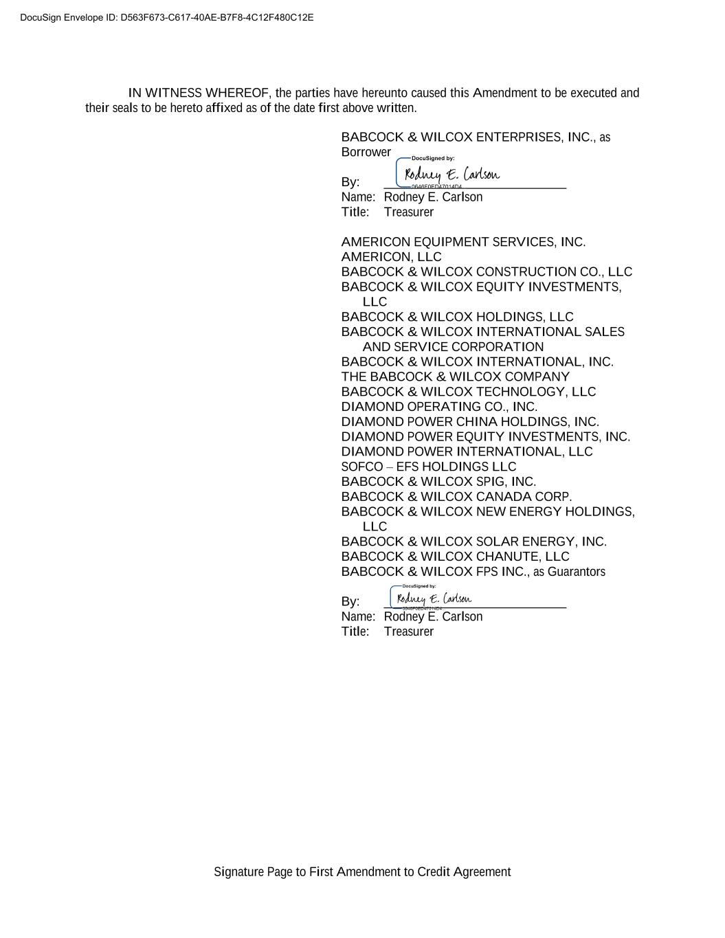 Signature Page to First Amendment to Credit Agreement IN WITNESS WHEREOF, the parties have hereunto caused this Amendment to be executed and their seals to be hereto affixed as of the date first above written. BABCOCK & WILCOX ENTERPRISES, INC., as Borrower By: ____________________________ Name: Rodney E. Carlson Title: Treasurer AMERICON EQUIPMENT SERVICES, INC. AMERICON, LLC BABCOCK & WILCOX CONSTRUCTION CO., LLC BABCOCK & WILCOX EQUITY INVESTMENTS, LLC BABCOCK & WILCOX HOLDINGS, LLC BABCOCK & WILCOX INTERNATIONAL SALES AND SERVICE CORPORATION BABCOCK & WILCOX INTERNATIONAL, INC. THE BABCOCK & WILCOX COMPANY BABCOCK & WILCOX TECHNOLOGY, LLC DIAMOND OPERATING CO., INC. DIAMOND POWER CHINA HOLDINGS, INC. DIAMOND POWER EQUITY INVESTMENTS, INC. DIAMOND POWER INTERNATIONAL, LLC SOFCO – EFS HOLDINGS LLC BABCOCK & WILCOX SPIG, INC. BABCOCK & WILCOX CANADA CORP. BABCOCK & WILCOX NEW ENERGY HOLDINGS, LLC BABCOCK & WILCOX SOLAR ENERGY, INC. BABCOCK & WILCOX CHANUTE, LLC BABCOCK & WILCOX FPS INC., as Guarantors By: ____________________________ Name: Rodney E. Carlson Title: Treasurer DocuSign Envelope ID: D563F673-C617-40AE-B7F8-4C12F480C12E