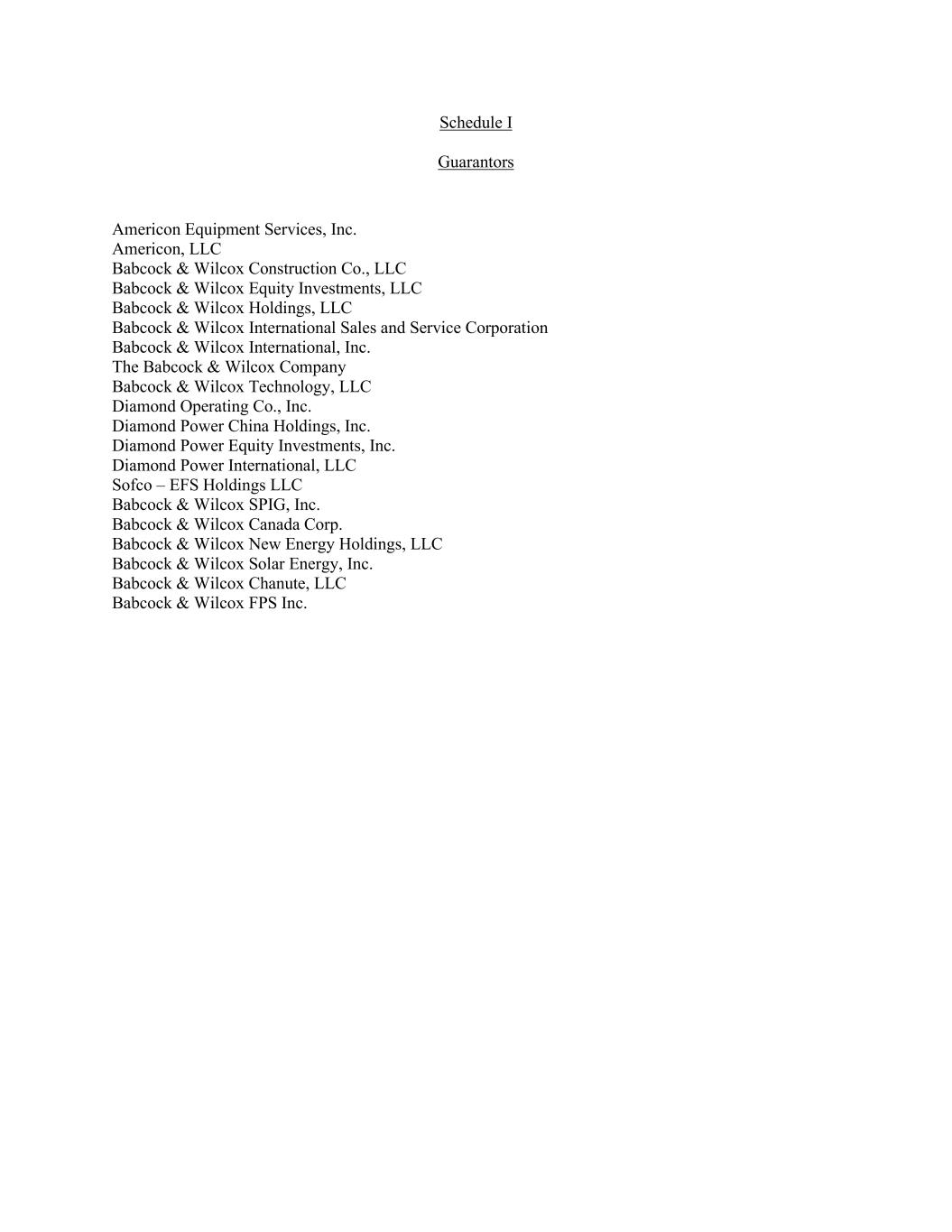 Schedule I Guarantors Americon Equipment Services, Inc. Americon, LLC Babcock & Wilcox Construction Co., LLC Babcock & Wilcox Equity Investments, LLC Babcock & Wilcox Holdings, LLC Babcock & Wilcox International Sales and Service Corporation Babcock & Wilcox International, Inc. The Babcock & Wilcox Company Babcock & Wilcox Technology, LLC Diamond Operating Co., Inc. Diamond Power China Holdings, Inc. Diamond Power Equity Investments, Inc. Diamond Power International, LLC Sofco – EFS Holdings LLC Babcock & Wilcox SPIG, Inc. Babcock & Wilcox Canada Corp. Babcock & Wilcox New Energy Holdings, LLC Babcock & Wilcox Solar Energy, Inc. Babcock & Wilcox Chanute, LLC Babcock & Wilcox FPS Inc.