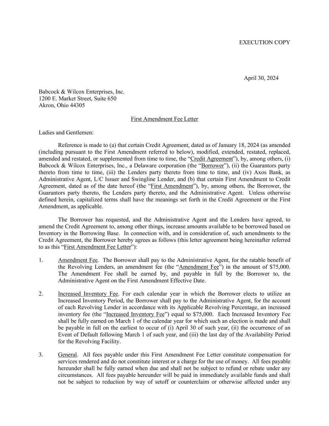 EXECUTION COPY April 30, 2024 Babcock & Wilcox Enterprises, Inc. 1200 E. Market Street, Suite 650 Akron, Ohio 44305 First Amendment Fee Letter Ladies and Gentlemen: Reference is made to (a) that certain Credit Agreement, dated as of January 18, 2024 (as amended (including pursuant to the First Amendment referred to below), modified, extended, restated, replaced, amended and restated, or supplemented from time to time, the “Credit Agreement”), by, among others, (i) Babcock & Wilcox Enterprises, Inc., a Delaware corporation (the “Borrower”), (ii) the Guarantors party thereto from time to time, (iii) the Lenders party thereto from time to time, and (iv) Axos Bank, as Administrative Agent, L/C Issuer and Swingline Lender, and (b) that certain First Amendment to Credit Agreement, dated as of the date hereof (the “First Amendment”), by, among others, the Borrower, the Guarantors party thereto, the Lenders party thereto, and the Administrative Agent. Unless otherwise defined herein, capitalized terms shall have the meanings set forth in the Credit Agreement or the First Amendment, as applicable. The Borrower has requested, and the Administrative Agent and the Lenders have agreed, to amend the Credit Agreement to, among other things, increase amounts available to be borrowed based on Inventory in the Borrowing Base. In connection with, and in consideration of, such amendments to the Credit Agreement, the Borrower hereby agrees as follows (this letter agreement being hereinafter referred to as this “First Amendment Fee Letter”): 1. Amendment Fee. The Borrower shall pay to the Administrative Agent, for the ratable benefit of the Revolving Lenders, an amendment fee (the “Amendment Fee”) in the amount of $75,000. The Amendment Fee shall be earned by, and payable in full by the Borrower to, the Administrative Agent on the First Amendment Effective Date. 2. Increased Inventory Fee. For each calendar year in which the Borrower elects to utilize an Increased Inventory Period, the Borrower shall pay to the Administrative Agent, for the account of each Revolving Lender in accordance with its Applicable Revolving Percentage, an increased inventory fee (the “Increased Inventory Fee”) equal to $75,000. Each Increased Inventory Fee shall be fully earned on March 1 of the calendar year for which such an election is made and shall be payable in full on the earliest to occur of (i) April 30 of such year, (ii) the occurrence of an Event of Default following March 1 of such year, and (iii) the last day of the Availability Period for the Revolving Facility. 3. General. All fees payable under this First Amendment Fee Letter constitute compensation for services rendered and do not constitute interest or a charge for the use of money. All fees payable hereunder shall be fully earned when due and shall not be subject to refund or rebate under any circumstances. All fees payable hereunder will be paid in immediately available funds and shall not be subject to reduction by way of setoff or counterclaim or otherwise affected under any