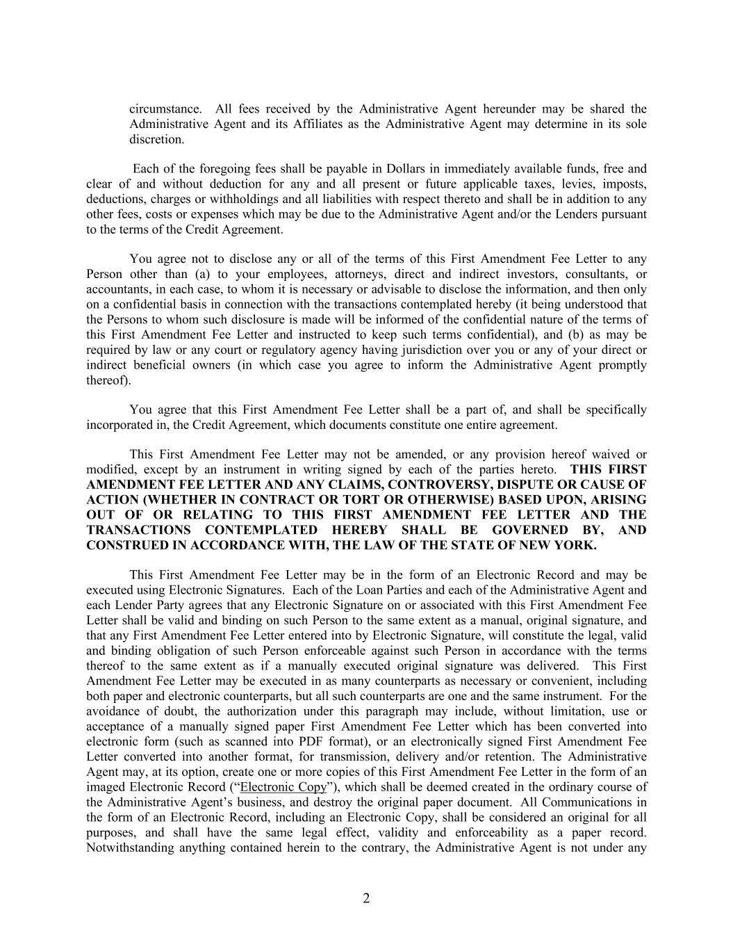 2 circumstance. All fees received by the Administrative Agent hereunder may be shared the Administrative Agent and its Affiliates as the Administrative Agent may determine in its sole discretion. Each of the foregoing fees shall be payable in Dollars in immediately available funds, free and clear of and without deduction for any and all present or future applicable taxes, levies, imposts, deductions, charges or withholdings and all liabilities with respect thereto and shall be in addition to any other fees, costs or expenses which may be due to the Administrative Agent and/or the Lenders pursuant to the terms of the Credit Agreement. You agree not to disclose any or all of the terms of this First Amendment Fee Letter to any Person other than (a) to your employees, attorneys, direct and indirect investors, consultants, or accountants, in each case, to whom it is necessary or advisable to disclose the information, and then only on a confidential basis in connection with the transactions contemplated hereby (it being understood that the Persons to whom such disclosure is made will be informed of the confidential nature of the terms of this First Amendment Fee Letter and instructed to keep such terms confidential), and (b) as may be required by law or any court or regulatory agency having jurisdiction over you or any of your direct or indirect beneficial owners (in which case you agree to inform the Administrative Agent promptly thereof). You agree that this First Amendment Fee Letter shall be a part of, and shall be specifically incorporated in, the Credit Agreement, which documents constitute one entire agreement. This First Amendment Fee Letter may not be amended, or any provision hereof waived or modified, except by an instrument in writing signed by each of the parties hereto. THIS FIRST AMENDMENT FEE LETTER AND ANY CLAIMS, CONTROVERSY, DISPUTE OR CAUSE OF ACTION (WHETHER IN CONTRACT OR TORT OR OTHERWISE) BASED UPON, ARISING OUT OF OR RELATING TO THIS FIRST AMENDMENT FEE LETTER AND THE TRANSACTIONS CONTEMPLATED HEREBY SHALL BE GOVERNED BY, AND CONSTRUED IN ACCORDANCE WITH, THE LAW OF THE STATE OF NEW YORK. This First Amendment Fee Letter may be in the form of an Electronic Record and may be executed using Electronic Signatures. Each of the Loan Parties and each of the Administrative Agent and each Lender Party agrees that any Electronic Signature on or associated with this First Amendment Fee Letter shall be valid and binding on such Person to the same extent as a manual, original signature, and that any First Amendment Fee Letter entered into by Electronic Signature, will constitute the legal, valid and binding obligation of such Person enforceable against such Person in accordance with the terms thereof to the same extent as if a manually executed original signature was delivered. This First Amendment Fee Letter may be executed in as many counterparts as necessary or convenient, including both paper and electronic counterparts, but all such counterparts are one and the same instrument. For the avoidance of doubt, the authorization under this paragraph may include, without limitation, use or acceptance of a manually signed paper First Amendment Fee Letter which has been converted into electronic form (such as scanned into PDF format), or an electronically signed First Amendment Fee Letter converted into another format, for transmission, delivery and/or retention. The Administrative Agent may, at its option, create one or more copies of this First Amendment Fee Letter in the form of an imaged Electronic Record (“Electronic Copy”), which shall be deemed created in the ordinary course of the Administrative Agent’s business, and destroy the original paper document. All Communications in the form of an Electronic Record, including an Electronic Copy, shall be considered an original for all purposes, and shall have the same legal effect, validity and enforceability as a paper record. Notwithstanding anything contained herein to the contrary, the Administrative Agent is not under any
