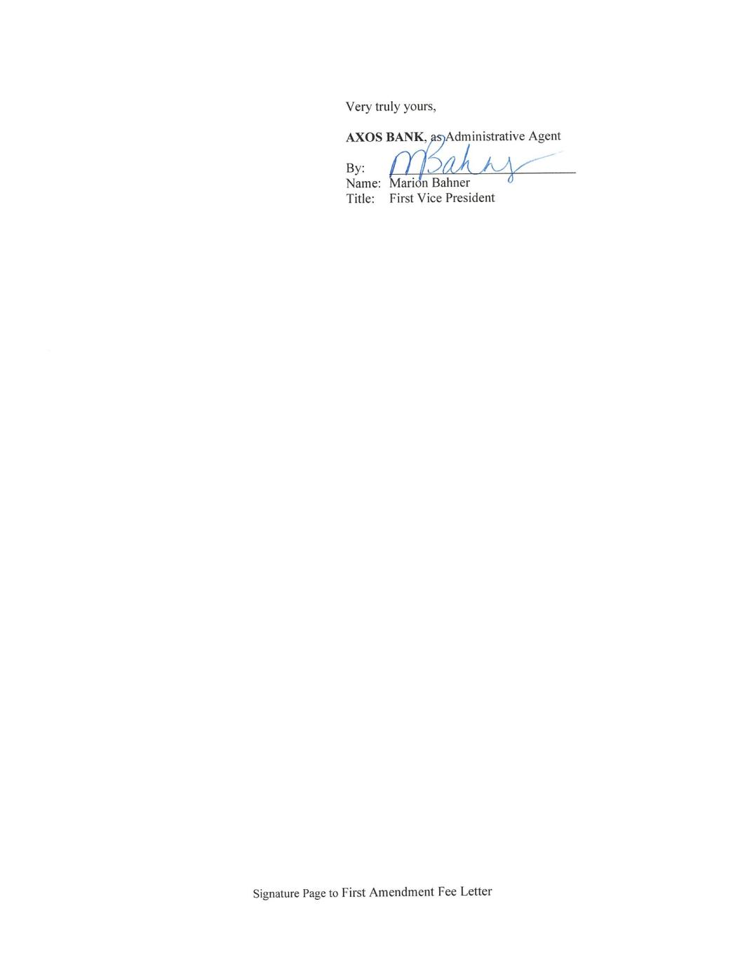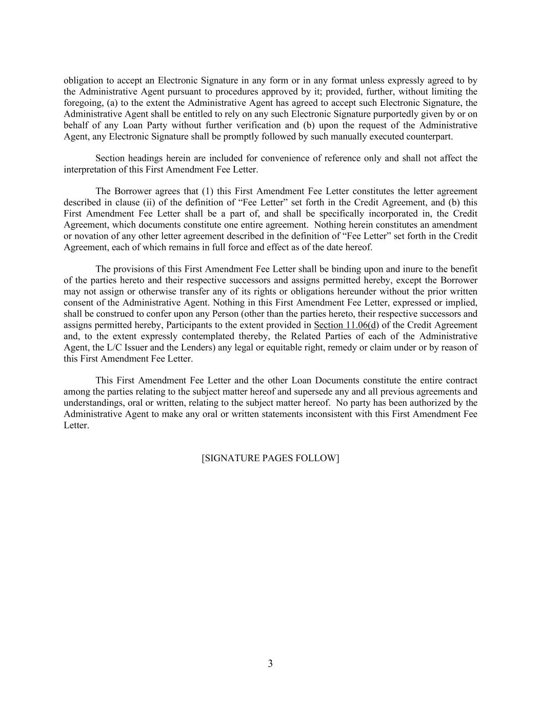 3 obligation to accept an Electronic Signature in any form or in any format unless expressly agreed to by the Administrative Agent pursuant to procedures approved by it; provided, further, without limiting the foregoing, (a) to the extent the Administrative Agent has agreed to accept such Electronic Signature, the Administrative Agent shall be entitled to rely on any such Electronic Signature purportedly given by or on behalf of any Loan Party without further verification and (b) upon the request of the Administrative Agent, any Electronic Signature shall be promptly followed by such manually executed counterpart. Section headings herein are included for convenience of reference only and shall not affect the interpretation of this First Amendment Fee Letter. The Borrower agrees that (1) this First Amendment Fee Letter constitutes the letter agreement described in clause (ii) of the definition of “Fee Letter” set forth in the Credit Agreement, and (b) this First Amendment Fee Letter shall be a part of, and shall be specifically incorporated in, the Credit Agreement, which documents constitute one entire agreement. Nothing herein constitutes an amendment or novation of any other letter agreement described in the definition of “Fee Letter” set forth in the Credit Agreement, each of which remains in full force and effect as of the date hereof. The provisions of this First Amendment Fee Letter shall be binding upon and inure to the benefit of the parties hereto and their respective successors and assigns permitted hereby, except the Borrower may not assign or otherwise transfer any of its rights or obligations hereunder without the prior written consent of the Administrative Agent. Nothing in this First Amendment Fee Letter, expressed or implied, shall be construed to confer upon any Person (other than the parties hereto, their respective successors and assigns permitted hereby, Participants to the extent provided in Section 11.06(d) of the Credit Agreement and, to the extent expressly contemplated thereby, the Related Parties of each of the Administrative Agent, the L/C Issuer and the Lenders) any legal or equitable right, remedy or claim under or by reason of this First Amendment Fee Letter. This First Amendment Fee Letter and the other Loan Documents constitute the entire contract among the parties relating to the subject matter hereof and supersede any and all previous agreements and understandings, oral or written, relating to the subject matter hereof. No party has been authorized by the Administrative Agent to make any oral or written statements inconsistent with this First Amendment Fee Letter. [SIGNATURE PAGES FOLLOW]