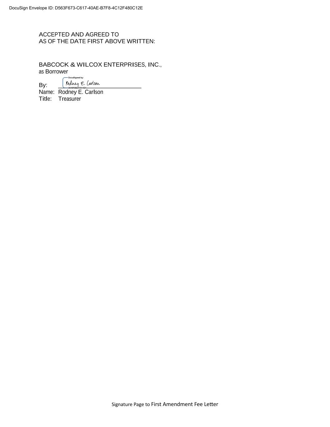 Signature Page to First Amendment Fee Letter ACCEPTED AND AGREED TO AS OF THE DATE FIRST ABOVE WRITTEN: BABCOCK & WILCOX ENTERPRISES, INC., as Borrower By: ____________________________ Name: Rodney E. Carlson Title: Treasurer DocuSign Envelope ID: D563F673-C617-40AE-B7F8-4C12F480C12E