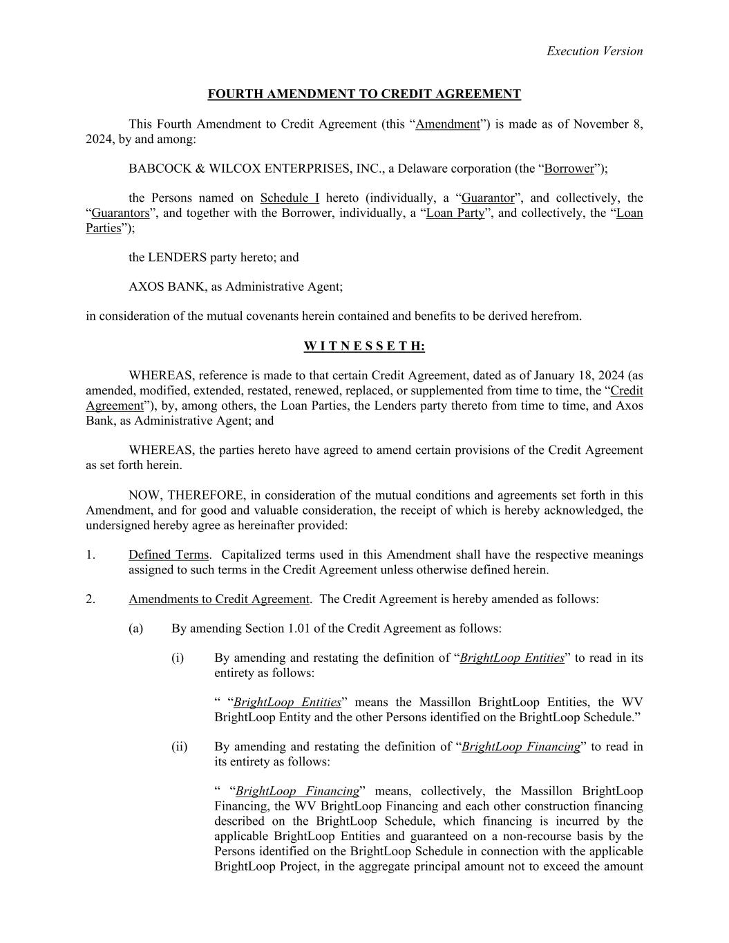 Execution Version FOURTH AMENDMENT TO CREDIT AGREEMENT This Fourth Amendment to Credit Agreement (this “Amendment”) is made as of November 8, 2024, by and among: BABCOCK & WILCOX ENTERPRISES, INC., a Delaware corporation (the “Borrower”); the Persons named on Schedule I hereto (individually, a “Guarantor”, and collectively, the “Guarantors”, and together with the Borrower, individually, a “Loan Party”, and collectively, the “Loan Parties”); the LENDERS party hereto; and AXOS BANK, as Administrative Agent; in consideration of the mutual covenants herein contained and benefits to be derived herefrom. W I T N E S S E T H: WHEREAS, reference is made to that certain Credit Agreement, dated as of January 18, 2024 (as amended, modified, extended, restated, renewed, replaced, or supplemented from time to time, the “Credit Agreement”), by, among others, the Loan Parties, the Lenders party thereto from time to time, and Axos Bank, as Administrative Agent; and WHEREAS, the parties hereto have agreed to amend certain provisions of the Credit Agreement as set forth herein. NOW, THEREFORE, in consideration of the mutual conditions and agreements set forth in this Amendment, and for good and valuable consideration, the receipt of which is hereby acknowledged, the undersigned hereby agree as hereinafter provided: 1. Defined Terms. Capitalized terms used in this Amendment shall have the respective meanings assigned to such terms in the Credit Agreement unless otherwise defined herein. 2. Amendments to Credit Agreement. The Credit Agreement is hereby amended as follows: (a) By amending Section 1.01 of the Credit Agreement as follows: (i) By amending and restating the definition of “BrightLoop Entities” to read in its entirety as follows: “ “BrightLoop Entities” means the Massillon BrightLoop Entities, the WV BrightLoop Entity and the other Persons identified on the BrightLoop Schedule.” (ii) By amending and restating the definition of “BrightLoop Financing” to read in its entirety as follows: “ “BrightLoop Financing” means, collectively, the Massillon BrightLoop Financing, the WV BrightLoop Financing and each other construction financing described on the BrightLoop Schedule, which financing is incurred by the applicable BrightLoop Entities and guaranteed on a non-recourse basis by the Persons identified on the BrightLoop Schedule in connection with the applicable BrightLoop Project, in the aggregate principal amount not to exceed the amount