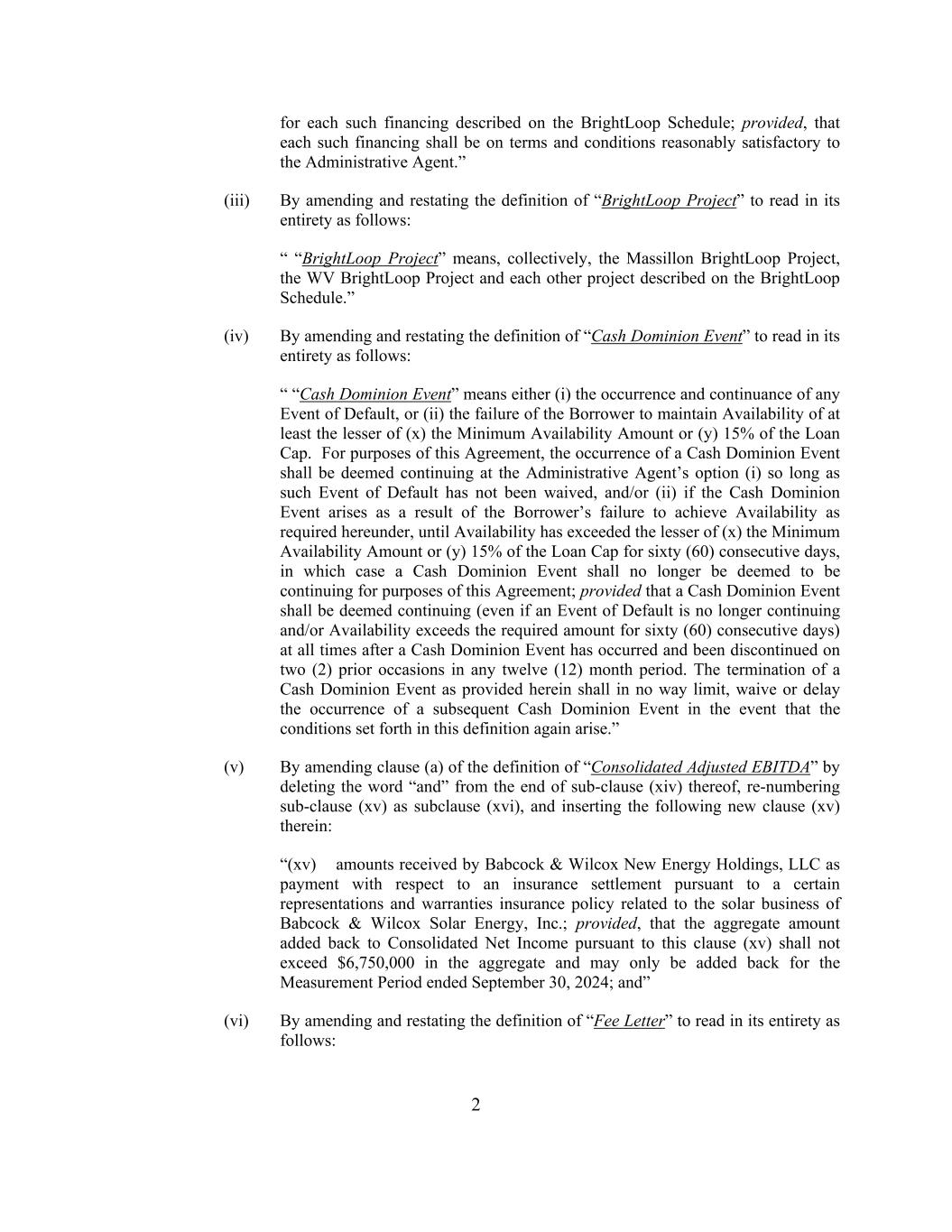 2 for each such financing described on the BrightLoop Schedule; provided, that each such financing shall be on terms and conditions reasonably satisfactory to the Administrative Agent.” (iii) By amending and restating the definition of “BrightLoop Project” to read in its entirety as follows: “ “BrightLoop Project” means, collectively, the Massillon BrightLoop Project, the WV BrightLoop Project and each other project described on the BrightLoop Schedule.” (iv) By amending and restating the definition of “Cash Dominion Event” to read in its entirety as follows: “ “Cash Dominion Event” means either (i) the occurrence and continuance of any Event of Default, or (ii) the failure of the Borrower to maintain Availability of at least the lesser of (x) the Minimum Availability Amount or (y) 15% of the Loan Cap. For purposes of this Agreement, the occurrence of a Cash Dominion Event shall be deemed continuing at the Administrative Agent’s option (i) so long as such Event of Default has not been waived, and/or (ii) if the Cash Dominion Event arises as a result of the Borrower’s failure to achieve Availability as required hereunder, until Availability has exceeded the lesser of (x) the Minimum Availability Amount or (y) 15% of the Loan Cap for sixty (60) consecutive days, in which case a Cash Dominion Event shall no longer be deemed to be continuing for purposes of this Agreement; provided that a Cash Dominion Event shall be deemed continuing (even if an Event of Default is no longer continuing and/or Availability exceeds the required amount for sixty (60) consecutive days) at all times after a Cash Dominion Event has occurred and been discontinued on two (2) prior occasions in any twelve (12) month period. The termination of a Cash Dominion Event as provided herein shall in no way limit, waive or delay the occurrence of a subsequent Cash Dominion Event in the event that the conditions set forth in this definition again arise.” (v) By amending clause (a) of the definition of “Consolidated Adjusted EBITDA” by deleting the word “and” from the end of sub-clause (xiv) thereof, re-numbering sub-clause (xv) as subclause (xvi), and inserting the following new clause (xv) therein: “(xv) amounts received by Babcock & Wilcox New Energy Holdings, LLC as payment with respect to an insurance settlement pursuant to a certain representations and warranties insurance policy related to the solar business of Babcock & Wilcox Solar Energy, Inc.; provided, that the aggregate amount added back to Consolidated Net Income pursuant to this clause (xv) shall not exceed $6,750,000 in the aggregate and may only be added back for the Measurement Period ended September 30, 2024; and” (vi) By amending and restating the definition of “Fee Letter” to read in its entirety as follows: