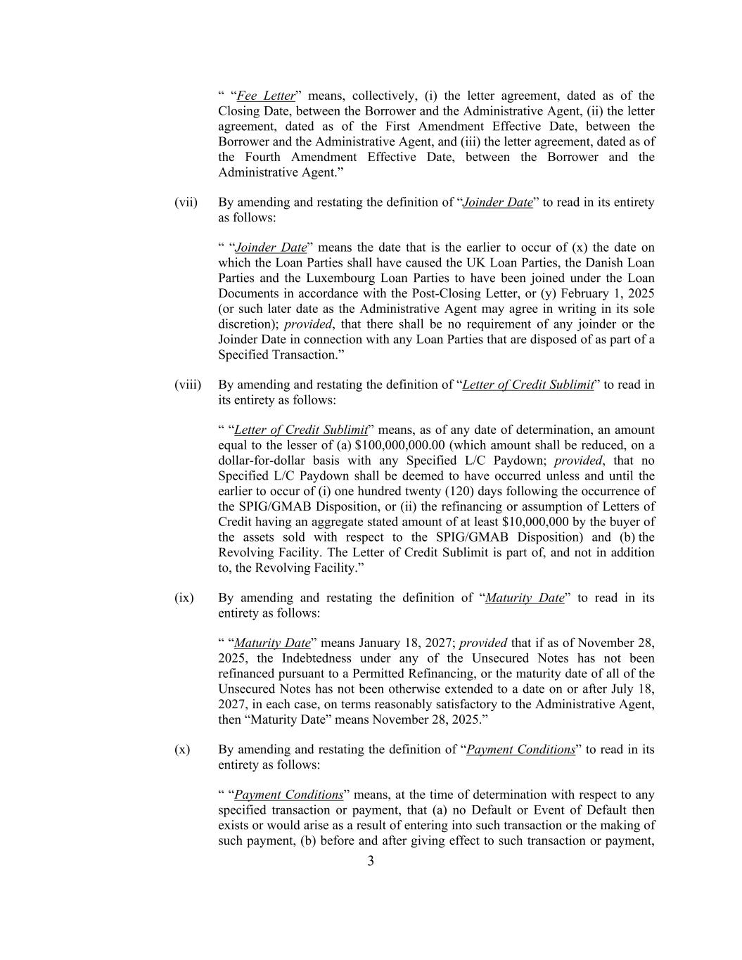3 “ “Fee Letter” means, collectively, (i) the letter agreement, dated as of the Closing Date, between the Borrower and the Administrative Agent, (ii) the letter agreement, dated as of the First Amendment Effective Date, between the Borrower and the Administrative Agent, and (iii) the letter agreement, dated as of the Fourth Amendment Effective Date, between the Borrower and the Administrative Agent.” (vii) By amending and restating the definition of “Joinder Date” to read in its entirety as follows: “ “Joinder Date” means the date that is the earlier to occur of (x) the date on which the Loan Parties shall have caused the UK Loan Parties, the Danish Loan Parties and the Luxembourg Loan Parties to have been joined under the Loan Documents in accordance with the Post-Closing Letter, or (y) February 1, 2025 (or such later date as the Administrative Agent may agree in writing in its sole discretion); provided, that there shall be no requirement of any joinder or the Joinder Date in connection with any Loan Parties that are disposed of as part of a Specified Transaction.” (viii) By amending and restating the definition of “Letter of Credit Sublimit” to read in its entirety as follows: “ “Letter of Credit Sublimit” means, as of any date of determination, an amount equal to the lesser of (a) $100,000,000.00 (which amount shall be reduced, on a dollar-for-dollar basis with any Specified L/C Paydown; provided, that no Specified L/C Paydown shall be deemed to have occurred unless and until the earlier to occur of (i) one hundred twenty (120) days following the occurrence of the SPIG/GMAB Disposition, or (ii) the refinancing or assumption of Letters of Credit having an aggregate stated amount of at least $10,000,000 by the buyer of the assets sold with respect to the SPIG/GMAB Disposition) and (b) the Revolving Facility. The Letter of Credit Sublimit is part of, and not in addition to, the Revolving Facility.” (ix) By amending and restating the definition of “Maturity Date” to read in its entirety as follows: “ “Maturity Date” means January 18, 2027; provided that if as of November 28, 2025, the Indebtedness under any of the Unsecured Notes has not been refinanced pursuant to a Permitted Refinancing, or the maturity date of all of the Unsecured Notes has not been otherwise extended to a date on or after July 18, 2027, in each case, on terms reasonably satisfactory to the Administrative Agent, then “Maturity Date” means November 28, 2025.” (x) By amending and restating the definition of “Payment Conditions” to read in its entirety as follows: “ “Payment Conditions” means, at the time of determination with respect to any specified transaction or payment, that (a) no Default or Event of Default then exists or would arise as a result of entering into such transaction or the making of such payment, (b) before and after giving effect to such transaction or payment,