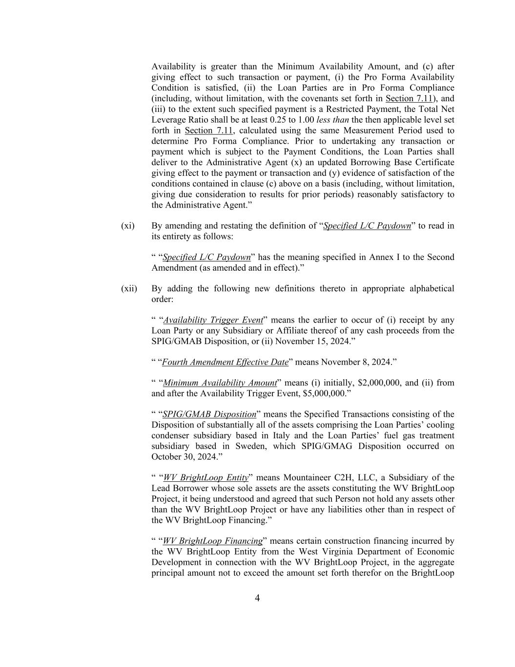 4 Availability is greater than the Minimum Availability Amount, and (c) after giving effect to such transaction or payment, (i) the Pro Forma Availability Condition is satisfied, (ii) the Loan Parties are in Pro Forma Compliance (including, without limitation, with the covenants set forth in Section 7.11), and (iii) to the extent such specified payment is a Restricted Payment, the Total Net Leverage Ratio shall be at least 0.25 to 1.00 less than the then applicable level set forth in Section 7.11, calculated using the same Measurement Period used to determine Pro Forma Compliance. Prior to undertaking any transaction or payment which is subject to the Payment Conditions, the Loan Parties shall deliver to the Administrative Agent (x) an updated Borrowing Base Certificate giving effect to the payment or transaction and (y) evidence of satisfaction of the conditions contained in clause (c) above on a basis (including, without limitation, giving due consideration to results for prior periods) reasonably satisfactory to the Administrative Agent.” (xi) By amending and restating the definition of “Specified L/C Paydown” to read in its entirety as follows: “ “Specified L/C Paydown” has the meaning specified in Annex I to the Second Amendment (as amended and in effect).” (xii) By adding the following new definitions thereto in appropriate alphabetical order: “ “Availability Trigger Event” means the earlier to occur of (i) receipt by any Loan Party or any Subsidiary or Affiliate thereof of any cash proceeds from the SPIG/GMAB Disposition, or (ii) November 15, 2024.” “ “Fourth Amendment Effective Date” means November 8, 2024.” “ “Minimum Availability Amount” means (i) initially, $2,000,000, and (ii) from and after the Availability Trigger Event, $5,000,000.” “ “SPIG/GMAB Disposition” means the Specified Transactions consisting of the Disposition of substantially all of the assets comprising the Loan Parties’ cooling condenser subsidiary based in Italy and the Loan Parties’ fuel gas treatment subsidiary based in Sweden, which SPIG/GMAG Disposition occurred on October 30, 2024.” “ “WV BrightLoop Entity” means Mountaineer C2H, LLC, a Subsidiary of the Lead Borrower whose sole assets are the assets constituting the WV BrightLoop Project, it being understood and agreed that such Person not hold any assets other than the WV BrightLoop Project or have any liabilities other than in respect of the WV BrightLoop Financing.” “ “WV BrightLoop Financing” means certain construction financing incurred by the WV BrightLoop Entity from the West Virginia Department of Economic Development in connection with the WV BrightLoop Project, in the aggregate principal amount not to exceed the amount set forth therefor on the BrightLoop
