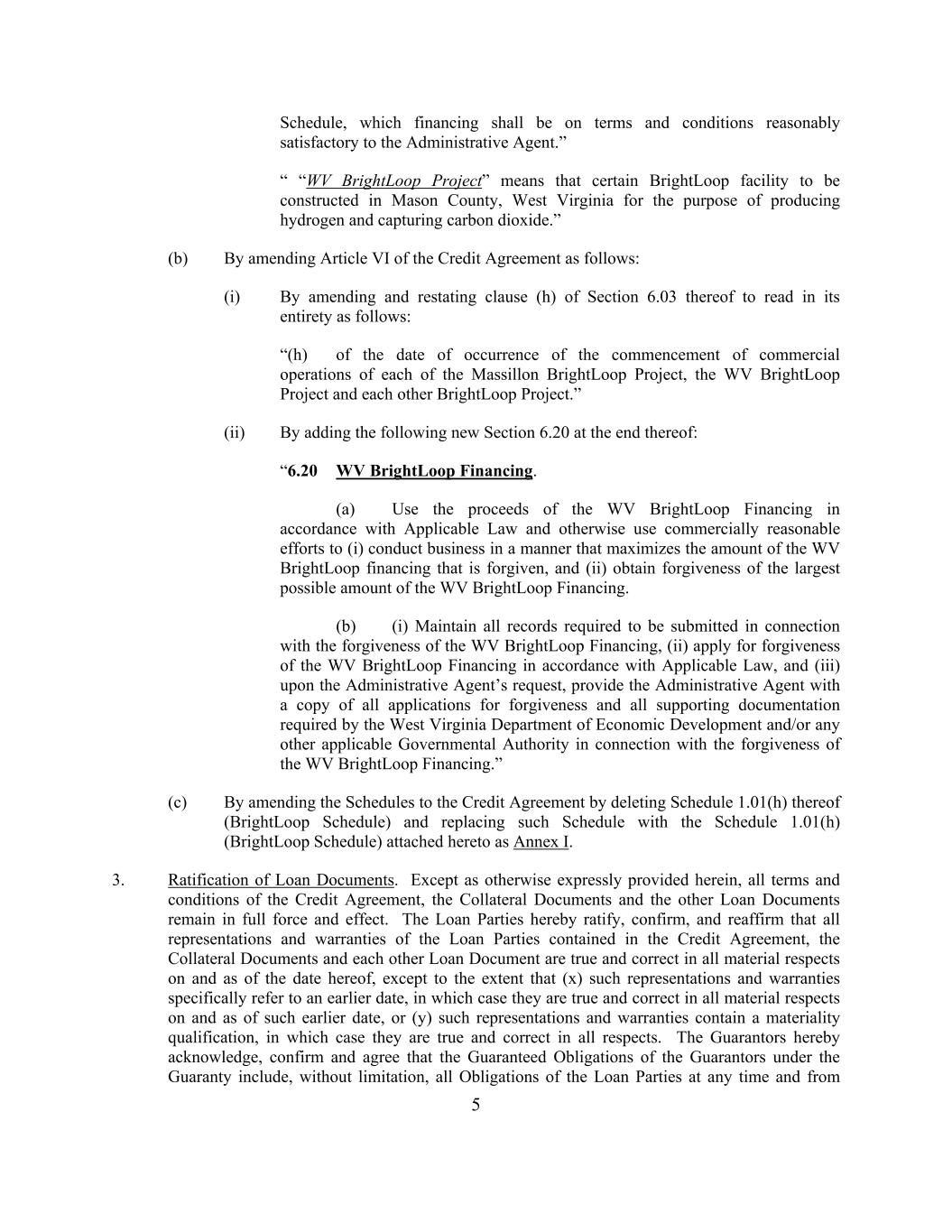 5 Schedule, which financing shall be on terms and conditions reasonably satisfactory to the Administrative Agent.” “ “WV BrightLoop Project” means that certain BrightLoop facility to be constructed in Mason County, West Virginia for the purpose of producing hydrogen and capturing carbon dioxide.” (b) By amending Article VI of the Credit Agreement as follows: (i) By amending and restating clause (h) of Section 6.03 thereof to read in its entirety as follows: “(h) of the date of occurrence of the commencement of commercial operations of each of the Massillon BrightLoop Project, the WV BrightLoop Project and each other BrightLoop Project.” (ii) By adding the following new Section 6.20 at the end thereof: “6.20 WV BrightLoop Financing. (a) Use the proceeds of the WV BrightLoop Financing in accordance with Applicable Law and otherwise use commercially reasonable efforts to (i) conduct business in a manner that maximizes the amount of the WV BrightLoop financing that is forgiven, and (ii) obtain forgiveness of the largest possible amount of the WV BrightLoop Financing. (b) (i) Maintain all records required to be submitted in connection with the forgiveness of the WV BrightLoop Financing, (ii) apply for forgiveness of the WV BrightLoop Financing in accordance with Applicable Law, and (iii) upon the Administrative Agent’s request, provide the Administrative Agent with a copy of all applications for forgiveness and all supporting documentation required by the West Virginia Department of Economic Development and/or any other applicable Governmental Authority in connection with the forgiveness of the WV BrightLoop Financing.” (c) By amending the Schedules to the Credit Agreement by deleting Schedule 1.01(h) thereof (BrightLoop Schedule) and replacing such Schedule with the Schedule 1.01(h) (BrightLoop Schedule) attached hereto as Annex I. 3. Ratification of Loan Documents. Except as otherwise expressly provided herein, all terms and conditions of the Credit Agreement, the Collateral Documents and the other Loan Documents remain in full force and effect. The Loan Parties hereby ratify, confirm, and reaffirm that all representations and warranties of the Loan Parties contained in the Credit Agreement, the Collateral Documents and each other Loan Document are true and correct in all material respects on and as of the date hereof, except to the extent that (x) such representations and warranties specifically refer to an earlier date, in which case they are true and correct in all material respects on and as of such earlier date, or (y) such representations and warranties contain a materiality qualification, in which case they are true and correct in all respects. The Guarantors hereby acknowledge, confirm and agree that the Guaranteed Obligations of the Guarantors under the Guaranty include, without limitation, all Obligations of the Loan Parties at any time and from