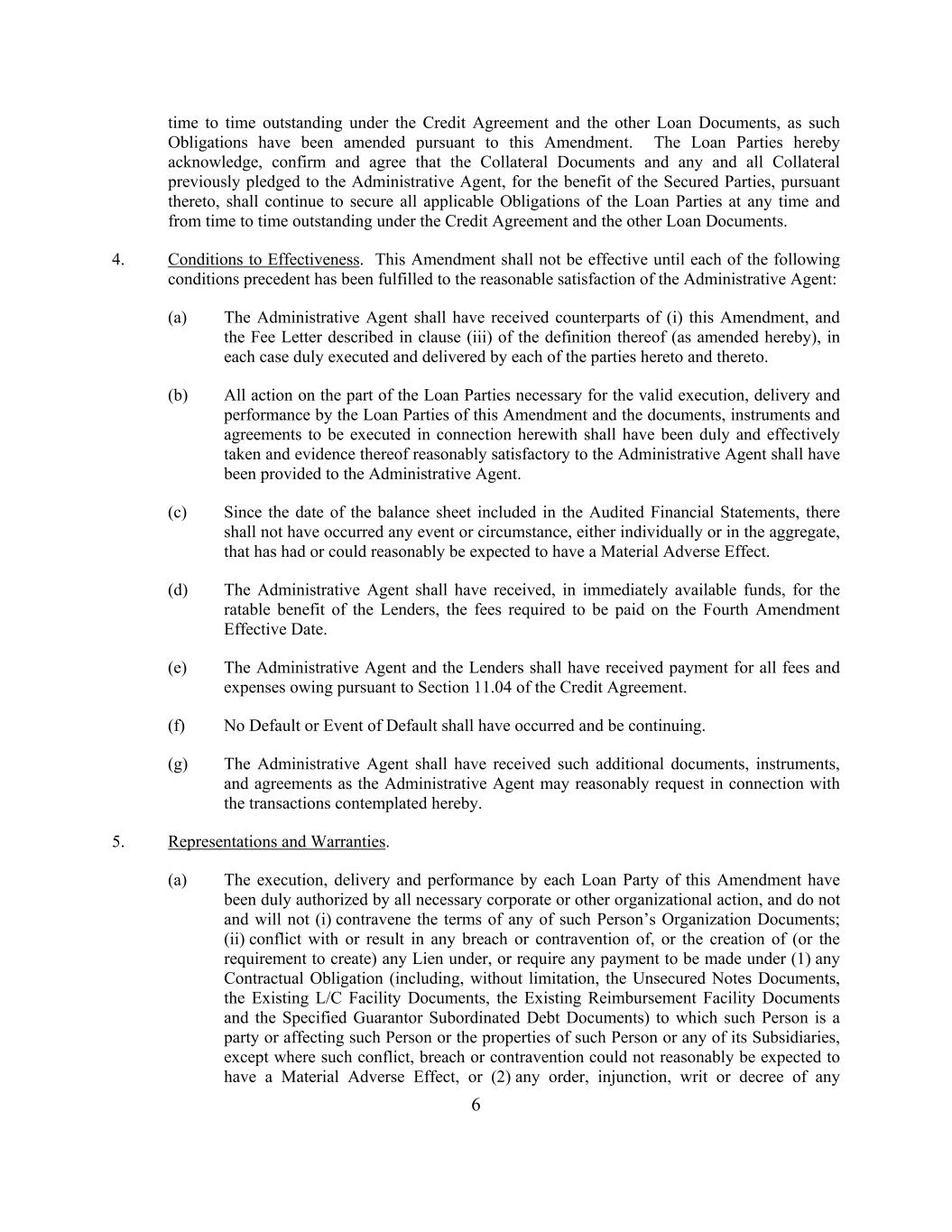 6 time to time outstanding under the Credit Agreement and the other Loan Documents, as such Obligations have been amended pursuant to this Amendment. The Loan Parties hereby acknowledge, confirm and agree that the Collateral Documents and any and all Collateral previously pledged to the Administrative Agent, for the benefit of the Secured Parties, pursuant thereto, shall continue to secure all applicable Obligations of the Loan Parties at any time and from time to time outstanding under the Credit Agreement and the other Loan Documents. 4. Conditions to Effectiveness. This Amendment shall not be effective until each of the following conditions precedent has been fulfilled to the reasonable satisfaction of the Administrative Agent: (a) The Administrative Agent shall have received counterparts of (i) this Amendment, and the Fee Letter described in clause (iii) of the definition thereof (as amended hereby), in each case duly executed and delivered by each of the parties hereto and thereto. (b) All action on the part of the Loan Parties necessary for the valid execution, delivery and performance by the Loan Parties of this Amendment and the documents, instruments and agreements to be executed in connection herewith shall have been duly and effectively taken and evidence thereof reasonably satisfactory to the Administrative Agent shall have been provided to the Administrative Agent. (c) Since the date of the balance sheet included in the Audited Financial Statements, there shall not have occurred any event or circumstance, either individually or in the aggregate, that has had or could reasonably be expected to have a Material Adverse Effect. (d) The Administrative Agent shall have received, in immediately available funds, for the ratable benefit of the Lenders, the fees required to be paid on the Fourth Amendment Effective Date. (e) The Administrative Agent and the Lenders shall have received payment for all fees and expenses owing pursuant to Section 11.04 of the Credit Agreement. (f) No Default or Event of Default shall have occurred and be continuing. (g) The Administrative Agent shall have received such additional documents, instruments, and agreements as the Administrative Agent may reasonably request in connection with the transactions contemplated hereby. 5. Representations and Warranties. (a) The execution, delivery and performance by each Loan Party of this Amendment have been duly authorized by all necessary corporate or other organizational action, and do not and will not (i) contravene the terms of any of such Person’s Organization Documents; (ii) conflict with or result in any breach or contravention of, or the creation of (or the requirement to create) any Lien under, or require any payment to be made under (1) any Contractual Obligation (including, without limitation, the Unsecured Notes Documents, the Existing L/C Facility Documents, the Existing Reimbursement Facility Documents and the Specified Guarantor Subordinated Debt Documents) to which such Person is a party or affecting such Person or the properties of such Person or any of its Subsidiaries, except where such conflict, breach or contravention could not reasonably be expected to have a Material Adverse Effect, or (2) any order, injunction, writ or decree of any