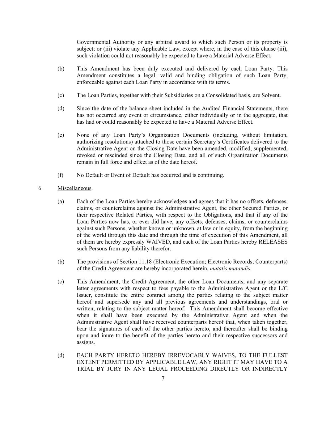 7 Governmental Authority or any arbitral award to which such Person or its property is subject; or (iii) violate any Applicable Law, except where, in the case of this clause (iii), such violation could not reasonably be expected to have a Material Adverse Effect. (b) This Amendment has been duly executed and delivered by each Loan Party. This Amendment constitutes a legal, valid and binding obligation of such Loan Party, enforceable against each Loan Party in accordance with its terms. (c) The Loan Parties, together with their Subsidiaries on a Consolidated basis, are Solvent. (d) Since the date of the balance sheet included in the Audited Financial Statements, there has not occurred any event or circumstance, either individually or in the aggregate, that has had or could reasonably be expected to have a Material Adverse Effect. (e) None of any Loan Party’s Organization Documents (including, without limitation, authorizing resolutions) attached to those certain Secretary’s Certificates delivered to the Administrative Agent on the Closing Date have been amended, modified, supplemented, revoked or rescinded since the Closing Date, and all of such Organization Documents remain in full force and effect as of the date hereof. (f) No Default or Event of Default has occurred and is continuing. 6. Miscellaneous. (a) Each of the Loan Parties hereby acknowledges and agrees that it has no offsets, defenses, claims, or counterclaims against the Administrative Agent, the other Secured Parties, or their respective Related Parties, with respect to the Obligations, and that if any of the Loan Parties now has, or ever did have, any offsets, defenses, claims, or counterclaims against such Persons, whether known or unknown, at law or in equity, from the beginning of the world through this date and through the time of execution of this Amendment, all of them are hereby expressly WAIVED, and each of the Loan Parties hereby RELEASES such Persons from any liability therefor. (b) The provisions of Section 11.18 (Electronic Execution; Electronic Records; Counterparts) of the Credit Agreement are hereby incorporated herein, mutatis mutandis. (c) This Amendment, the Credit Agreement, the other Loan Documents, and any separate letter agreements with respect to fees payable to the Administrative Agent or the L/C Issuer, constitute the entire contract among the parties relating to the subject matter hereof and supersede any and all previous agreements and understandings, oral or written, relating to the subject matter hereof. This Amendment shall become effective when it shall have been executed by the Administrative Agent and when the Administrative Agent shall have received counterparts hereof that, when taken together, bear the signatures of each of the other parties hereto, and thereafter shall be binding upon and inure to the benefit of the parties hereto and their respective successors and assigns. (d) EACH PARTY HERETO HEREBY IRREVOCABLY WAIVES, TO THE FULLEST EXTENT PERMITTED BY APPLICABLE LAW, ANY RIGHT IT MAY HAVE TO A TRIAL BY JURY IN ANY LEGAL PROCEEDING DIRECTLY OR INDIRECTLY