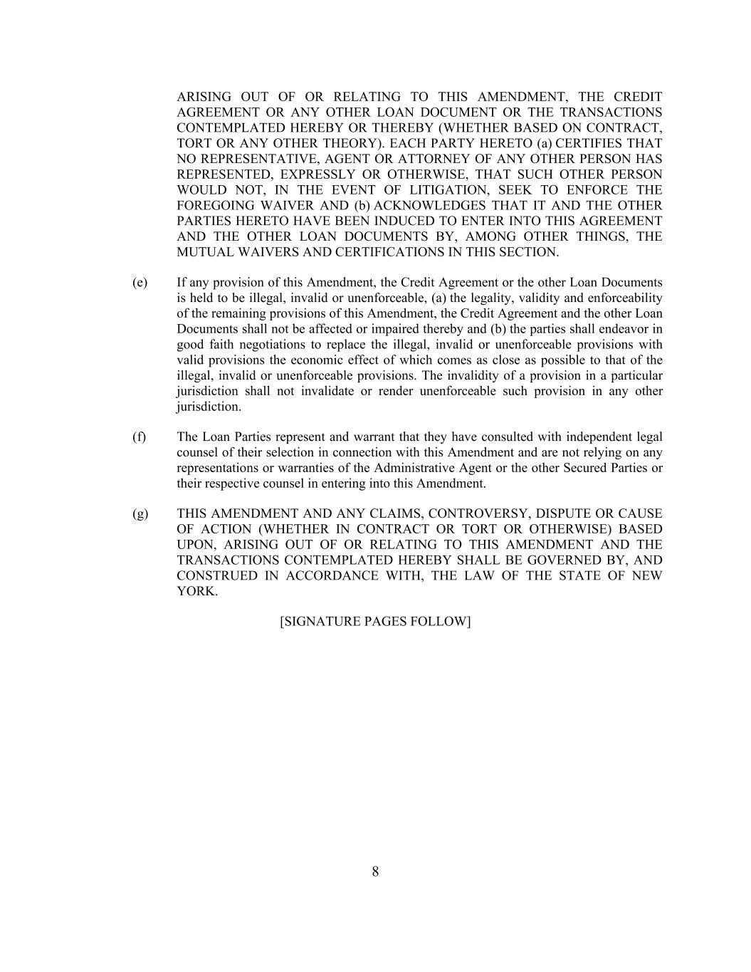 8 ARISING OUT OF OR RELATING TO THIS AMENDMENT, THE CREDIT AGREEMENT OR ANY OTHER LOAN DOCUMENT OR THE TRANSACTIONS CONTEMPLATED HEREBY OR THEREBY (WHETHER BASED ON CONTRACT, TORT OR ANY OTHER THEORY). EACH PARTY HERETO (a) CERTIFIES THAT NO REPRESENTATIVE, AGENT OR ATTORNEY OF ANY OTHER PERSON HAS REPRESENTED, EXPRESSLY OR OTHERWISE, THAT SUCH OTHER PERSON WOULD NOT, IN THE EVENT OF LITIGATION, SEEK TO ENFORCE THE FOREGOING WAIVER AND (b) ACKNOWLEDGES THAT IT AND THE OTHER PARTIES HERETO HAVE BEEN INDUCED TO ENTER INTO THIS AGREEMENT AND THE OTHER LOAN DOCUMENTS BY, AMONG OTHER THINGS, THE MUTUAL WAIVERS AND CERTIFICATIONS IN THIS SECTION. (e) If any provision of this Amendment, the Credit Agreement or the other Loan Documents is held to be illegal, invalid or unenforceable, (a) the legality, validity and enforceability of the remaining provisions of this Amendment, the Credit Agreement and the other Loan Documents shall not be affected or impaired thereby and (b) the parties shall endeavor in good faith negotiations to replace the illegal, invalid or unenforceable provisions with valid provisions the economic effect of which comes as close as possible to that of the illegal, invalid or unenforceable provisions. The invalidity of a provision in a particular jurisdiction shall not invalidate or render unenforceable such provision in any other jurisdiction. (f) The Loan Parties represent and warrant that they have consulted with independent legal counsel of their selection in connection with this Amendment and are not relying on any representations or warranties of the Administrative Agent or the other Secured Parties or their respective counsel in entering into this Amendment. (g) THIS AMENDMENT AND ANY CLAIMS, CONTROVERSY, DISPUTE OR CAUSE OF ACTION (WHETHER IN CONTRACT OR TORT OR OTHERWISE) BASED UPON, ARISING OUT OF OR RELATING TO THIS AMENDMENT AND THE TRANSACTIONS CONTEMPLATED HEREBY SHALL BE GOVERNED BY, AND CONSTRUED IN ACCORDANCE WITH, THE LAW OF THE STATE OF NEW YORK. [SIGNATURE PAGES FOLLOW]
