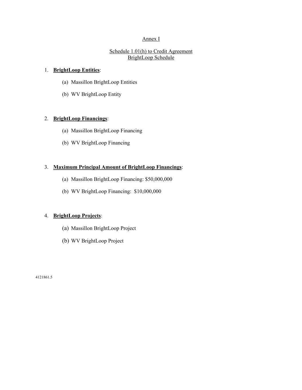 Annex I Schedule 1.01(h) to Credit Agreement BrightLoop Schedule 1. BrightLoop Entities: (a) Massillon BrightLoop Entities (b) WV BrightLoop Entity 2. BrightLoop Financings: (a) Massillon BrightLoop Financing (b) WV BrightLoop Financing 3. Maximum Principal Amount of BrightLoop Financings: (a) Massillon BrightLoop Financing: $50,000,000 (b) WV BrightLoop Financing: $10,000,000 4. BrightLoop Projects: (a) Massillon BrightLoop Project (b) WV BrightLoop Project 4121861.5