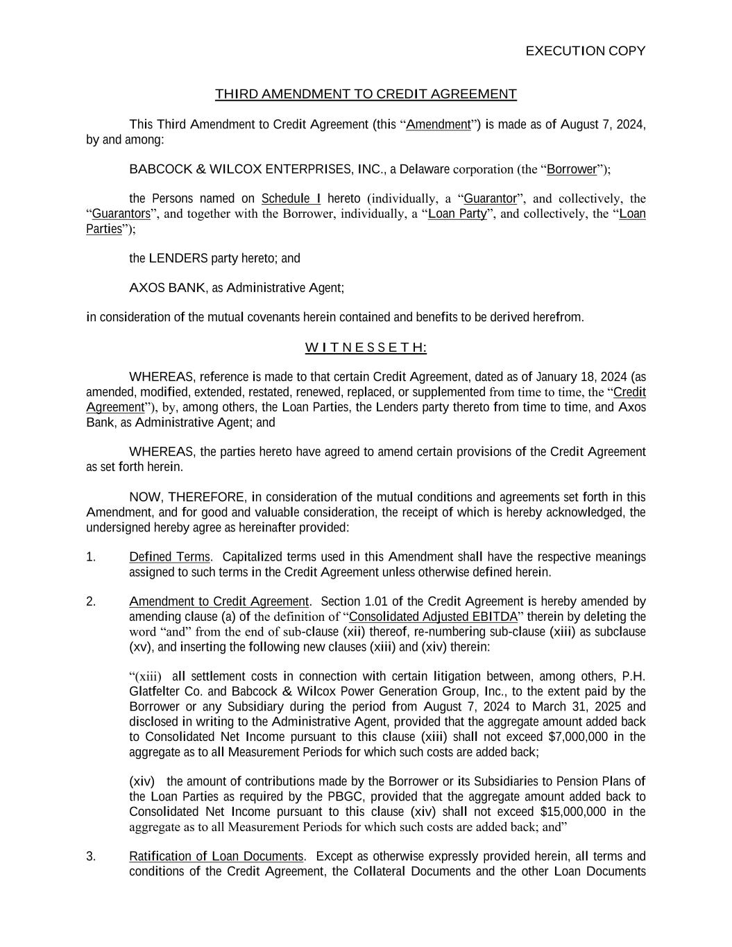 EXECUTION COPY THIRD AMENDMENT TO CREDIT AGREEMENT This Third Amendment to Credit Agreement (this “Amendment”) is made as of August 7, 2024, by and among: BABCOCK & WILCOX ENTERPRISES, INC., a Delaware corporation (the “Borrower”); the Persons named on Schedule I hereto (individually, a “Guarantor”, and collectively, the “Guarantors”, and together with the Borrower, individually, a “Loan Party”, and collectively, the “Loan Parties”); the LENDERS party hereto; and AXOS BANK, as Administrative Agent; in consideration of the mutual covenants herein contained and benefits to be derived herefrom. W I T N E S S E T H: WHEREAS, reference is made to that certain Credit Agreement, dated as of January 18, 2024 (as amended, modified, extended, restated, renewed, replaced, or supplemented from time to time, the “Credit Agreement”), by, among others, the Loan Parties, the Lenders party thereto from time to time, and Axos Bank, as Administrative Agent; and WHEREAS, the parties hereto have agreed to amend certain provisions of the Credit Agreement as set forth herein. NOW, THEREFORE, in consideration of the mutual conditions and agreements set forth in this Amendment, and for good and valuable consideration, the receipt of which is hereby acknowledged, the undersigned hereby agree as hereinafter provided: 1. Defined Terms. Capitalized terms used in this Amendment shall have the respective meanings assigned to such terms in the Credit Agreement unless otherwise defined herein. 2. Amendment to Credit Agreement. Section 1.01 of the Credit Agreement is hereby amended by amending clause (a) of the definition of “Consolidated Adjusted EBITDA” therein by deleting the word “and” from the end of sub-clause (xii) thereof, re-numbering sub-clause (xiii) as subclause (xv), and inserting the following new clauses (xiii) and (xiv) therein: “(xiii) all settlement costs in connection with certain litigation between, among others, P.H. Glatfelter Co. and Babcock & Wilcox Power Generation Group, Inc., to the extent paid by the Borrower or any Subsidiary during the period from August 7, 2024 to March 31, 2025 and disclosed in writing to the Administrative Agent, provided that the aggregate amount added back to Consolidated Net Income pursuant to this clause (xiii) shall not exceed $7,000,000 in the aggregate as to all Measurement Periods for which such costs are added back; (xiv) the amount of contributions made by the Borrower or its Subsidiaries to Pension Plans of the Loan Parties as required by the PBGC, provided that the aggregate amount added back to Consolidated Net Income pursuant to this clause (xiv) shall not exceed $15,000,000 in the aggregate as to all Measurement Periods for which such costs are added back; and” 3. Ratification of Loan Documents. Except as otherwise expressly provided herein, all terms and conditions of the Credit Agreement, the Collateral Documents and the other Loan Documents