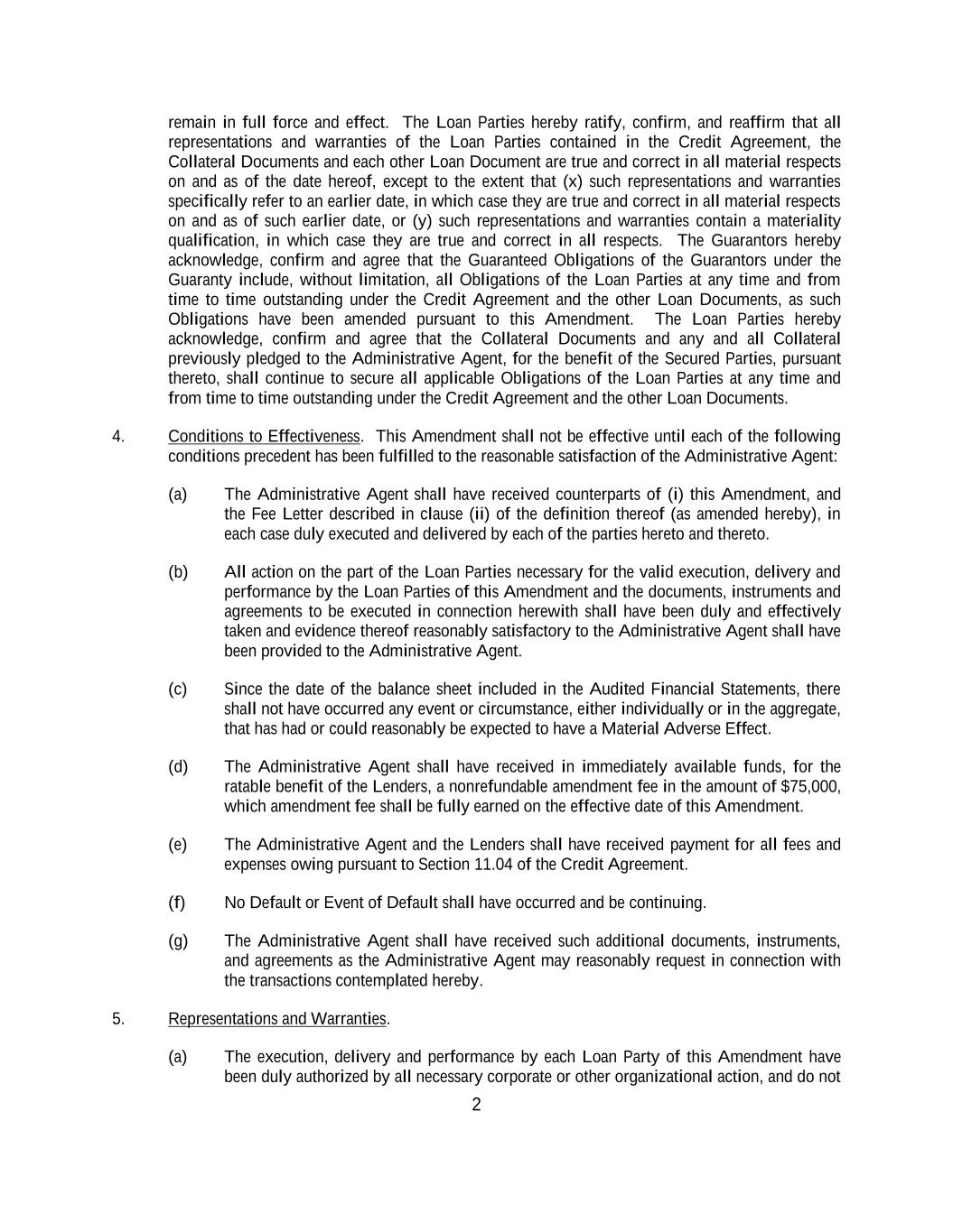 2 remain in full force and effect. The Loan Parties hereby ratify, confirm, and reaffirm that all representations and warranties of the Loan Parties contained in the Credit Agreement, the Collateral Documents and each other Loan Document are true and correct in all material respects on and as of the date hereof, except to the extent that (x) such representations and warranties specifically refer to an earlier date, in which case they are true and correct in all material respects on and as of such earlier date, or (y) such representations and warranties contain a materiality qualification, in which case they are true and correct in all respects. The Guarantors hereby acknowledge, confirm and agree that the Guaranteed Obligations of the Guarantors under the Guaranty include, without limitation, all Obligations of the Loan Parties at any time and from time to time outstanding under the Credit Agreement and the other Loan Documents, as such Obligations have been amended pursuant to this Amendment. The Loan Parties hereby acknowledge, confirm and agree that the Collateral Documents and any and all Collateral previously pledged to the Administrative Agent, for the benefit of the Secured Parties, pursuant thereto, shall continue to secure all applicable Obligations of the Loan Parties at any time and from time to time outstanding under the Credit Agreement and the other Loan Documents. 4. Conditions to Effectiveness. This Amendment shall not be effective until each of the following conditions precedent has been fulfilled to the reasonable satisfaction of the Administrative Agent: (a) The Administrative Agent shall have received counterparts of (i) this Amendment, and the Fee Letter described in clause (ii) of the definition thereof (as amended hereby), in each case duly executed and delivered by each of the parties hereto and thereto. (b) All action on the part of the Loan Parties necessary for the valid execution, delivery and performance by the Loan Parties of this Amendment and the documents, instruments and agreements to be executed in connection herewith shall have been duly and effectively taken and evidence thereof reasonably satisfactory to the Administrative Agent shall have been provided to the Administrative Agent. (c) Since the date of the balance sheet included in the Audited Financial Statements, there shall not have occurred any event or circumstance, either individually or in the aggregate, that has had or could reasonably be expected to have a Material Adverse Effect. (d) The Administrative Agent shall have received in immediately available funds, for the ratable benefit of the Lenders, a nonrefundable amendment fee in the amount of $75,000, which amendment fee shall be fully earned on the effective date of this Amendment. (e) The Administrative Agent and the Lenders shall have received payment for all fees and expenses owing pursuant to Section 11.04 of the Credit Agreement. (f) No Default or Event of Default shall have occurred and be continuing. (g) The Administrative Agent shall have received such additional documents, instruments, and agreements as the Administrative Agent may reasonably request in connection with the transactions contemplated hereby. 5. Representations and Warranties. (a) The execution, delivery and performance by each Loan Party of this Amendment have been duly authorized by all necessary corporate or other organizational action, and do not
