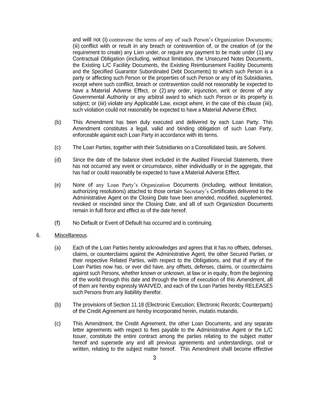 3 and will not (i) contravene the terms of any of such Person’s Organization Documents; (ii) conflict with or result in any breach or contravention of, or the creation of (or the requirement to create) any Lien under, or require any payment to be made under (1) any Contractual Obligation (including, without limitation, the Unsecured Notes Documents, the Existing L/C Facility Documents, the Existing Reimbursement Facility Documents and the Specified Guarantor Subordinated Debt Documents) to which such Person is a party or affecting such Person or the properties of such Person or any of its Subsidiaries, except where such conflict, breach or contravention could not reasonably be expected to have a Material Adverse Effect, or (2) any order, injunction, writ or decree of any Governmental Authority or any arbitral award to which such Person or its property is subject; or (iii) violate any Applicable Law, except where, in the case of this clause (iii), such violation could not reasonably be expected to have a Material Adverse Effect. (b) This Amendment has been duly executed and delivered by each Loan Party. This Amendment constitutes a legal, valid and binding obligation of such Loan Party, enforceable against each Loan Party in accordance with its terms. (c) The Loan Parties, together with their Subsidiaries on a Consolidated basis, are Solvent. (d) Since the date of the balance sheet included in the Audited Financial Statements, there has not occurred any event or circumstance, either individually or in the aggregate, that has had or could reasonably be expected to have a Material Adverse Effect. (e) None of any Loan Party’s Organization Documents (including, without limitation, authorizing resolutions) attached to those certain Secretary’s Certificates delivered to the Administrative Agent on the Closing Date have been amended, modified, supplemented, revoked or rescinded since the Closing Date, and all of such Organization Documents remain in full force and effect as of the date hereof. (f) No Default or Event of Default has occurred and is continuing. 6. Miscellaneous. (a) Each of the Loan Parties hereby acknowledges and agrees that it has no offsets, defenses, claims, or counterclaims against the Administrative Agent, the other Secured Parties, or their respective Related Parties, with respect to the Obligations, and that if any of the Loan Parties now has, or ever did have, any offsets, defenses, claims, or counterclaims against such Persons, whether known or unknown, at law or in equity, from the beginning of the world through this date and through the time of execution of this Amendment, all of them are hereby expressly WAIVED, and each of the Loan Parties hereby RELEASES such Persons from any liability therefor. (b) The provisions of Section 11.18 (Electronic Execution; Electronic Records; Counterparts) of the Credit Agreement are hereby incorporated herein, mutatis mutandis. (c) This Amendment, the Credit Agreement, the other Loan Documents, and any separate letter agreements with respect to fees payable to the Administrative Agent or the L/C Issuer, constitute the entire contract among the parties relating to the subject matter hereof and supersede any and all previous agreements and understandings, oral or written, relating to the subject matter hereof. This Amendment shall become effective